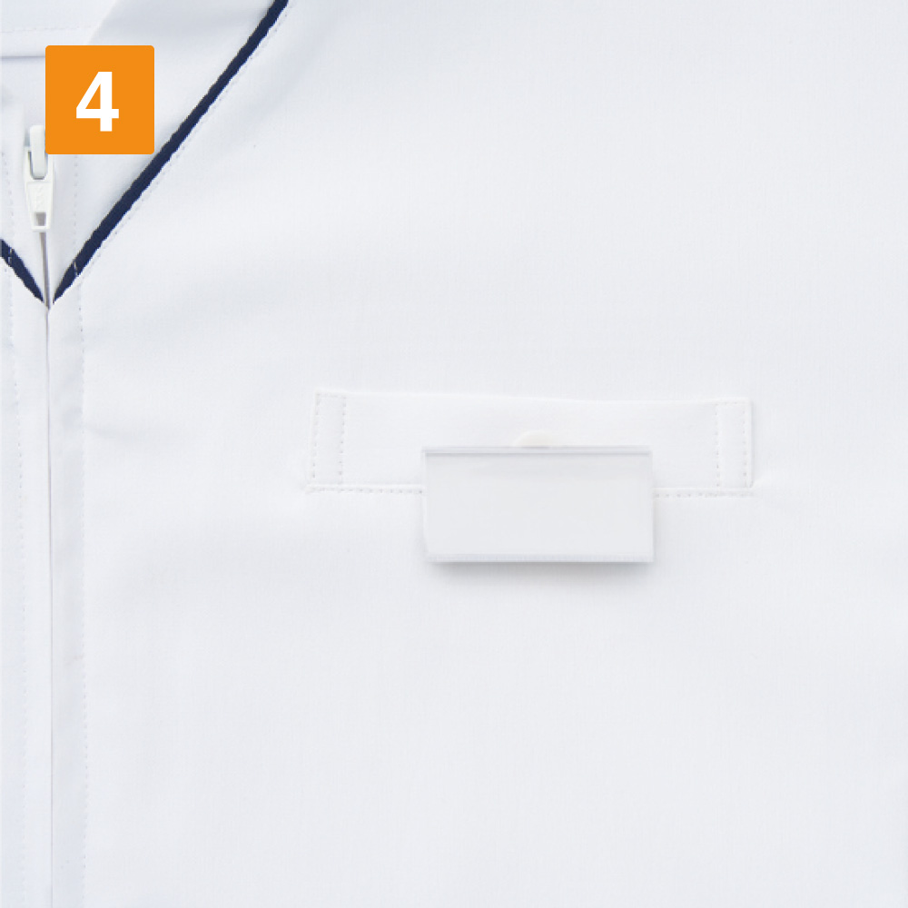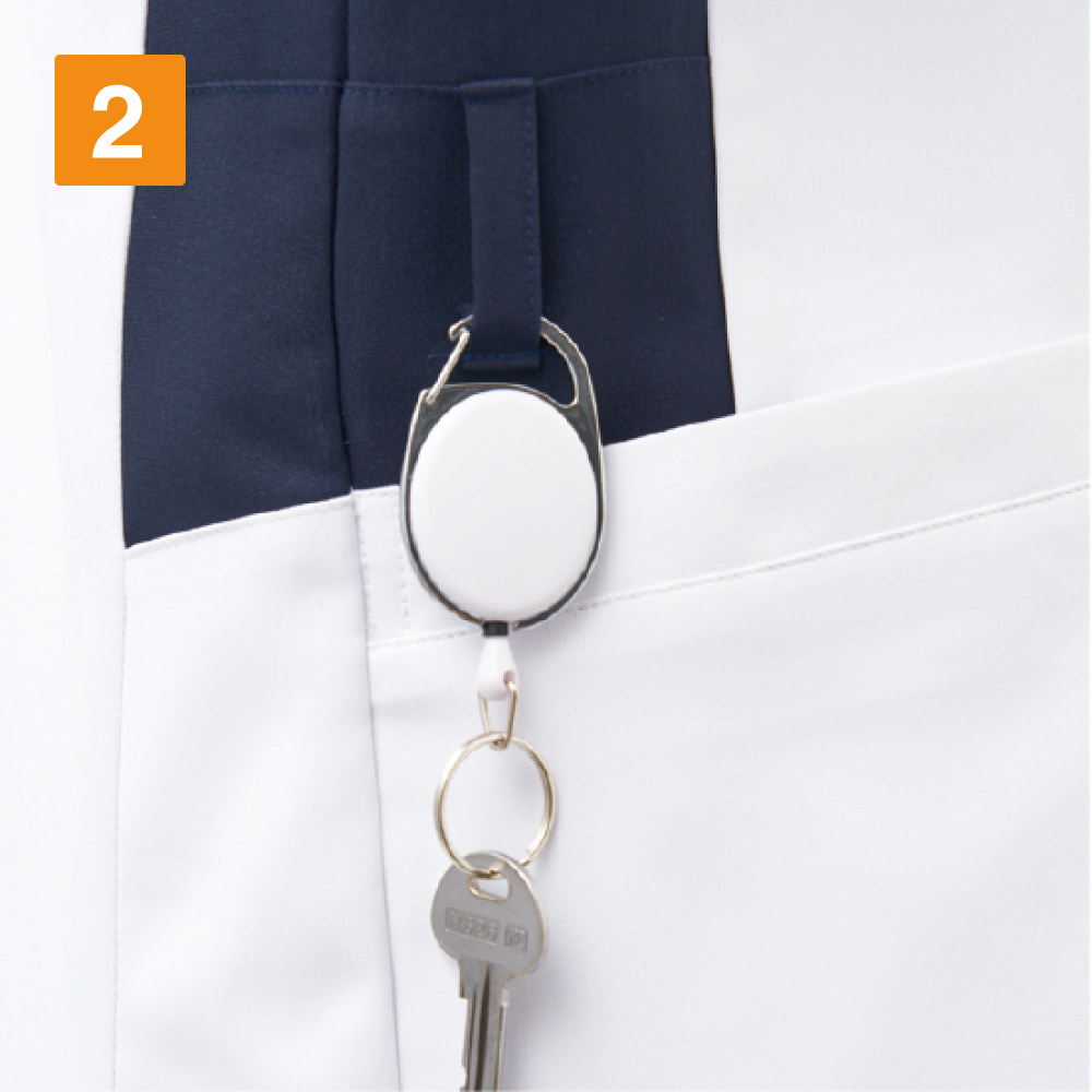 お仕事を支える収納面のディテールも優れたスクラブです。左胸と両腰にポケットが配置されており、持ち物をすっきり収納可能です。また、両脇ポケットは内側に仕切りポケットもついているので、ポケット内がごちゃつくことなく、効率のいい作業をアシストしてくれます。また、胸ポケット前面には名札をつけておけるクリップ専用ポケットが。名札がポケット内の物と干渉せず、物の出し入れがスムーズに行えます。右脇には、カギなど使用頻度の高い物を提げておけるループが配置されており、とても便利にお使いいただけます。