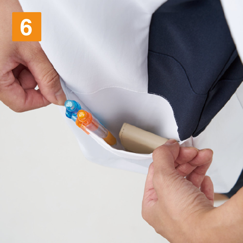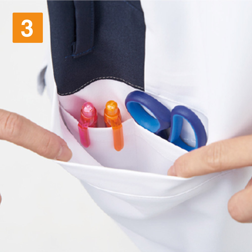 | □ポケット二重構造(左右) □名札専用ポケット □両脇スリット |