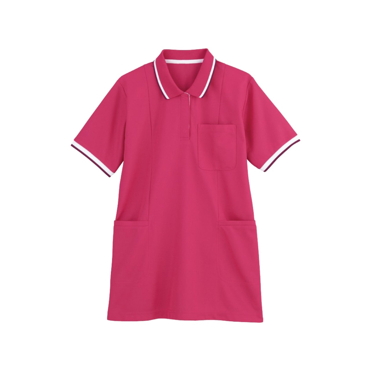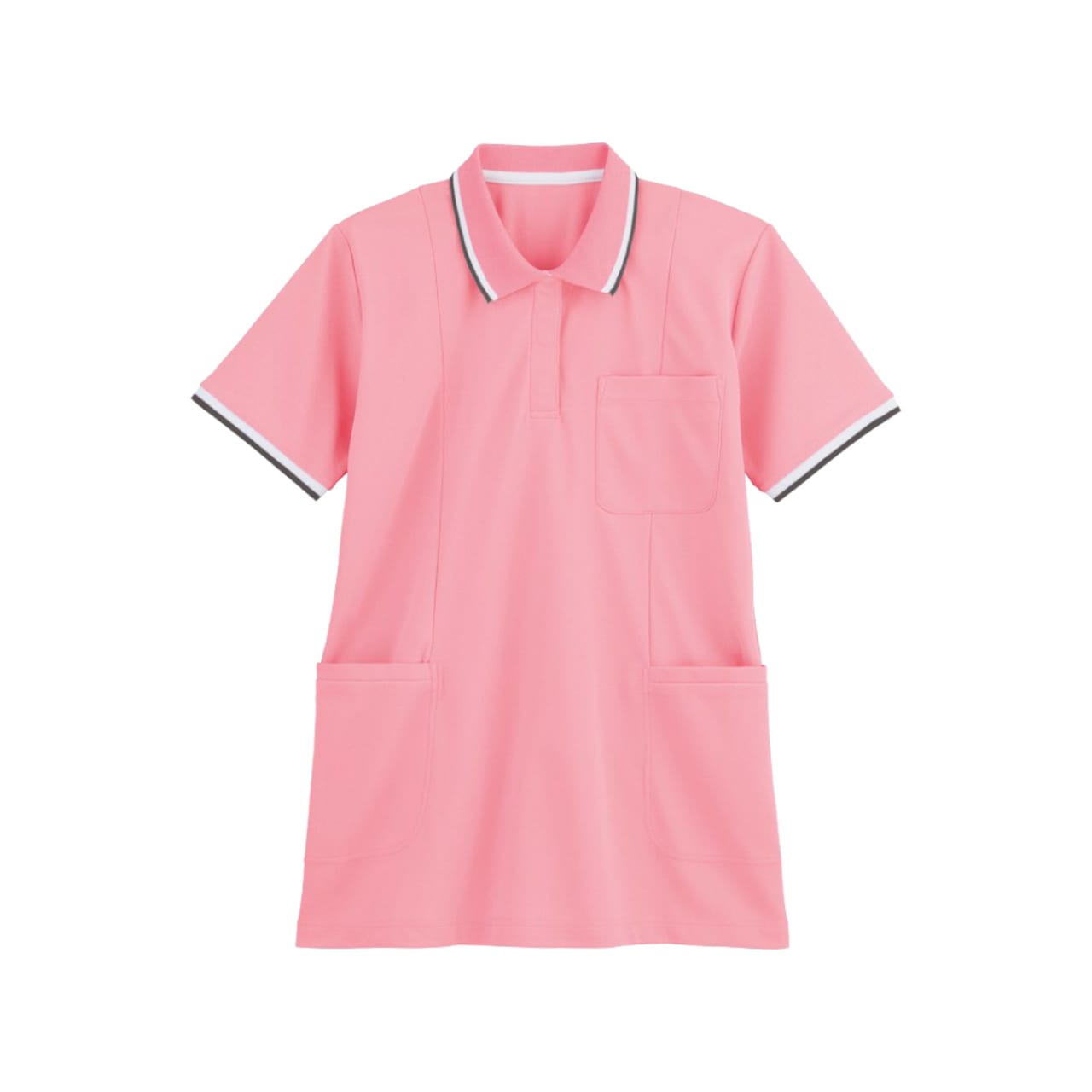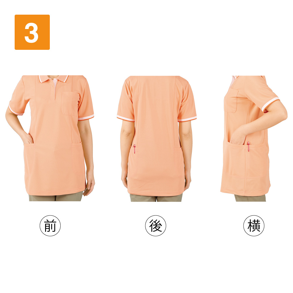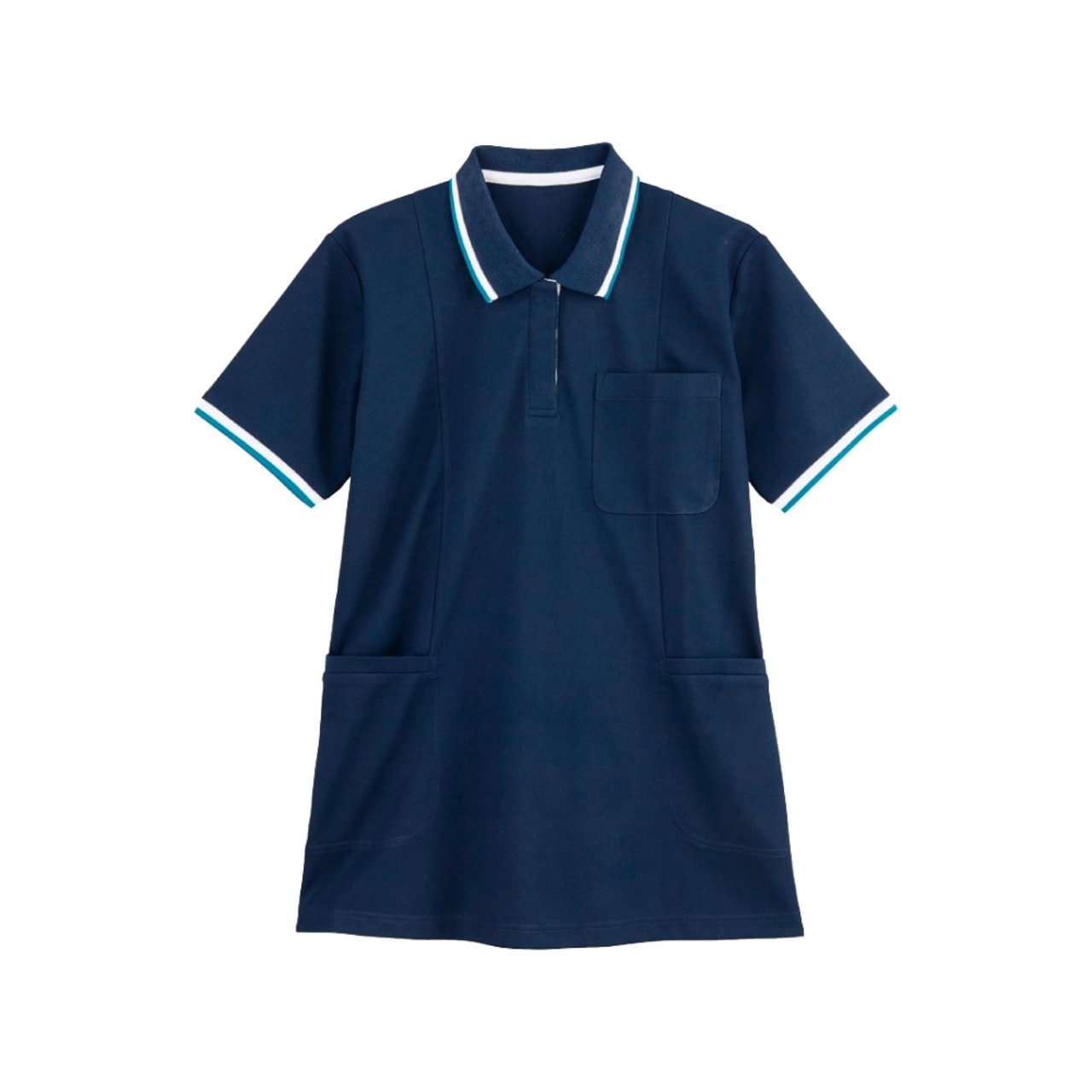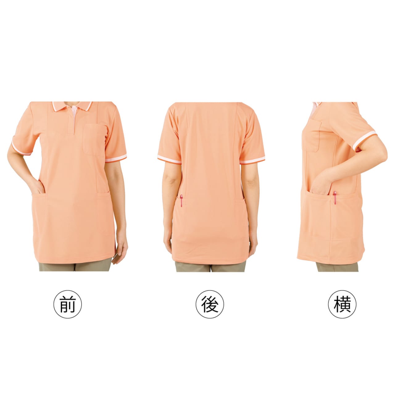 シンプルな定番デザインが人気のポロシャツです。特徴はヒップまでしっかりカバーできるロング丈。体型カバーできるだけでなく、前屈などの姿勢でも背中の露出を防ぎます。また、ロング丈を生かした、胸ポケットに加え両脇の前後に計4つの脇ポケットを備えた超大容量収納もポイント。何かと増えがちな小物もすっきりと収納可能です。襟と袖口のリブにはアクセントカラーが入り、スポーティな印象をプラス。はつらつとした元気な印象を与えてくれる一着になっています。