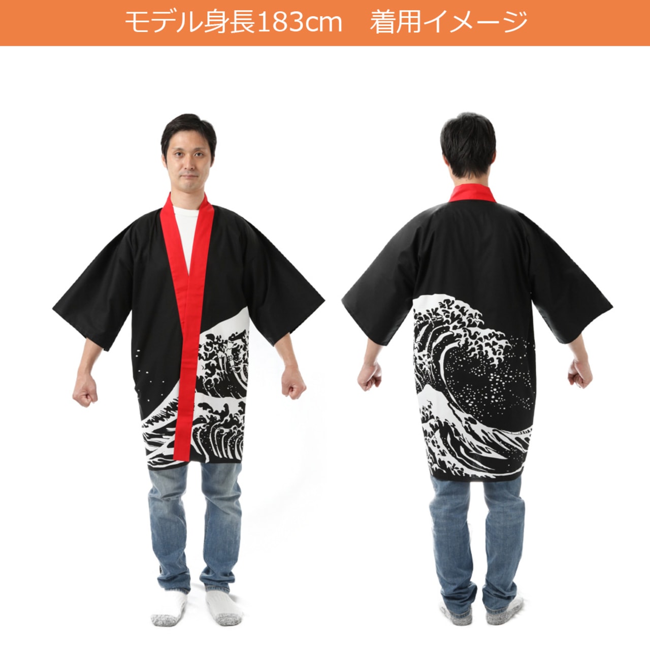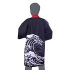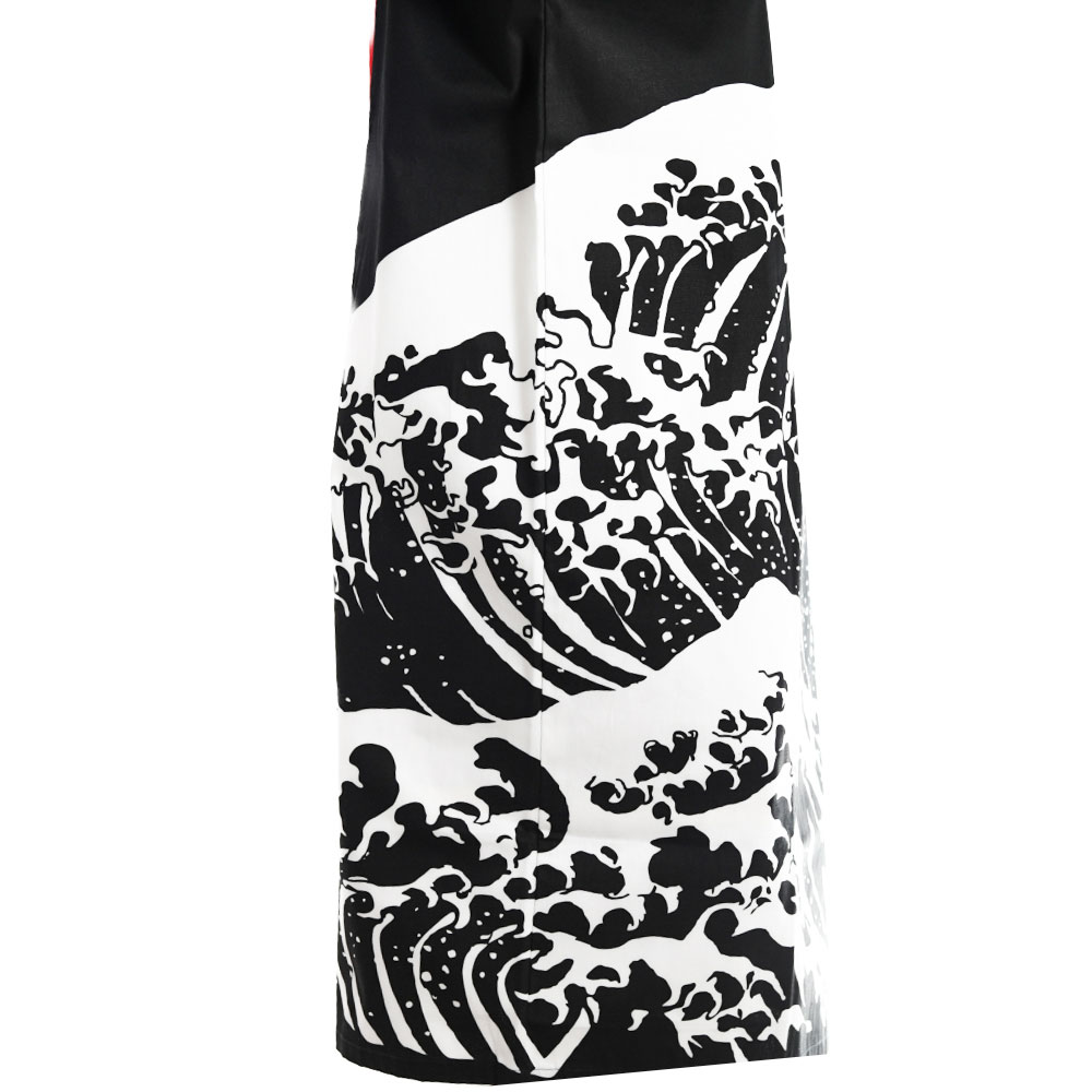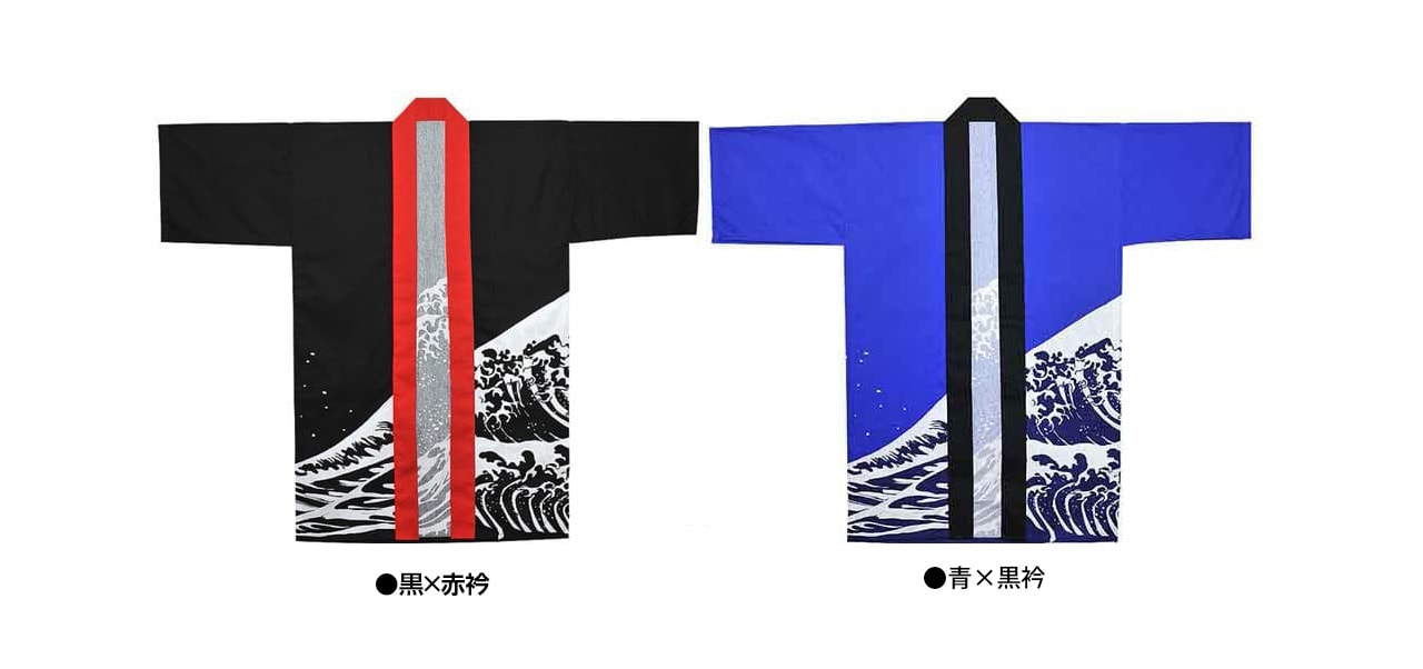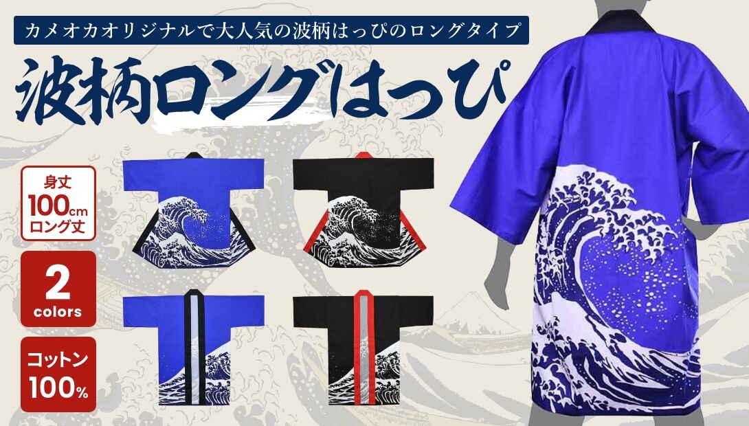 はっぴでは人気のある波柄のロングタイプです。こちらの波柄はカメオカオリジナルのデザインで他社では販売をしておりません。カメオカ独自に大量生産をし在庫をもって販売をしているので高くなりがちなロングタイプのはっぴも激安でご提供が可能となっております。値段が安くても、生地はコットン100%を使用しており、染色方法もひと手間かかる反応染を採用しており品質には自信がございます。また、背中の波柄の位置が絶妙に設計されており、背中にプリント入れても入れなくてもカッコ良く決まります。