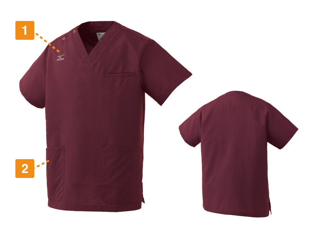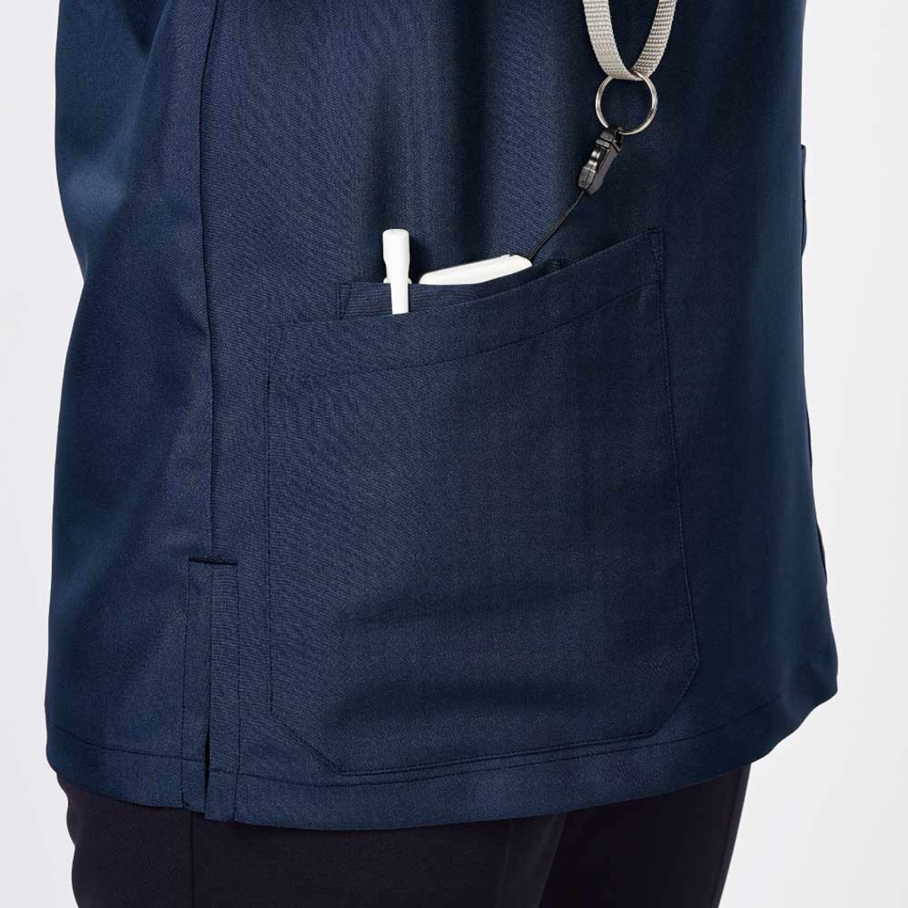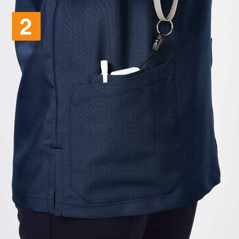 医療現場での着用を想定した高機能な一着です。胸のポケットと両脇に2ヵ所のポケットを備え、持ち物をすっきりと収納いただけます。右腰ポケットは、中に小物用の仕切りポケットが付属しており、PHSなど散らばりがちなものも整理して携帯できます。また、衛生面では、制菌加工、抗ウイルス加工、抗カビ加工の3分野でSEKマークを取得しているのが特徴です。衛生面で高い水準が求められる環境でも、安全に着用いただけるスクラブになっています。