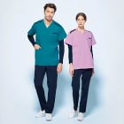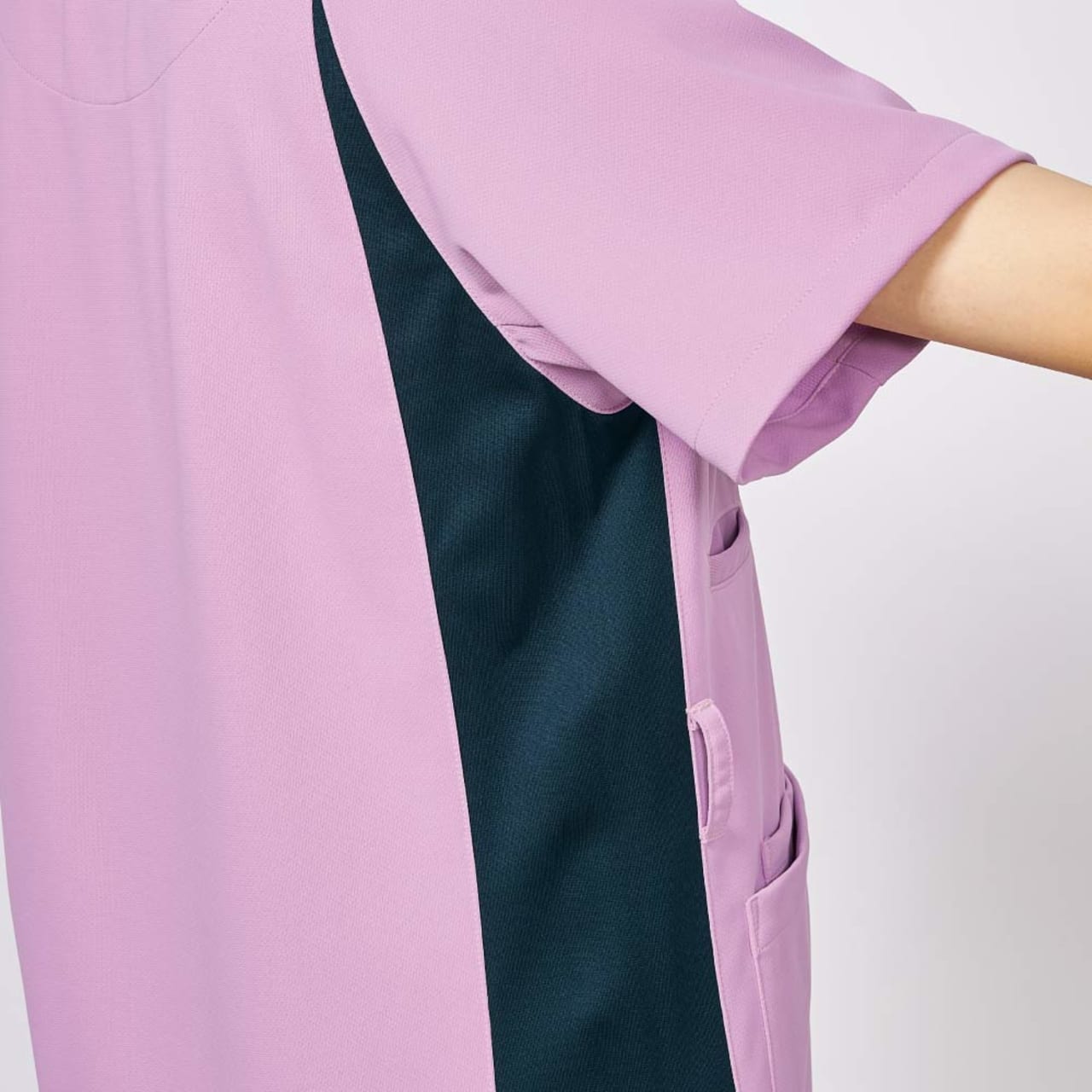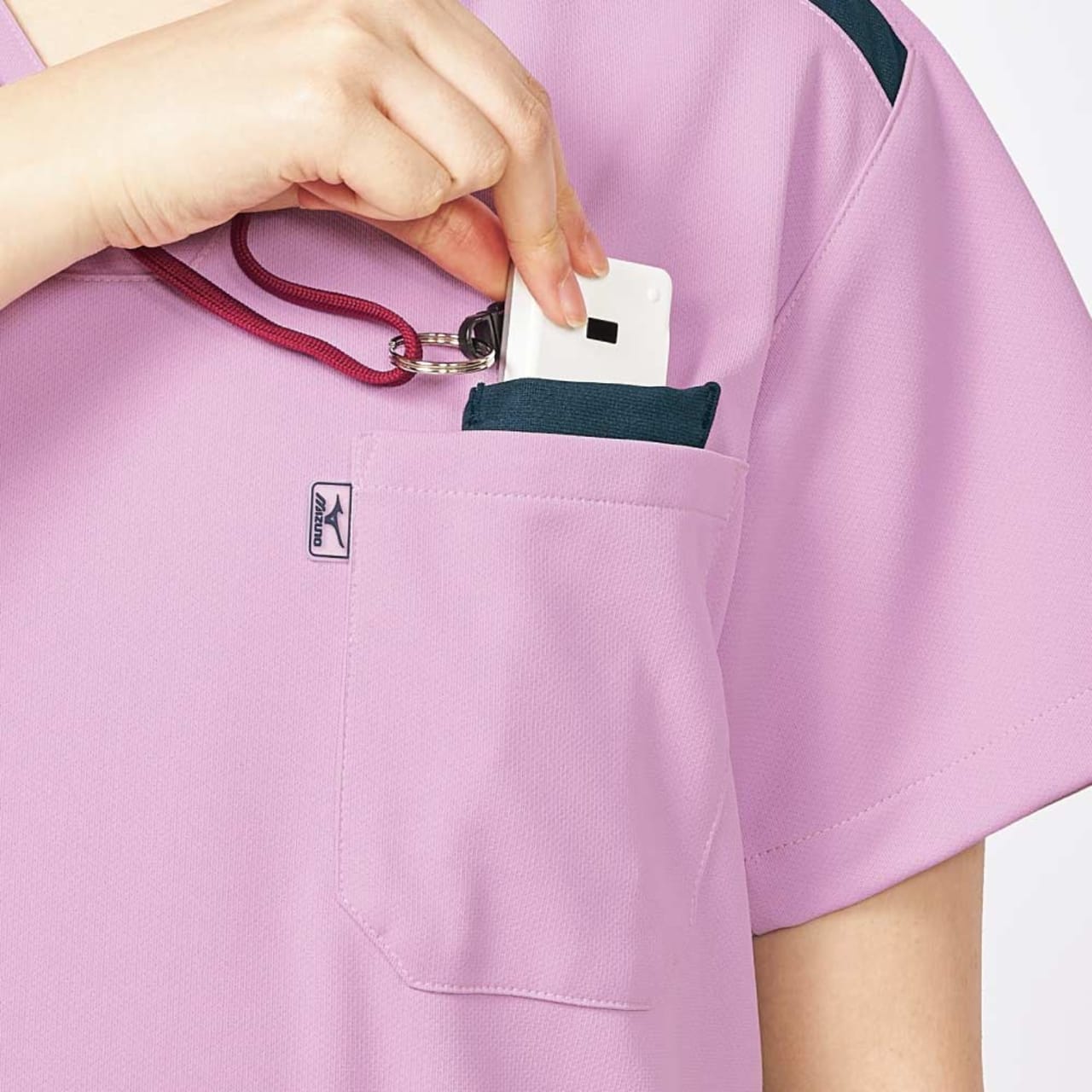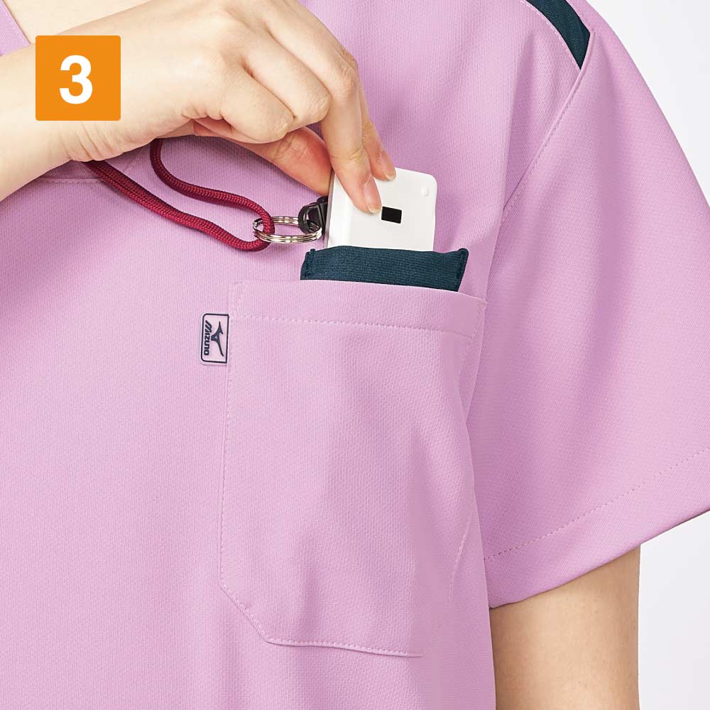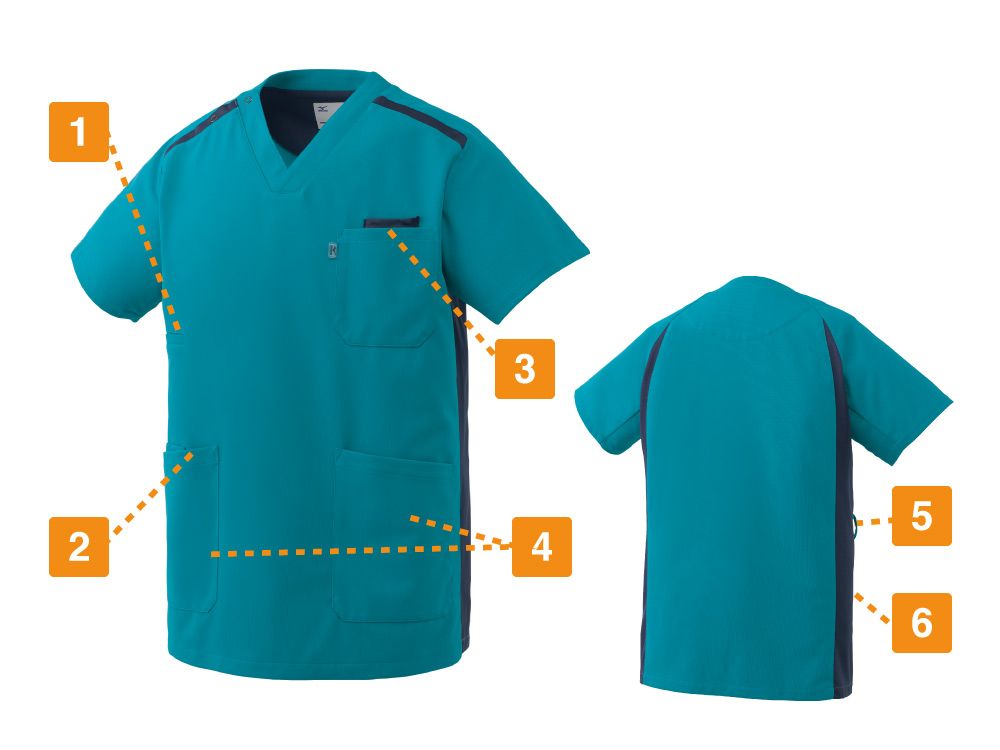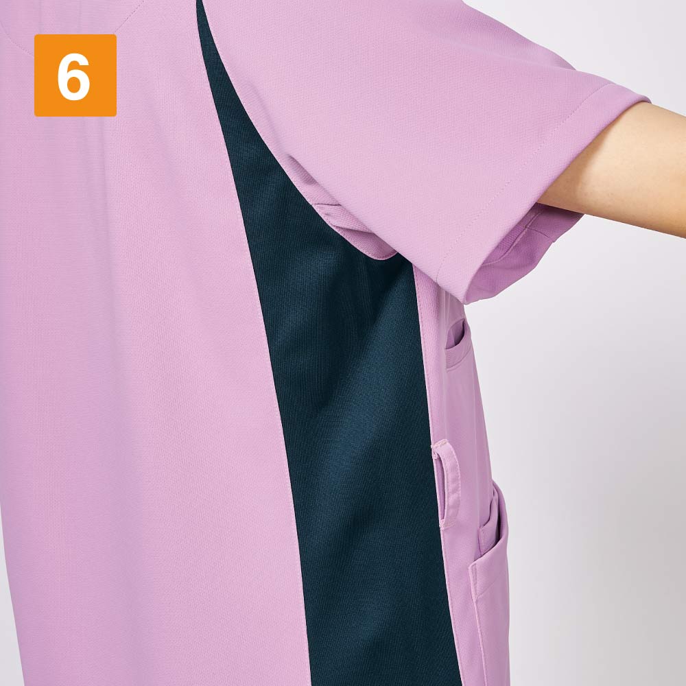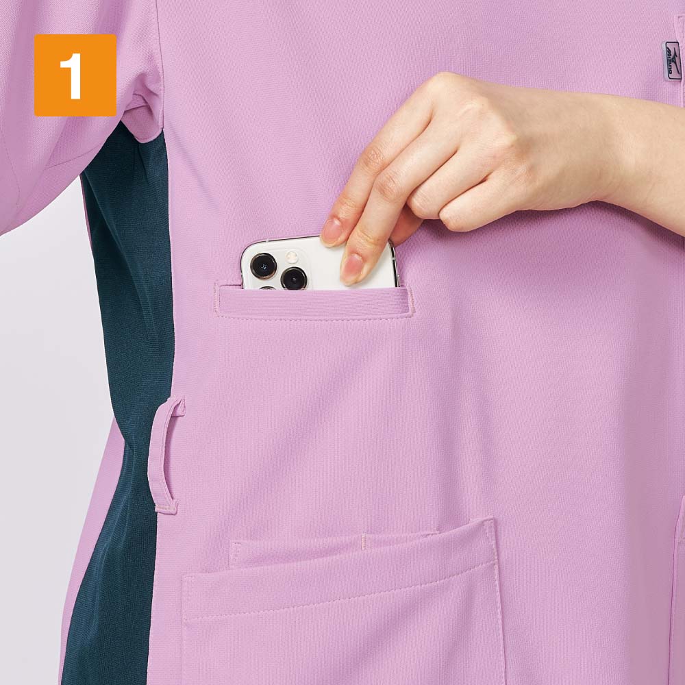 生地の持つストレッチ性が、動きやすく快適なお仕事をサポートしてくれる一着。背面側両サイドにも生地の切り替えが施されており、バックスタイルを美しくすっきりと見せてくれます。両肩部分に施された帯状の生地切り替えはスポーティなアクセントに。また、動きやすいウェア構造を研究した「Mizuno Dynamotion」の設計もポイント。脇下の生地にほどよいゆとりを持たせることで、腕の動きをよりスムーズに。腕の上げ下げといった動きもストレスなく行えます。さらに、高い制菌加工性能を認めるSEKマークが付与されています。衛生面でシビアさが求められる環境でも、安全に着用いただけます。