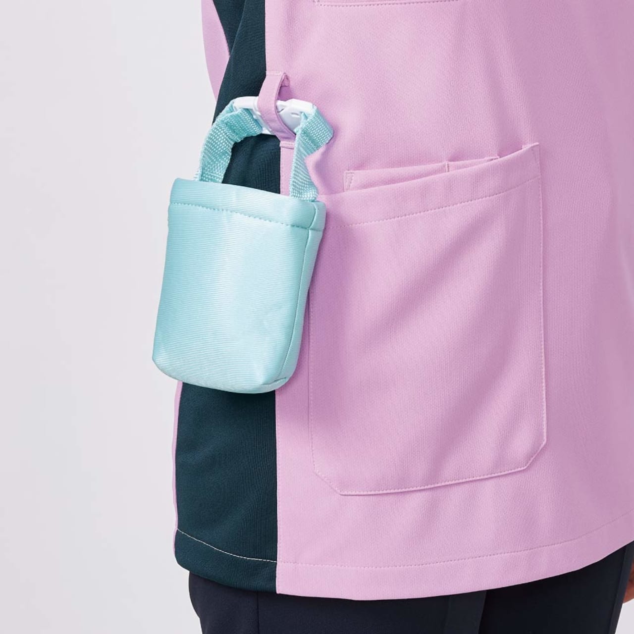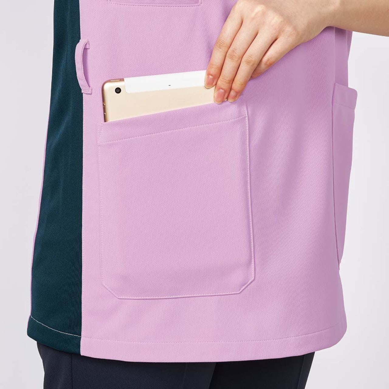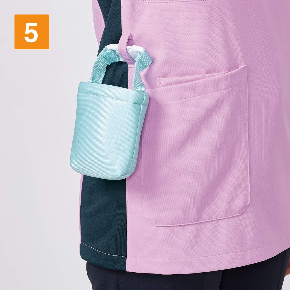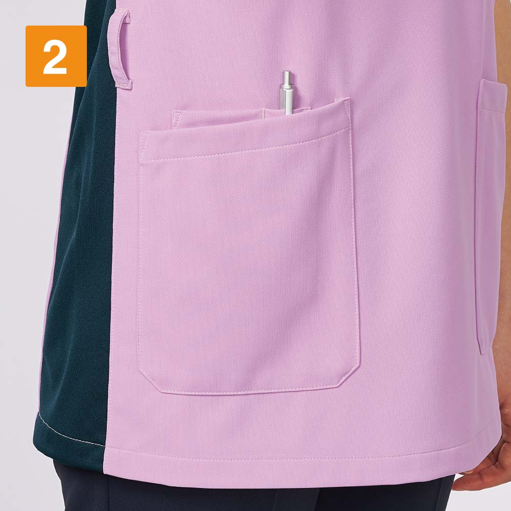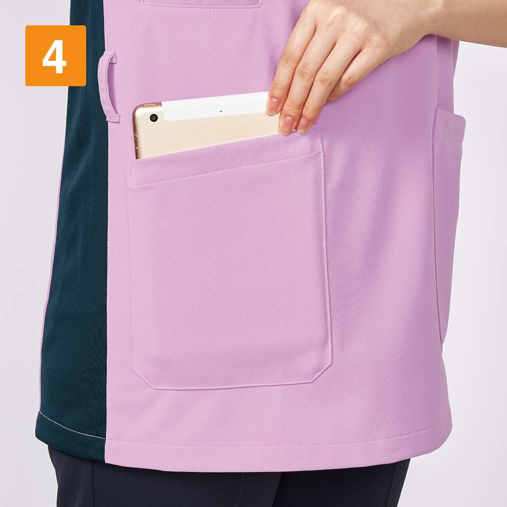 左胸と両脇の3ヶ所のポケットに加えて、右脇にスマホ専用ポケットを備えた充実の収納がポイント。右脇のスマートフォン用ポケットは大きめのスマートフォンも入る大判設計で、取り出しもスムーズに行えます。左胸ポケットは内側にPHS用のポケットが付いているので、取り出しの際他の物と干渉せずノンストレス。また、両脇ポケットは小型タブレットも収納できる大判デザイン。さらに、右腰のウエストループには使用頻度の高い物を提げておけるなど、とことん使い勝手にこだわった一着です。