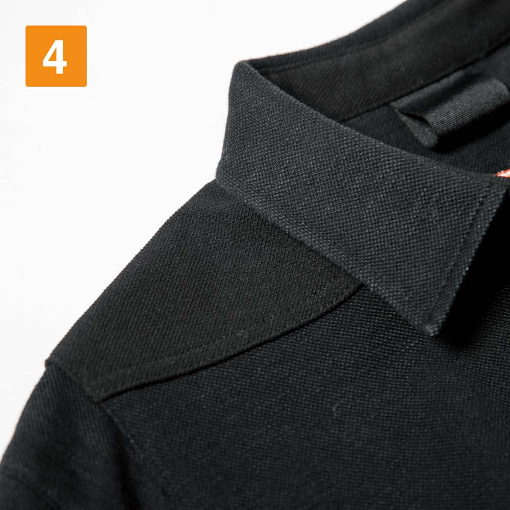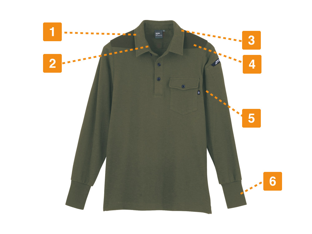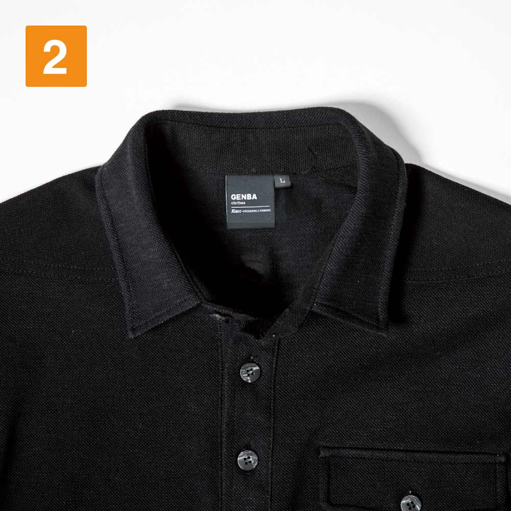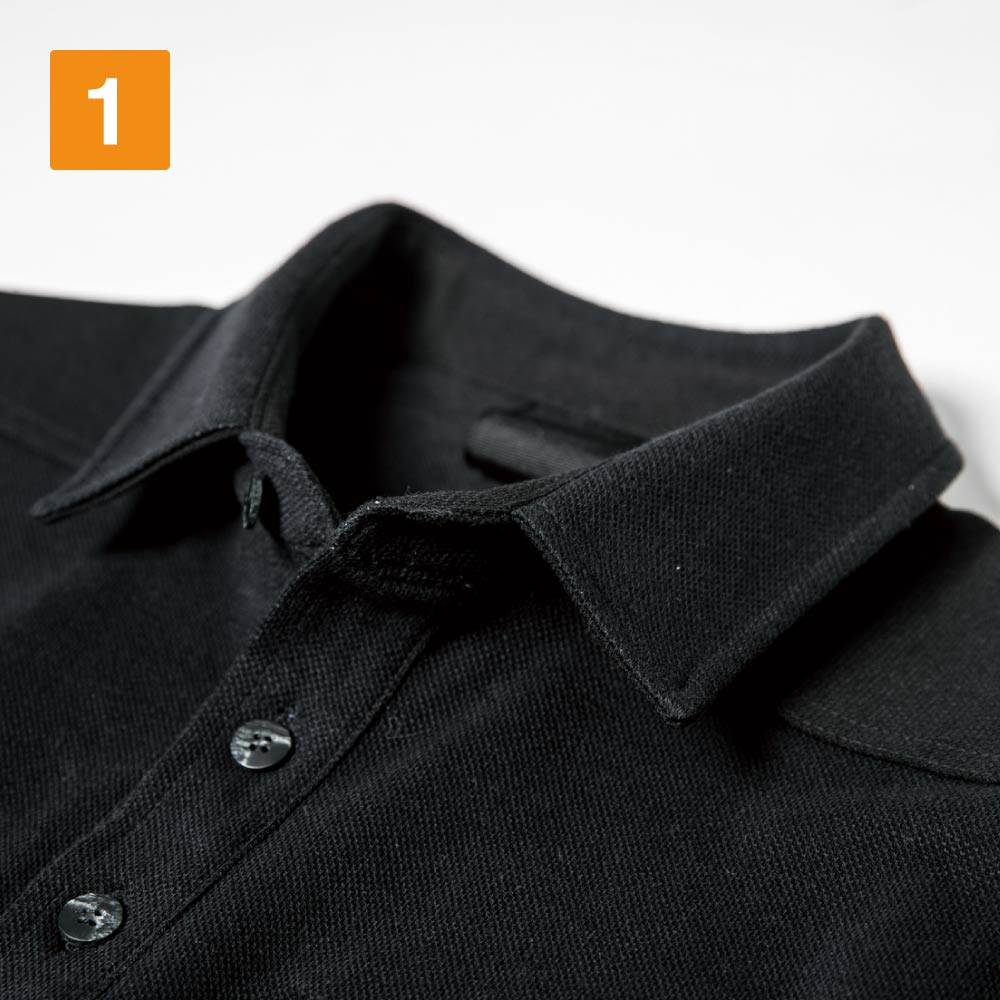 生地の夏らしい爽やかな肌触りでも選ばれている一着。生地の持つカジュアルな質感がかっこいいポロシャツです。襟は台襟仕様とすることで、ほどよいかっちり感をプラス。襟を立てての着用もおしゃれに決まります。長袖は袖口がリブ仕様になっているので手元がもたつかず、袖口の引っかかりを防いで安全な作業をアシスト。袖口がルーズにならないことで、すっきりとしたシルエットに見せてくれます。袖は手首に向けてスリムになるデザインで、安全性を高めるとともにスマートな印象に。