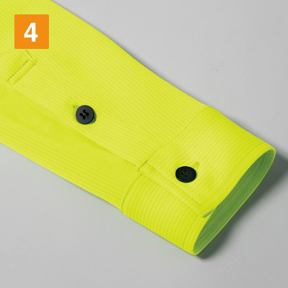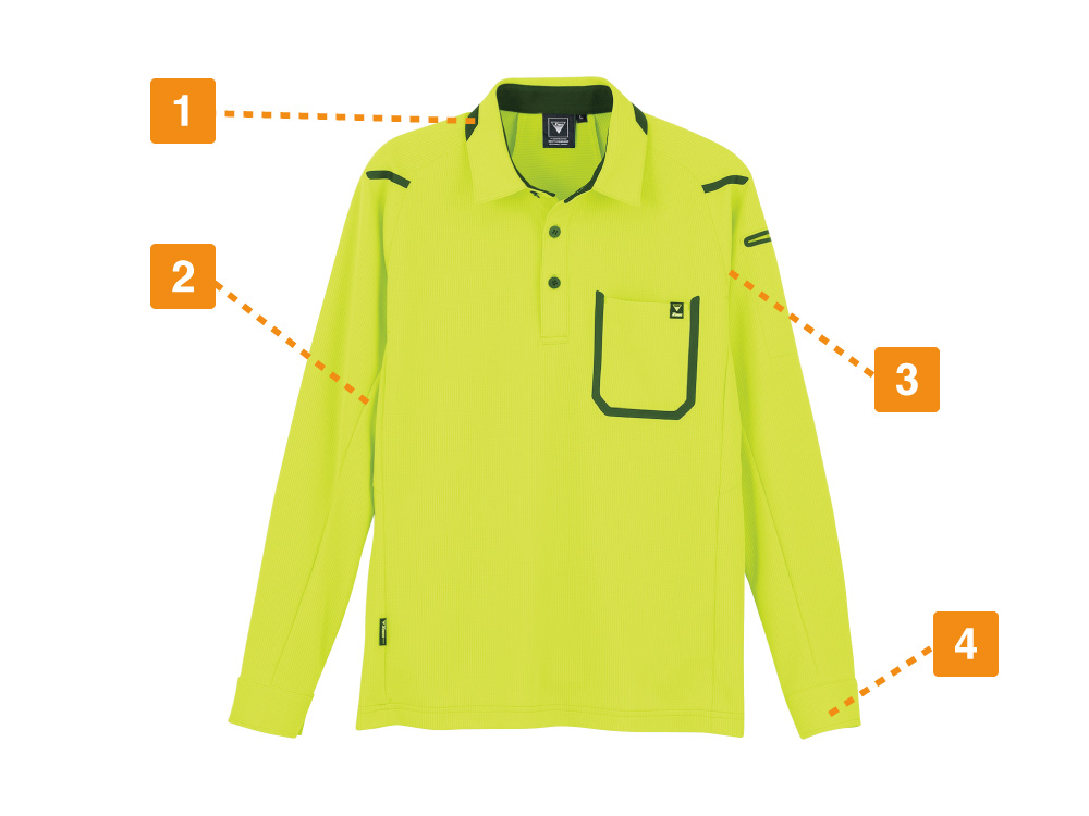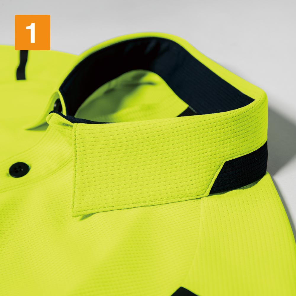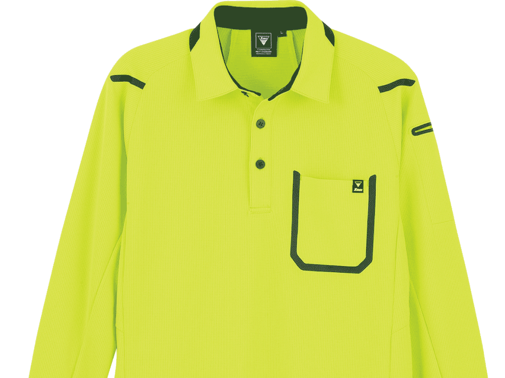 着る方をスタイリッシュに見せてくれる、洗練されたデザインが人気の長袖ポロシャツ。かっこいいだけでなく、ジーベック独自のXEカッティング設計でより動きやすい一着になっています。また、袖口がカフスボタン仕様になっているので、手元にもきちんと感をプラス。腕まくりがしやすいのもポイントです。カラーはモノトーンをはじめ、ビビッドで個性的なカラーまで6色をラインナップ。視認性の高いビビッドカラーは配送業にもおすすめです。