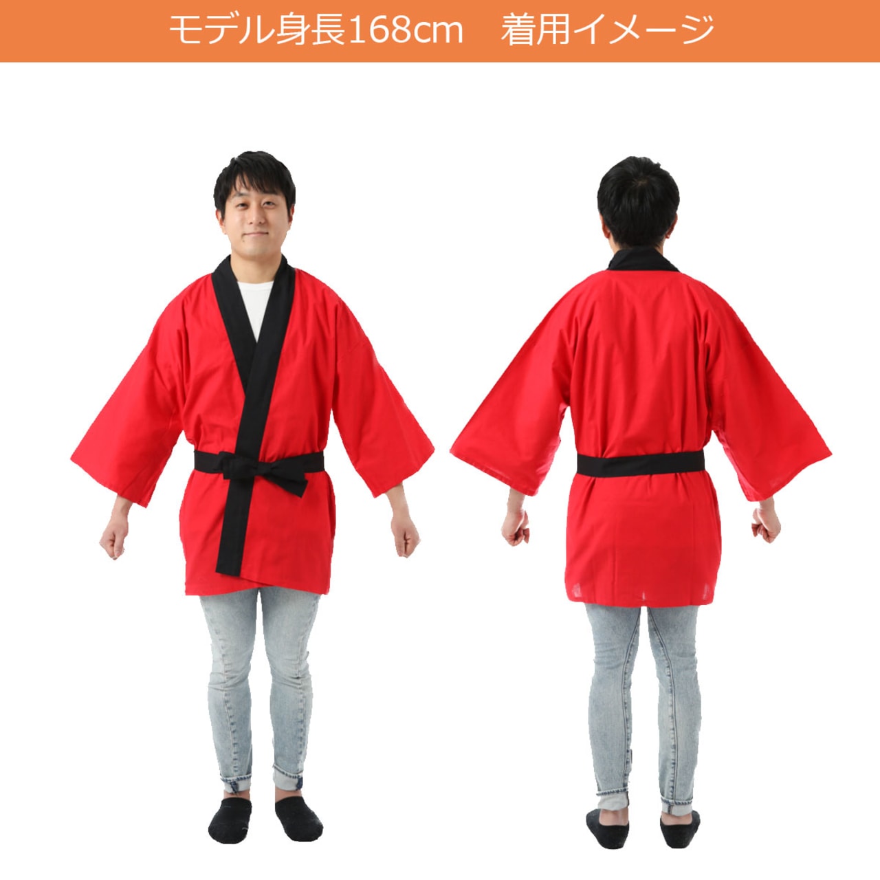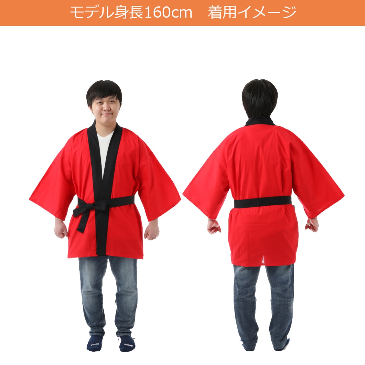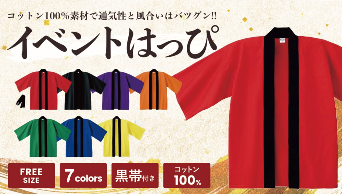 程良い厚みのコットン100%素材の生地を使用したはっぴです。※レッドとイエローのみ黒帯がセットになっています。