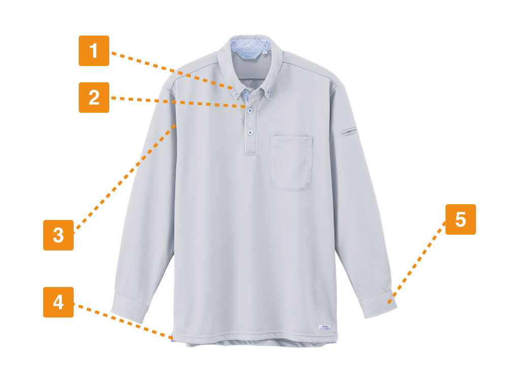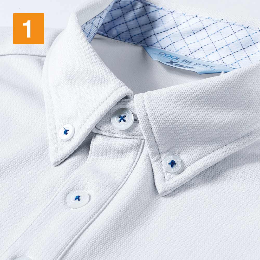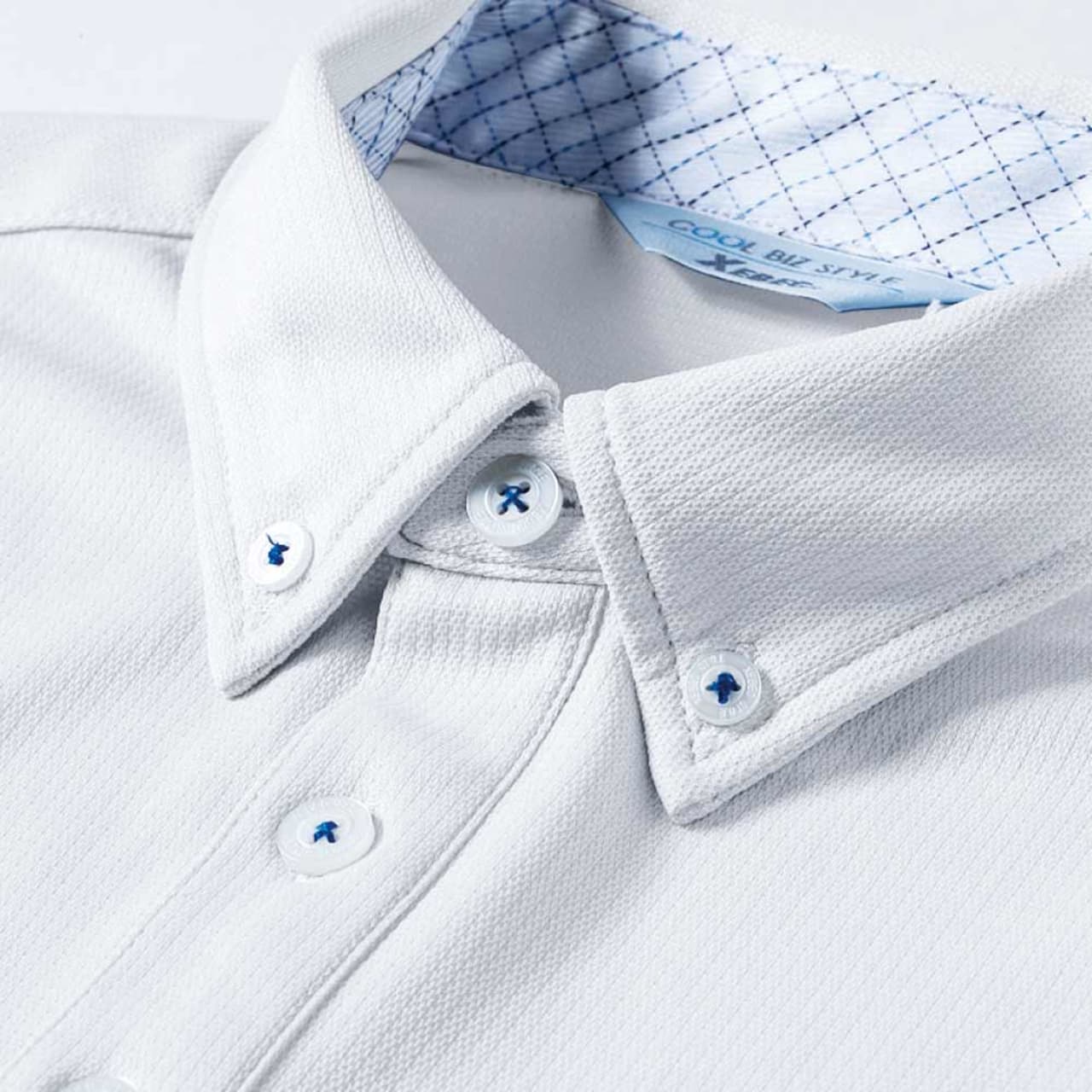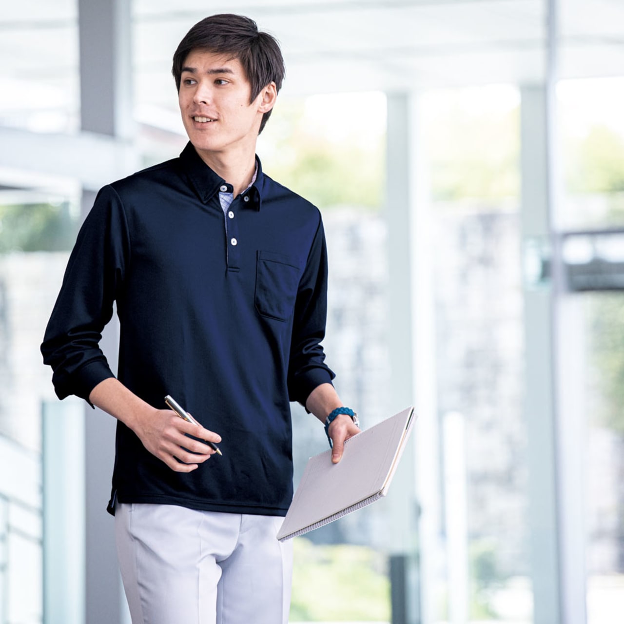 無駄のないシンプルデザインに、優れた機能とディテールをたくさん詰め込んだこだわりの一着です。生地は吸汗性と速乾性に加え通気性も備えており、一度着ると手放せない心地よさがポイント。汗をかく時期やタフなお仕事でも快適に着用いただけます。また、襟元のデザインにも注目のウェア。生地切り替えでおしゃれに仕上げつつ、かっちりとした印象のボタンダウンデザインでビジネスシーンにも映えるルックスに。ポロシャツながらきりりとした印象を与えてくれます。