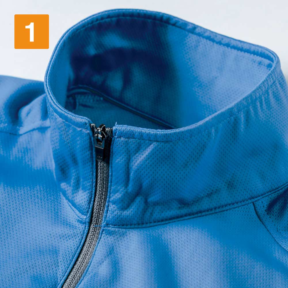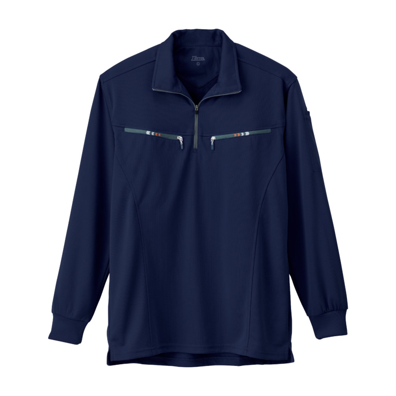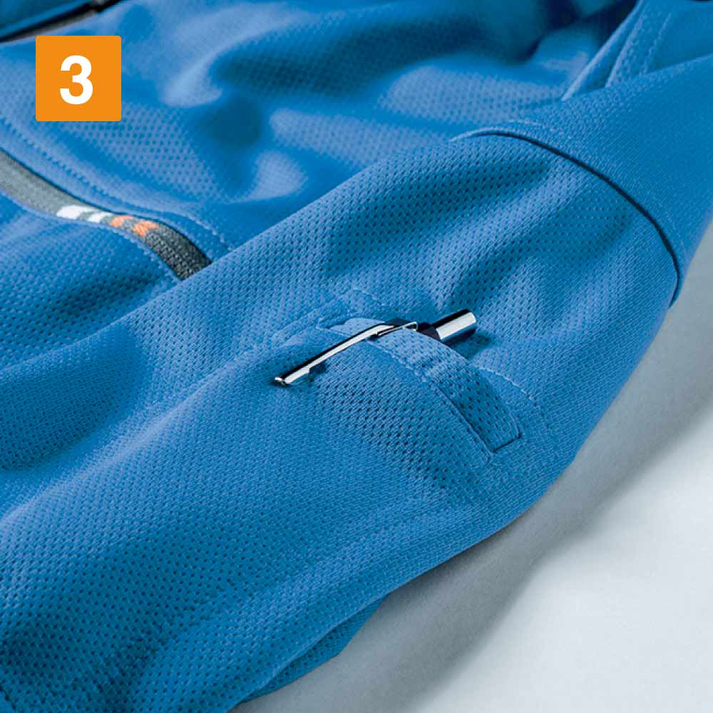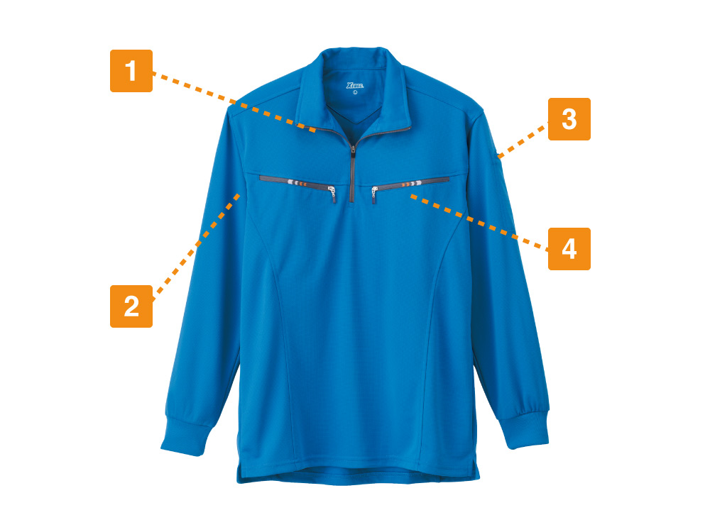 スポーティな雰囲気と、お仕事をアシストしてくれる機能を両方備えたスタイリッシュなウェアです。伸縮性のある生地を使用し、体を大きく動かすお仕事でも妨げを感じず、快適に作業を行えます。また、両胸のポケットはファスナー付きなので、物の落下を防いで安全性アップ。貴重品を入れておくのにも最適です。加えて、袖には使い勝手のいいペン差しも備え、配送業など筆記の多いお仕事もスムーズに行えます。袖口はリブ仕様になっており、手首に優しくフィット。腕まくりする際もずり落ちないので、ストレスを感じさせません。