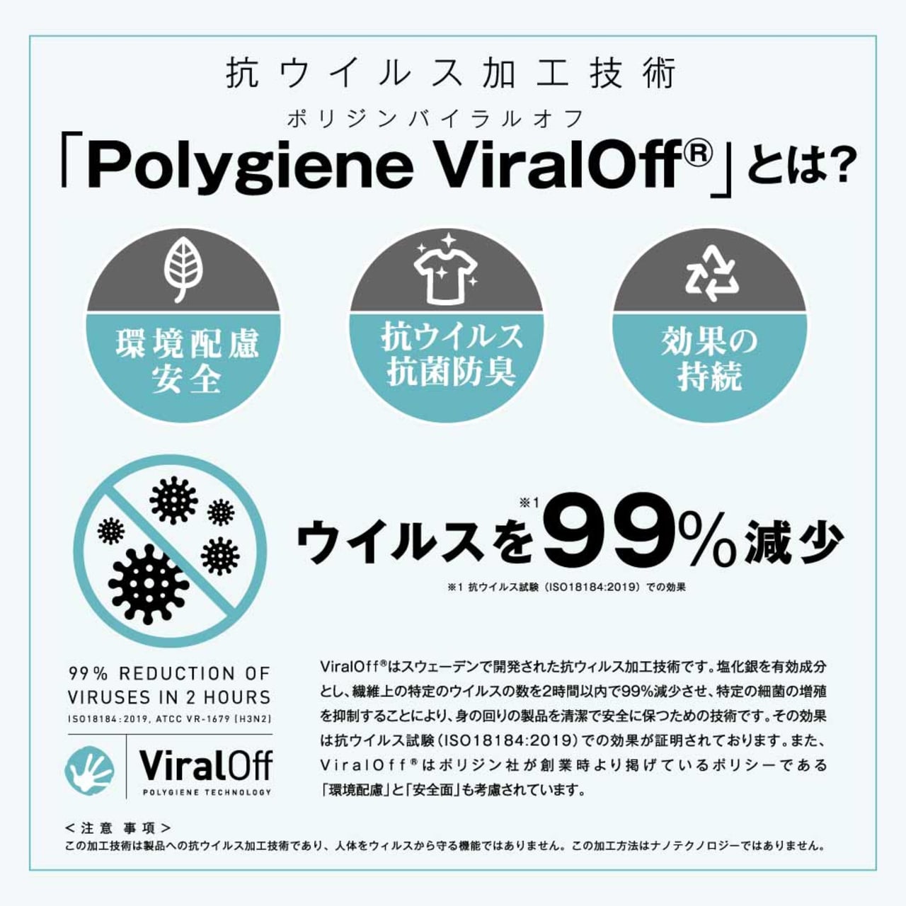 ベーシックなデザインにこだわりの機能を詰め込んだ、高性能Tシャツ。吸水性と速乾性を備えたドライ生地が、快適な着心地をキープ。汗をかいてもさらりとした着用感が持続します。また、生地に抗ウイルス加工技術が施されているのが大きな特徴です。繊維上の特定の菌を2時間以内に99%減少させ、ウェアはもちろん体や身の回りの物を清潔に保ちます。繊維自体に加工が施されており、長い期間効果が持続するのも嬉しいポイント。今の時代にぴったりの一着になっています。