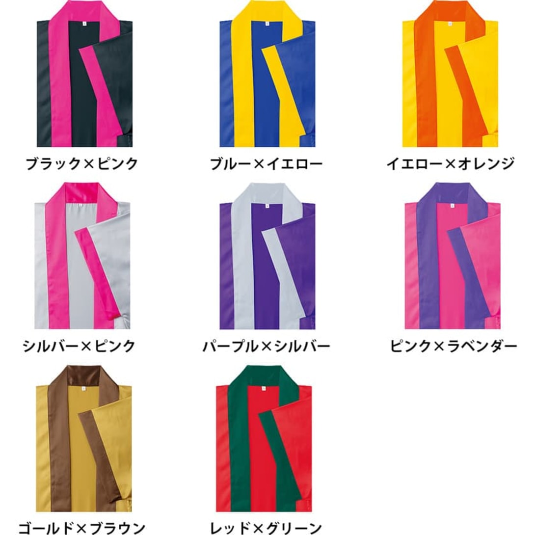 キラキラと光沢感あるポリエステルサテン生地を使用したロングはっぴ。とっても軽い生地なので踊り用等に大人気です。また、独創的なカラーチョイスも注目ポイントです。