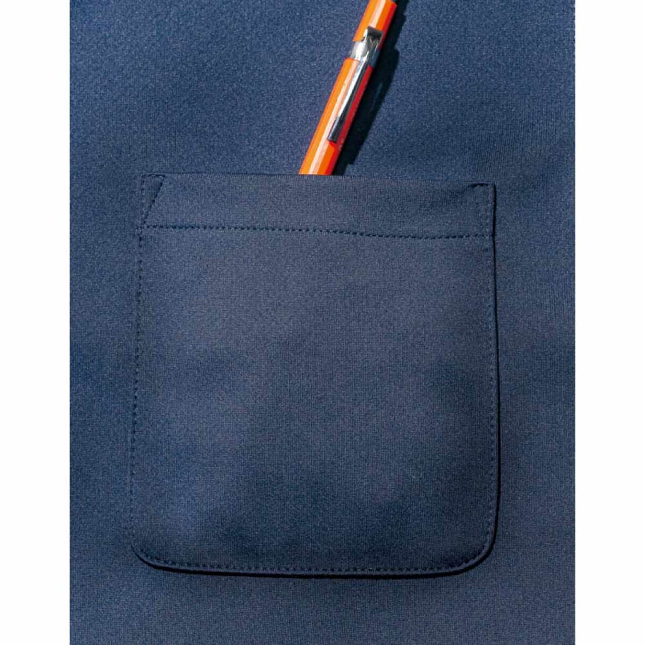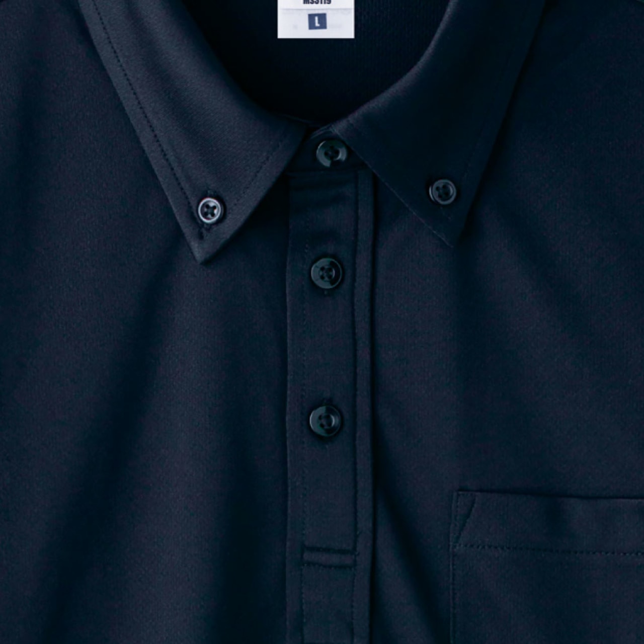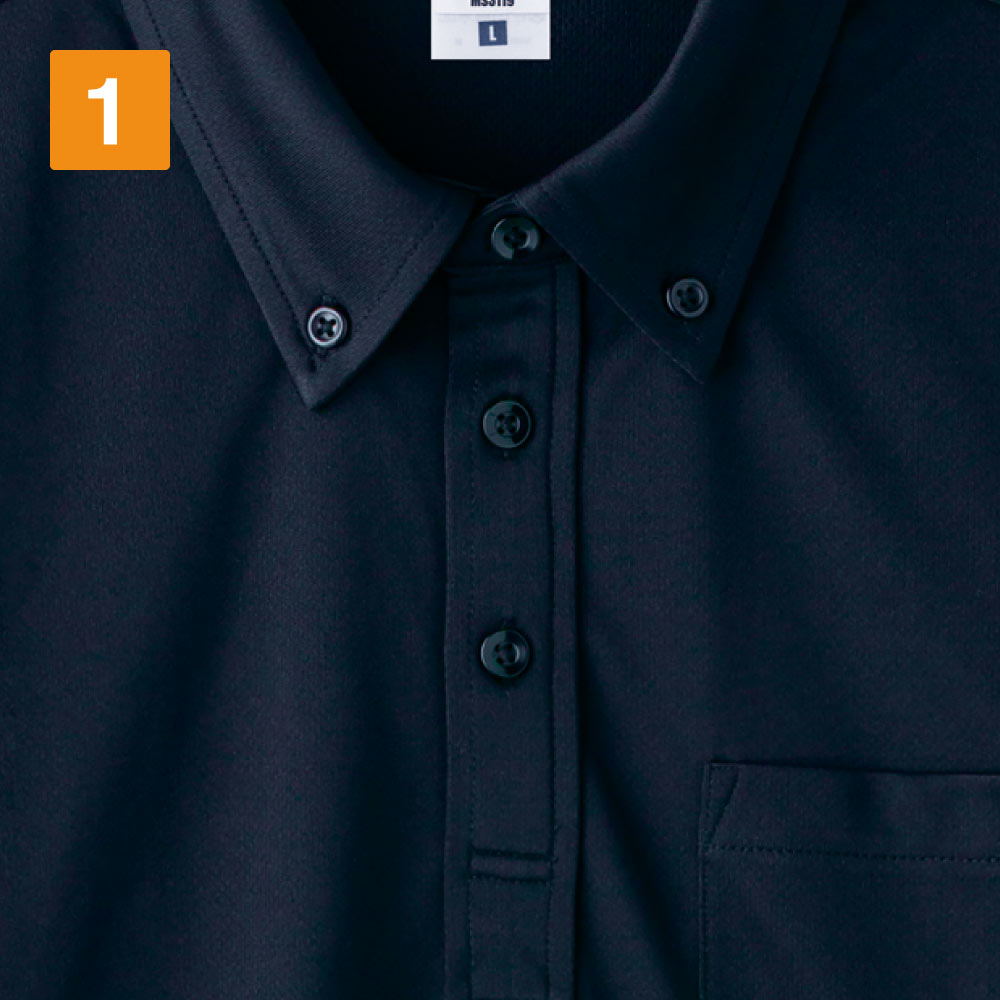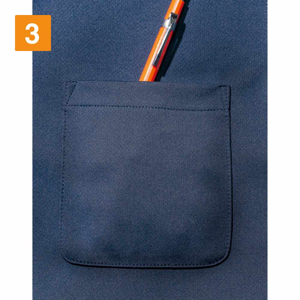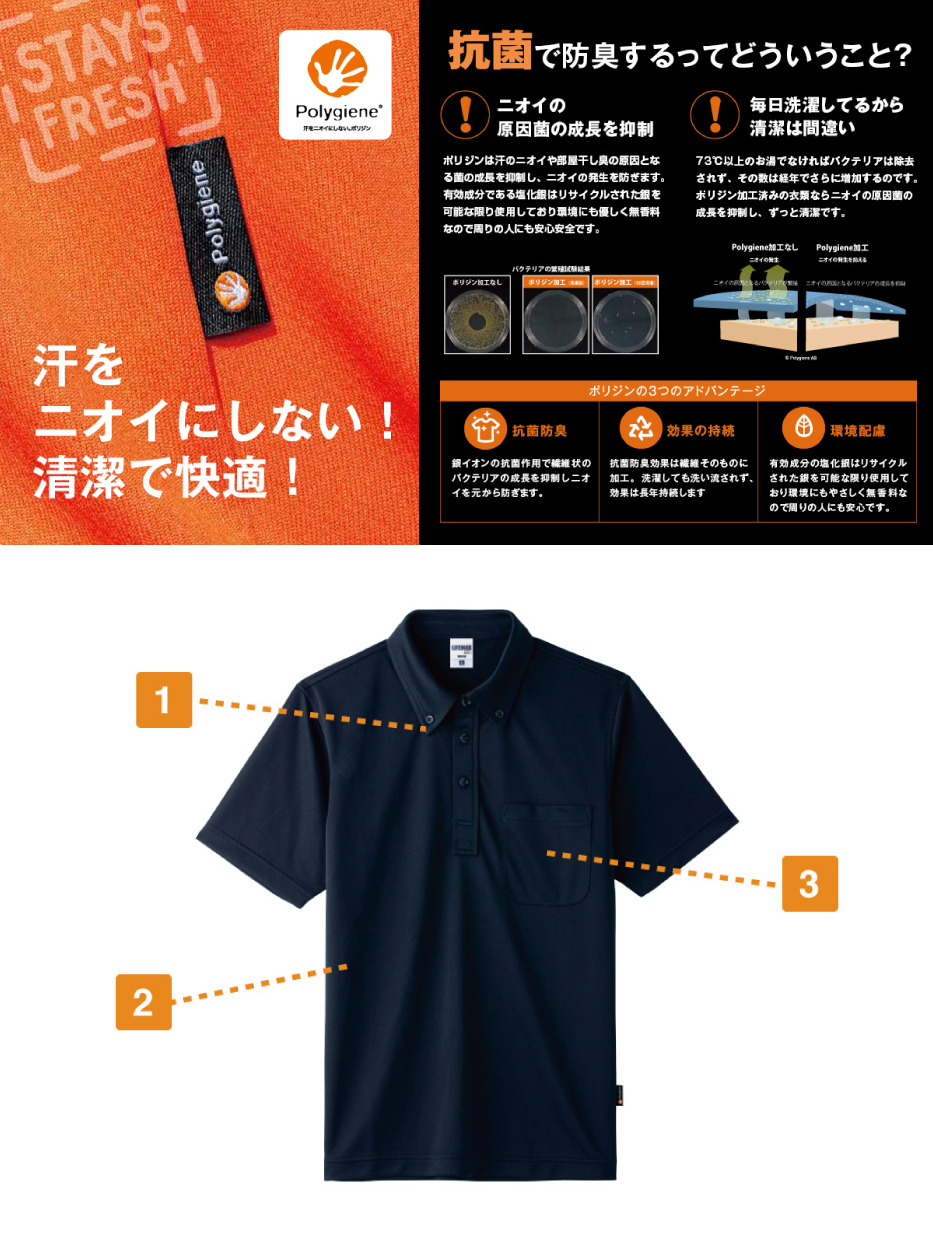 生地はお手入れのしやすいポリエステル100%素材。メッシュ加工に加え凹凸加工が施されており、高い通気性で服内部を快適に保ちます。また、気になるニオイ対策として、生地には抗菌防臭加工「ポリジン」が施されています。ニオイの原因となる菌を抑制し、クリーンで快適な状態を保ってくれるのがポイント。繊維そのものに加工が施されており、長期間効果が衰えないという嬉しい特徴も備えています。収納面では、お仕事や作業時に便利な胸ポケット付き。物の入れやすさを考慮して設計されたポケット位置で、使いやすさも抜群です。