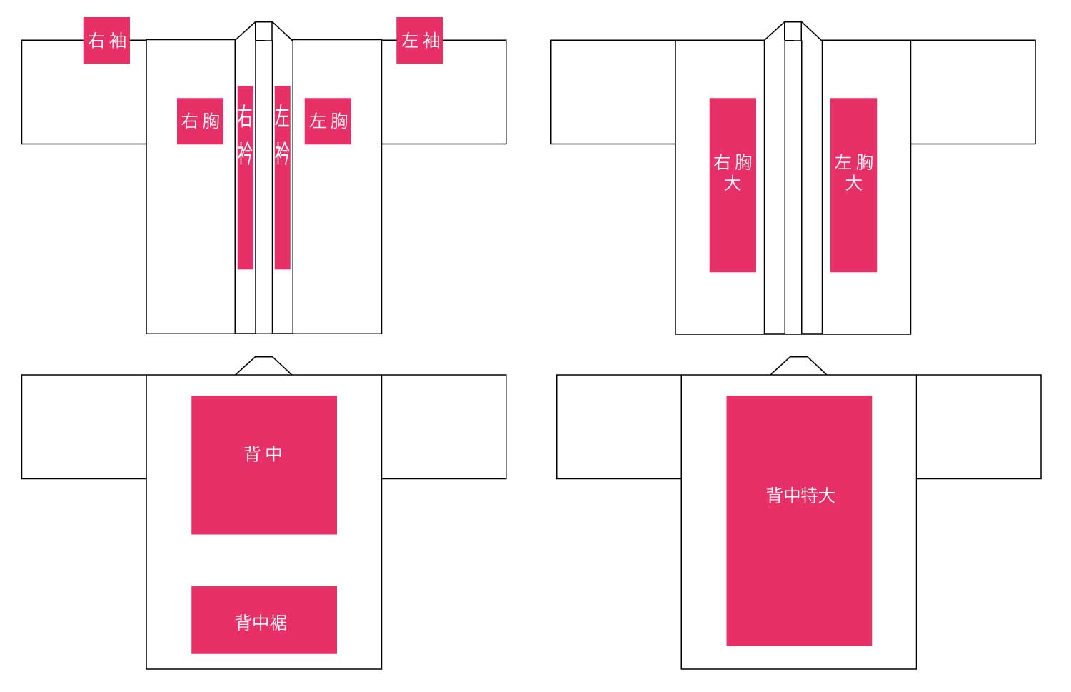 | 加工サイズ | 両衿 | 背中(小)/横25×縦25cm以内 | 背中(中)/横35×縦30cm以内 | 背中(大)/横35×縦40cm以内 | 両衿+背中(小) |