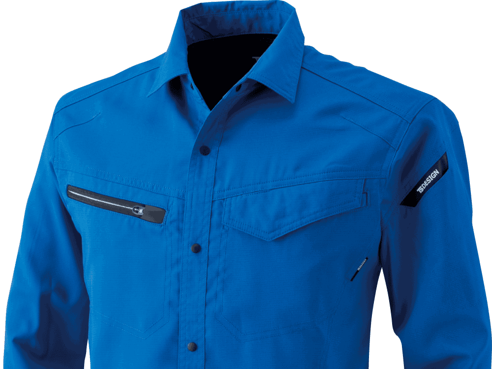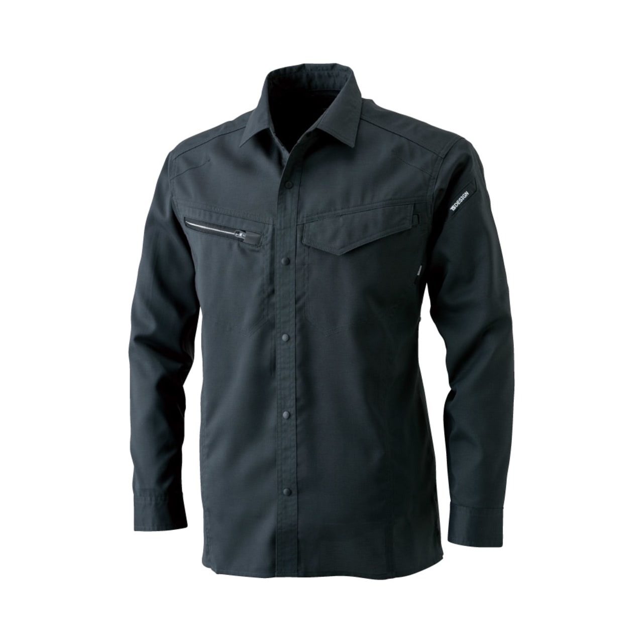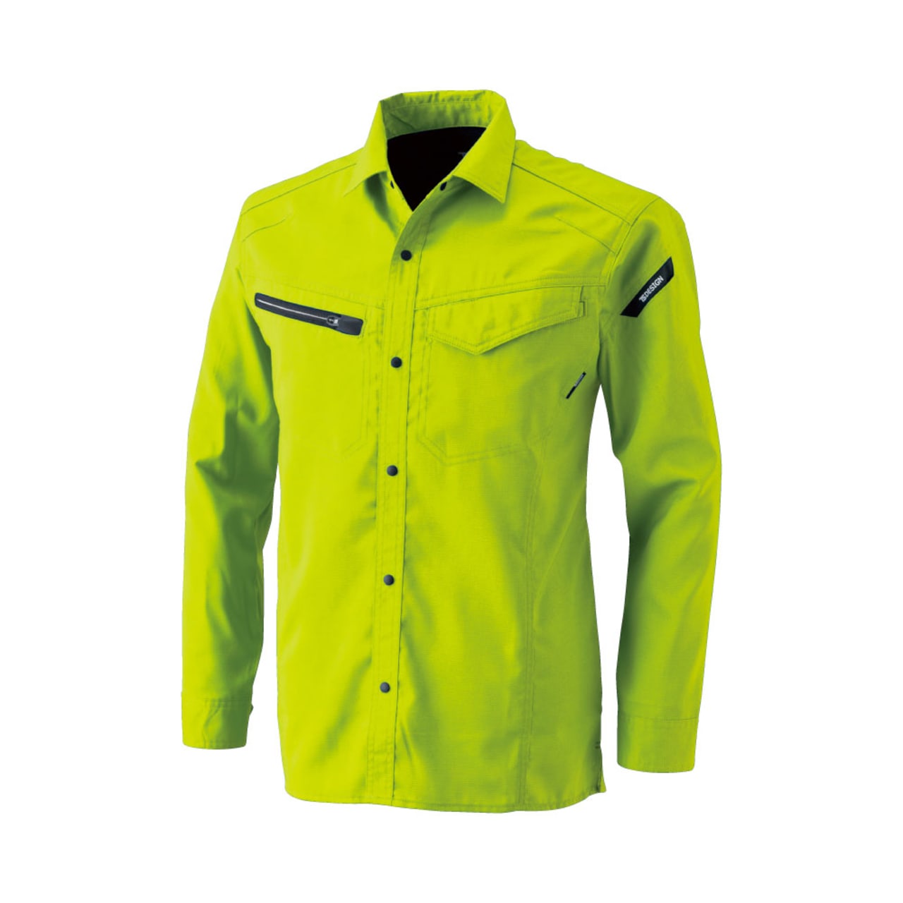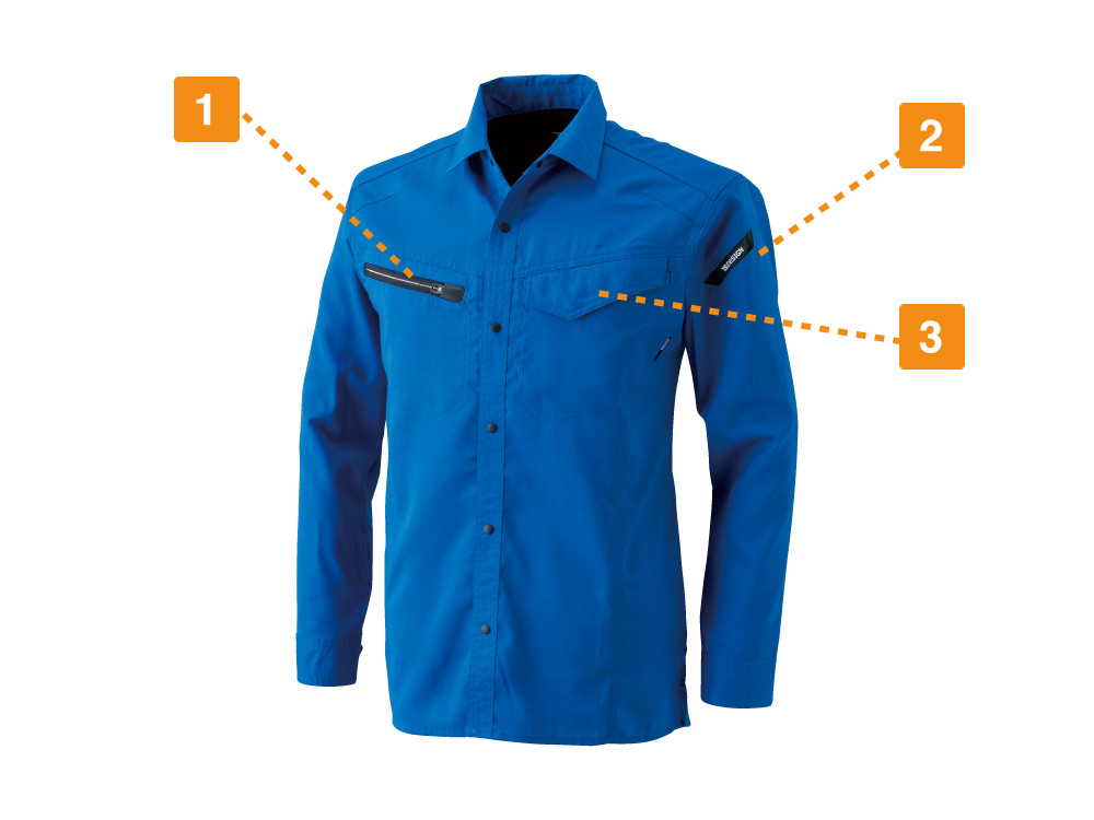 生地の持つ様々な性能がポイントのワークシャツ。生地には肌が触れる部分に綿の混紡素材を使用し、やさしい肌ざわりを実現したストレッチエアーリップが採用されています。ストレッチ性、通気性、形態安定性といった豊富な機能で、快適作業をサポートしてくれるのもポイント。さらに、導電繊維を混紡することで、製品制電 JIS T-8118に適合した高い帯電防止性能を実現しています。静電気の発生による危険が想定される、引火性ガスを扱う現場などでも安全に着られるウェアです。