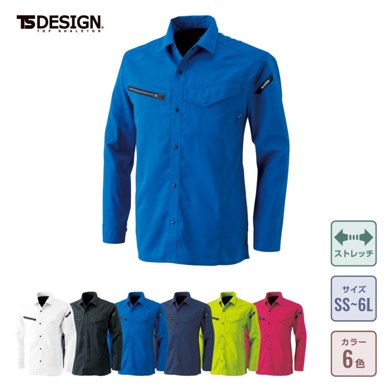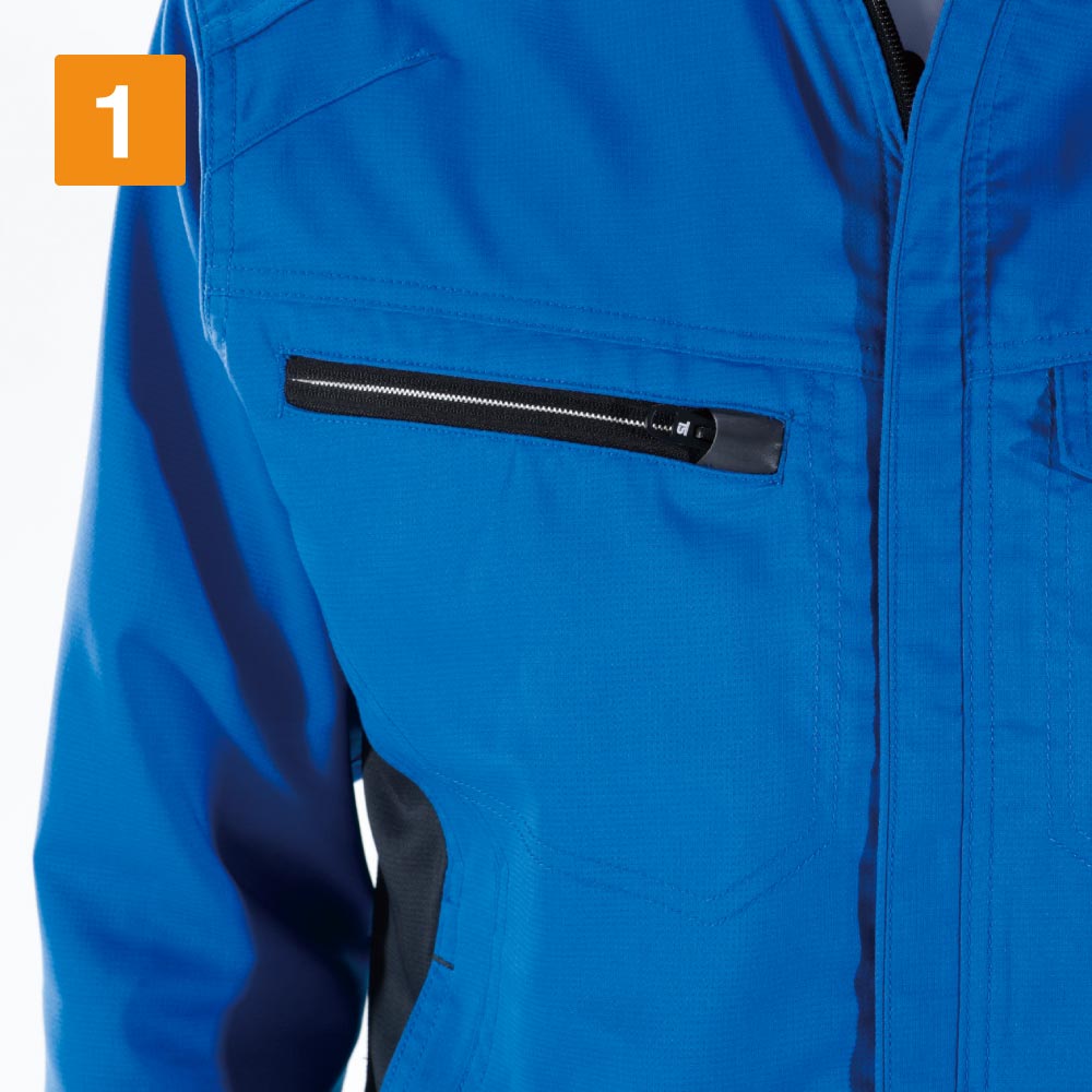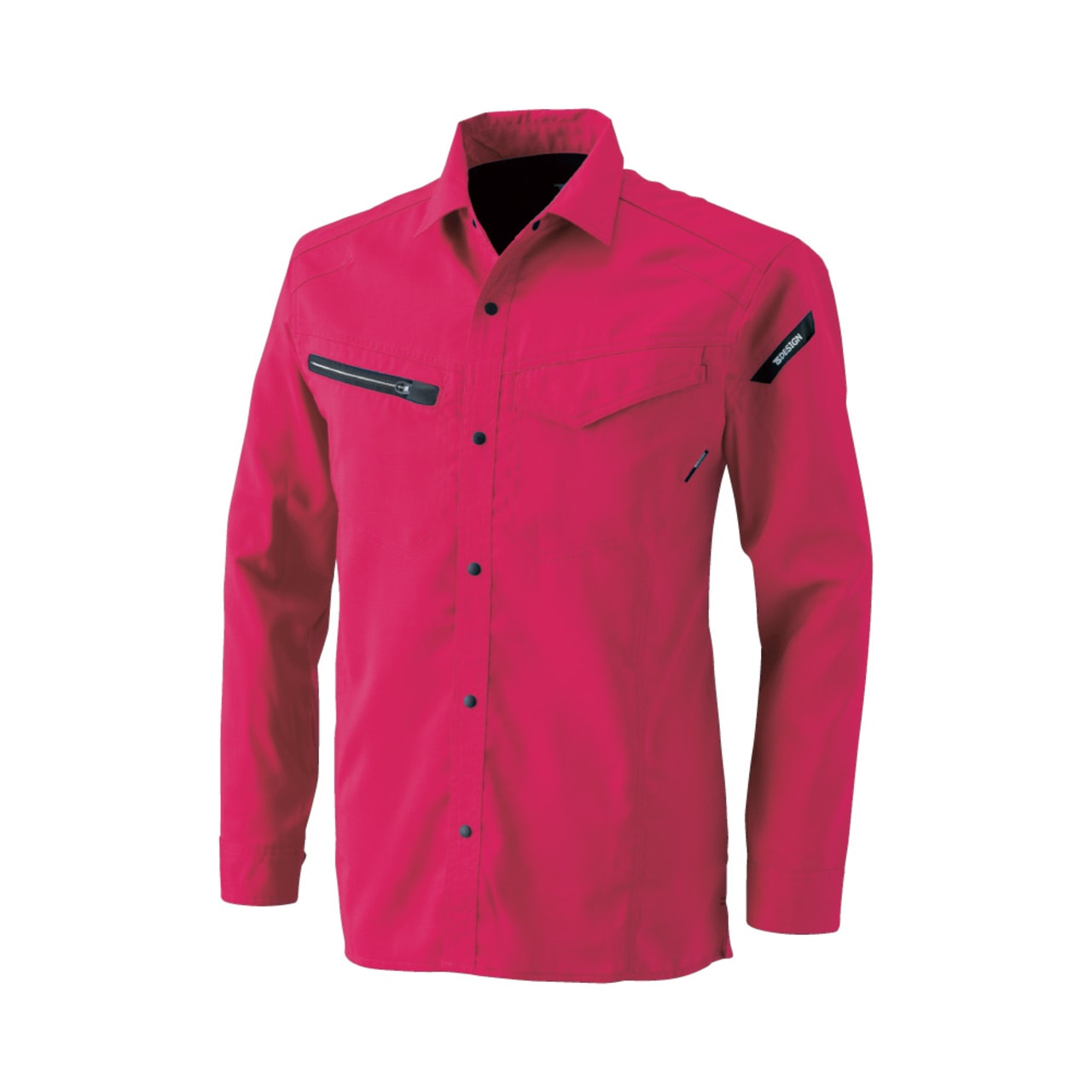 生地の持つ様々な性能がポイントのワークシャツ。生地には肌が触れる部分に綿の混紡素材を使用し、やさしい肌ざわりを実現したストレッチエアーリップが採用されています。ストレッチ性、通気性、形態安定性といった豊富な機能で、快適作業をサポートしてくれるのもポイント。さらに、導電繊維を混紡することで、製品制電 JIS T-8118に適合した高い帯電防止性能を実現しています。静電気の発生による危険が想定される、引火性ガスを扱う現場などでも安全に着られるウェアです。
