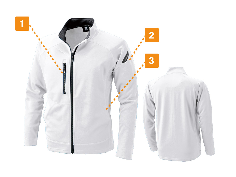 洗練されたデザインだけでなく、着心地や作業性においても優れた実力を備えるロングスリーブジャケット。生地に採用されているのはやさしいぬくもりが感じられるESフリース。しっかりと体温を服の中にとどめ、冬場の快適な着用感を実現します。また、生地の持つストレッチ性能によって、作業時の動きにも制約を感じさせません。生地はさらに制電糸が編み込まれており、製品制電 JIS T-8118適合。引火性ガスを扱うなど、静電気の発生により重大な事故が予見される現場でも着用可能です。