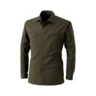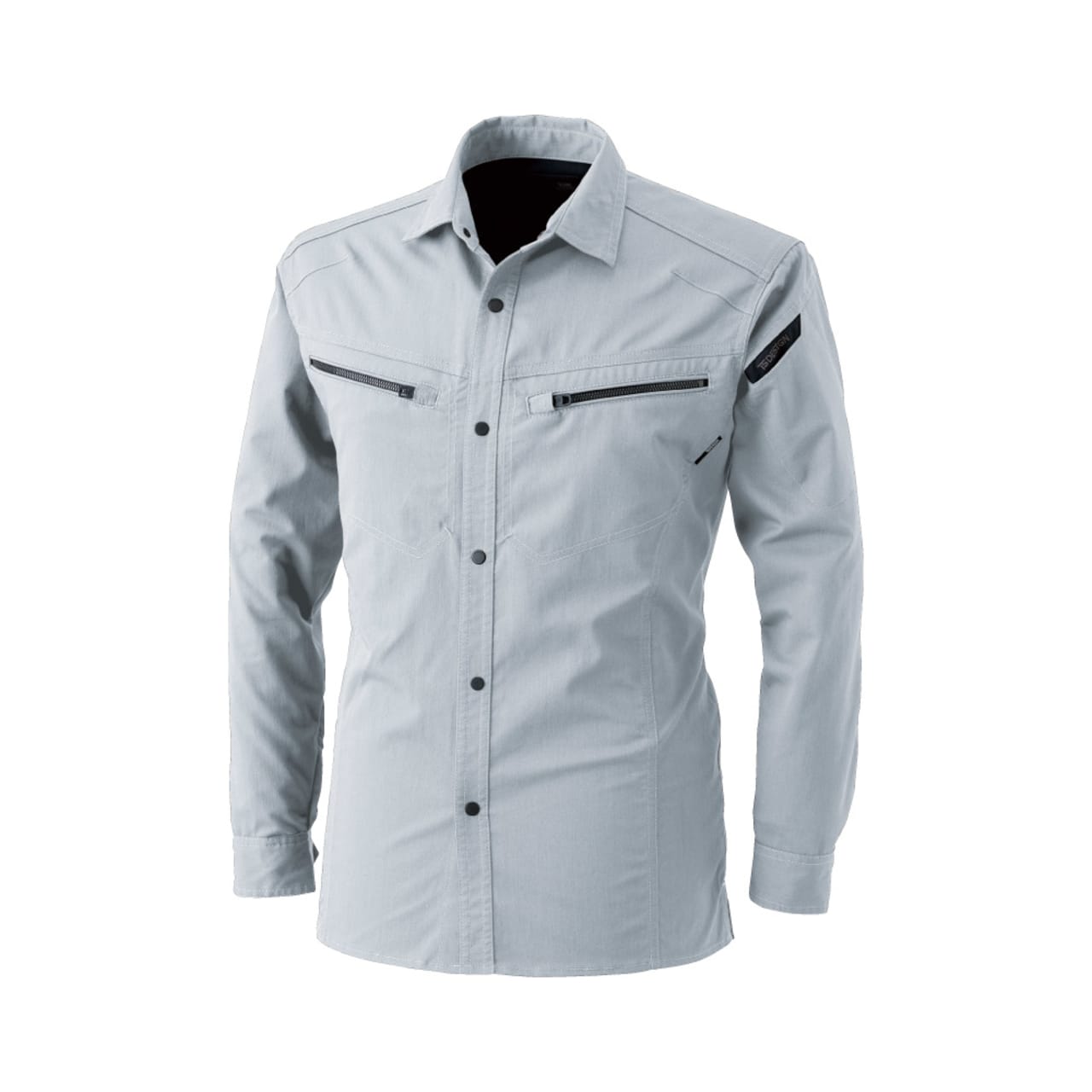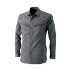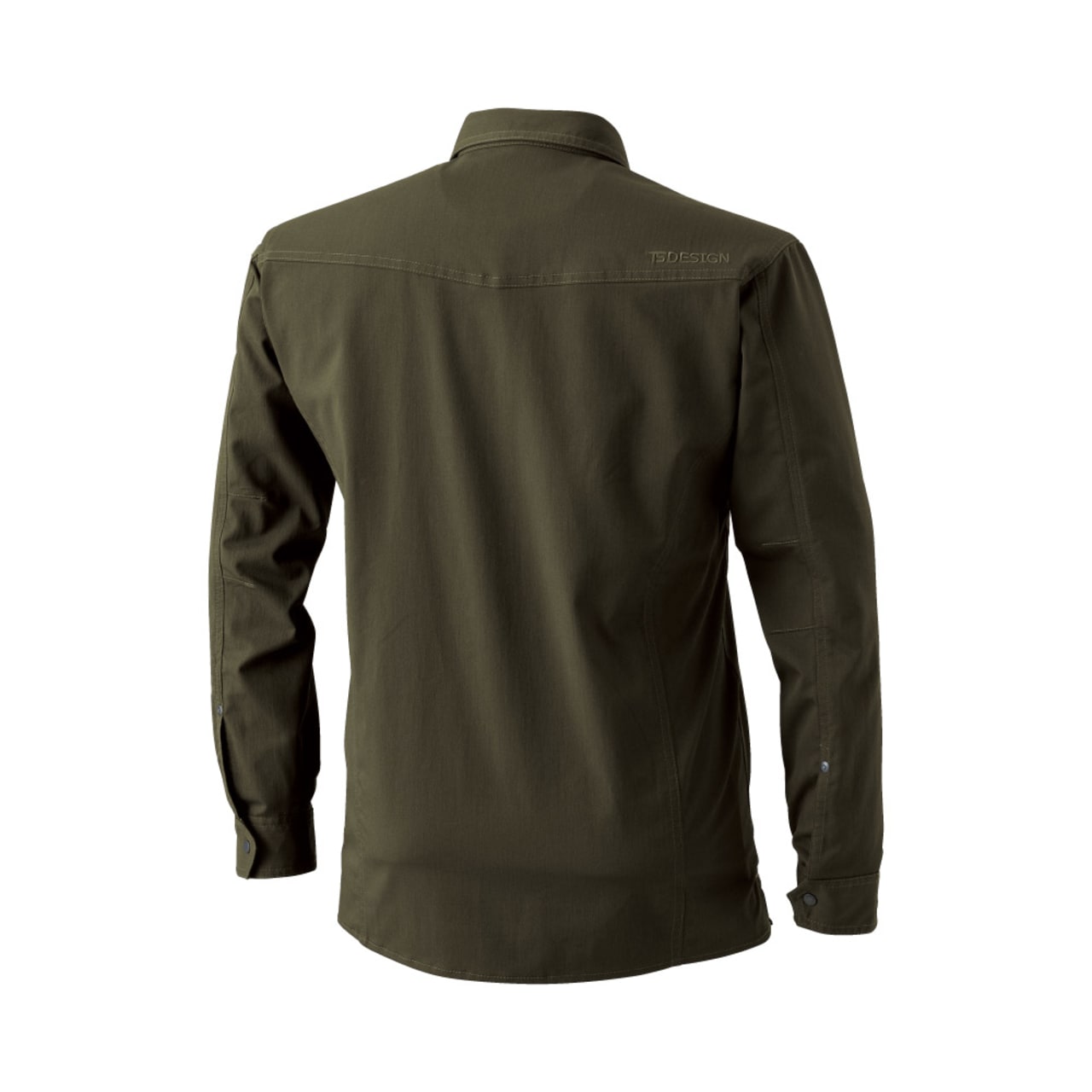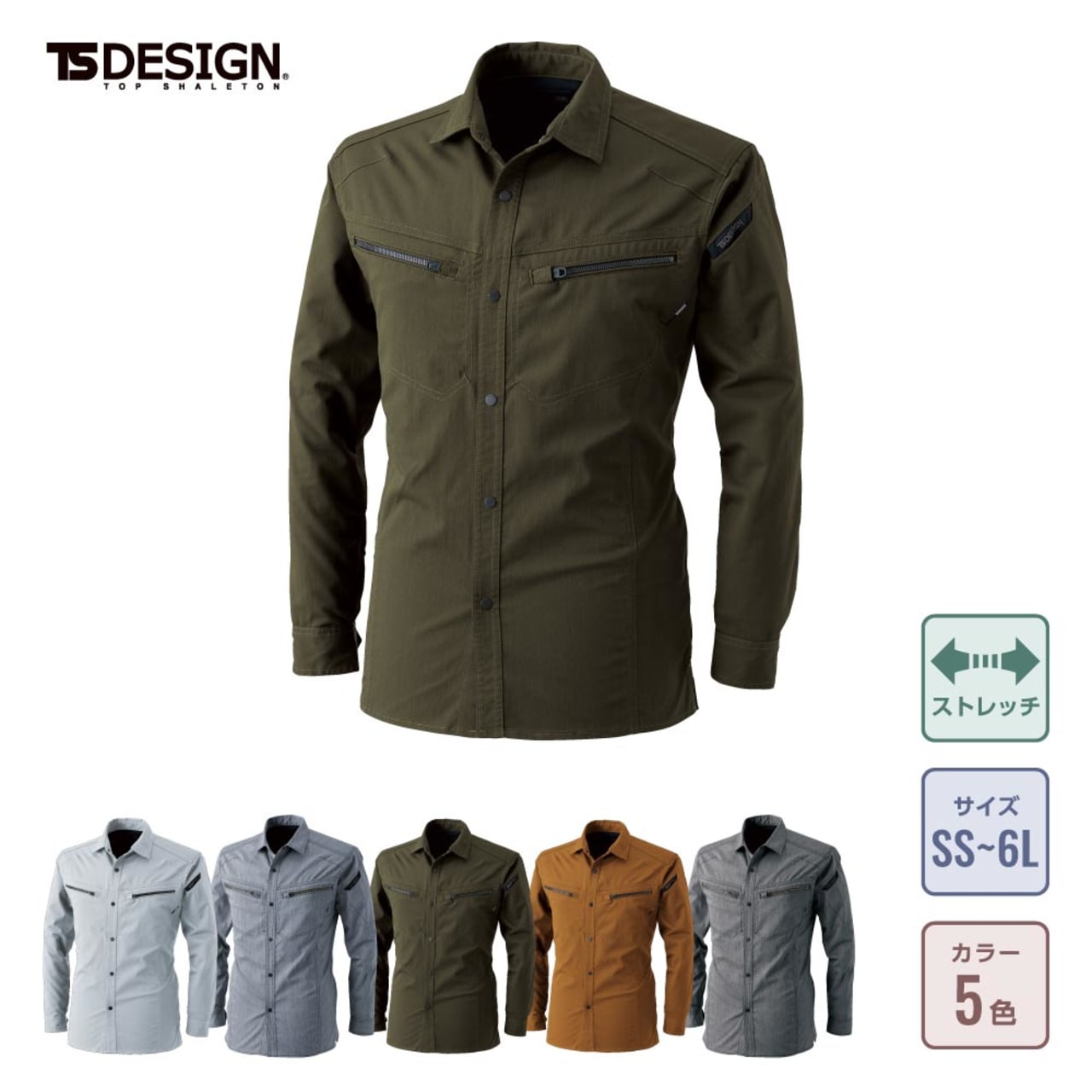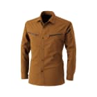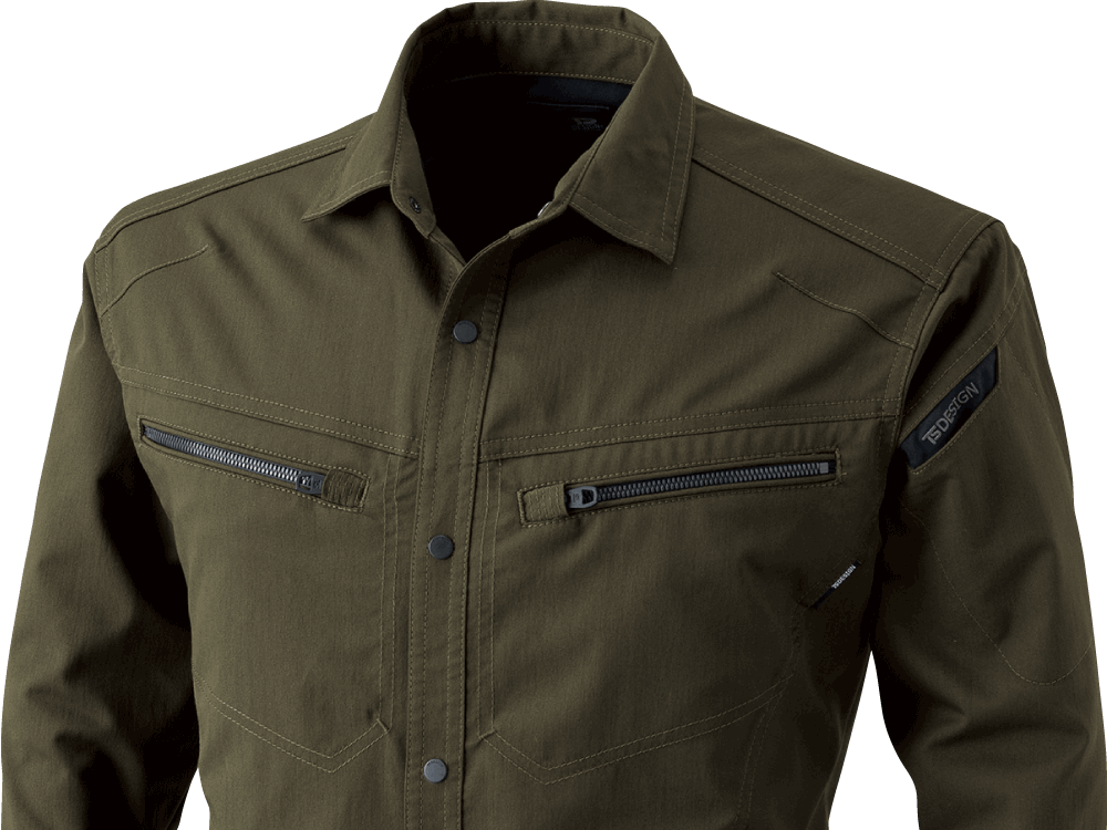 ベーシックなルックスながら、生地のもつ性能で圧倒的な機能性をプラスしたシャツです。生地は高い耐久性を備えつつも軽量で、疲れにくいのがポイント。さらにストレッチ性能と形態安定性で、毎日のヘビーユーズでもへたりにくく作業性も高くなっています。そんな本体生地に使用されているのは、TSレイヤードツイル 。伸縮性のある高捲縮ポリエステル糸をポリエステルで包んだ、ハイブリッドな二重構造糸で織りあげた生地です。導電繊維を混紡することで、帯電防止機能も備えています。また糸使いや染色方法に独自のテクニックを用いることで、独特のこなれた風合いをお楽しみいただけます。