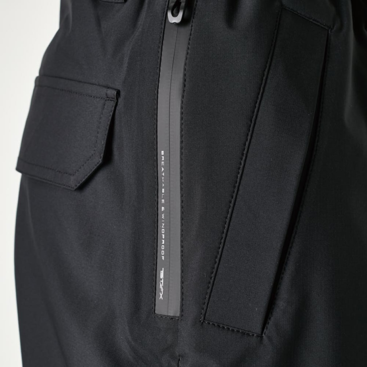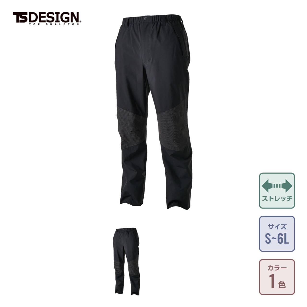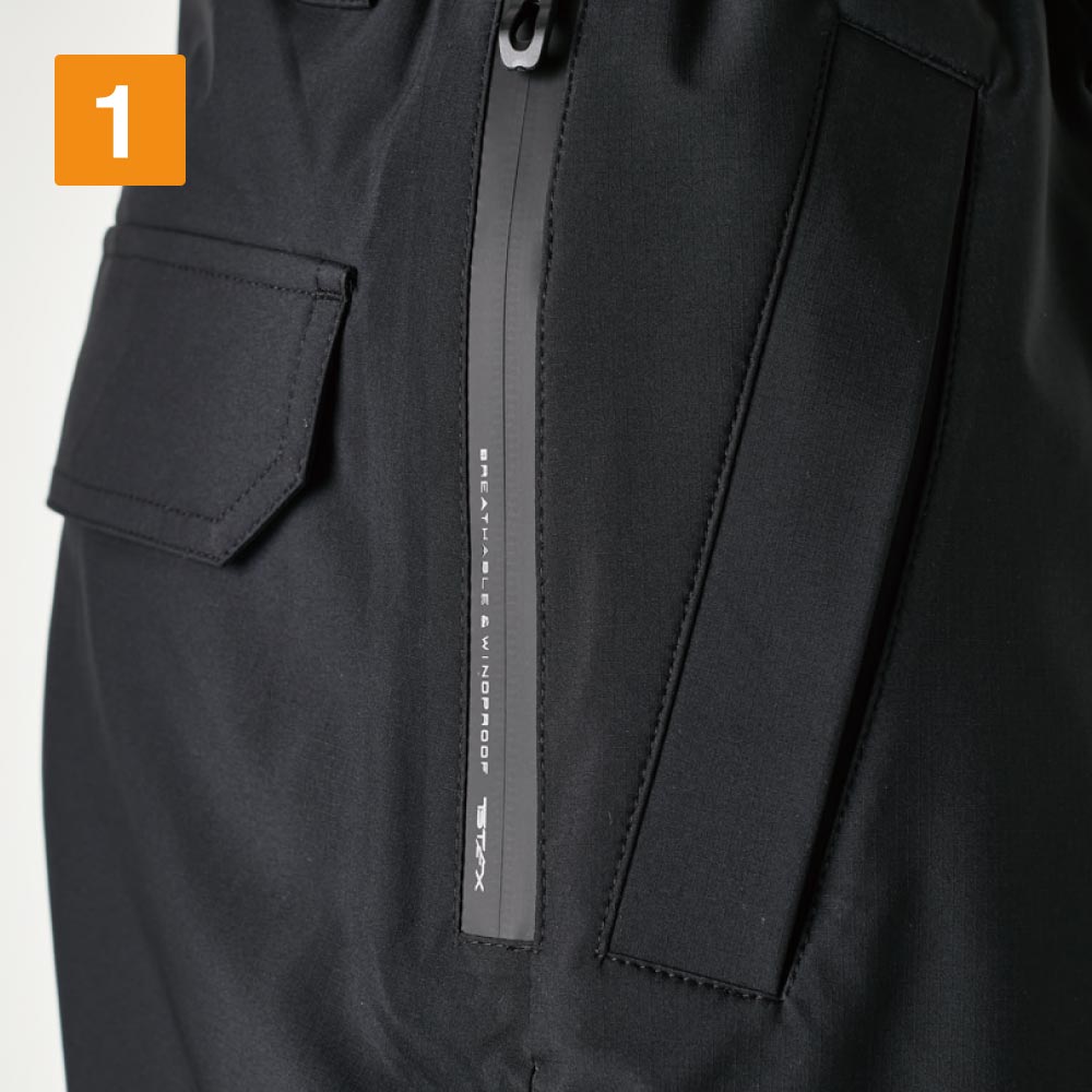 あらゆる天候での快適作業を支える高機能パンツ。ポイントは本体生地に使用されているTS TEXストレッチミニリップ。裏面に耐熱性と対脆性に優れたフィルムを溶着し、30000mmの高い耐水圧で水や風をシャットアウト。さらに、11000g/㎡-24hの透湿性によって、服内部の蒸れを常時排出し快適な着心地をキープしてくれます。表地は厚さたった0.24mm。軽やかな着用感で疲れを感じにくいのもポイントです。生地はストレッチ性があり脚さばきもスムーズで、ハードワークにも最適な一着になっています。
