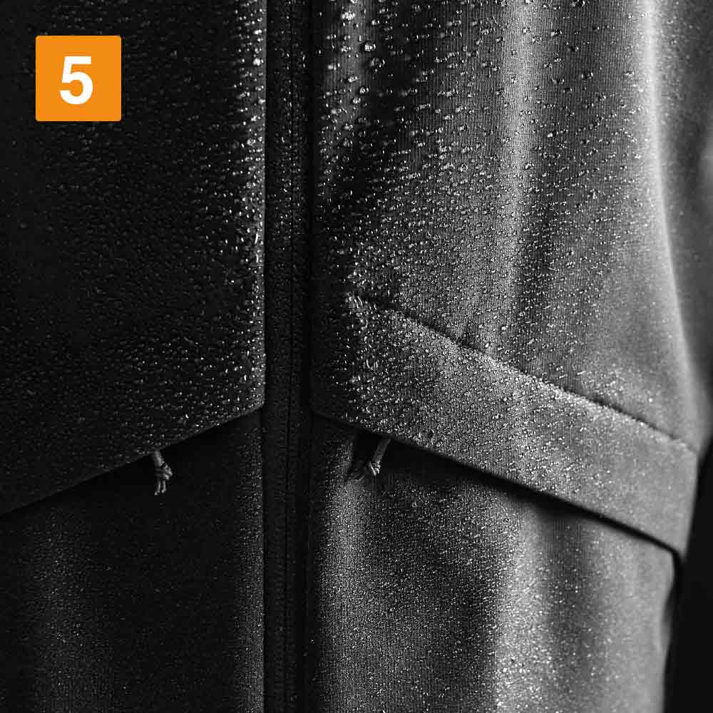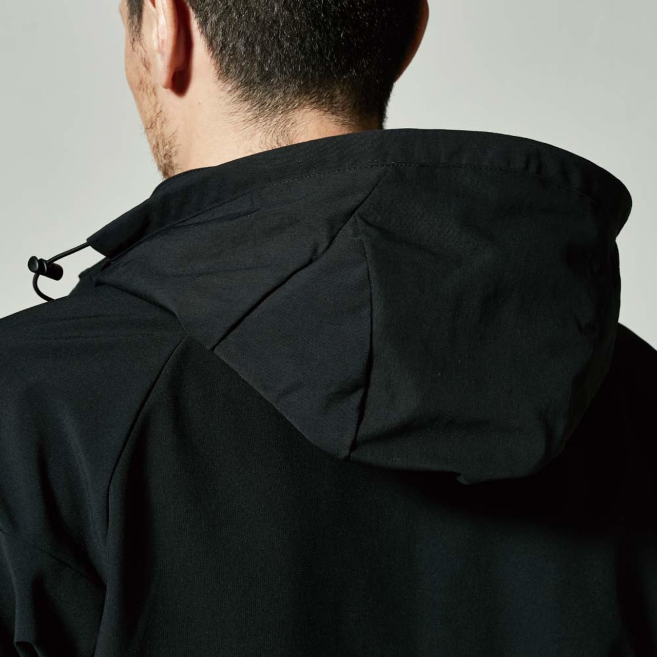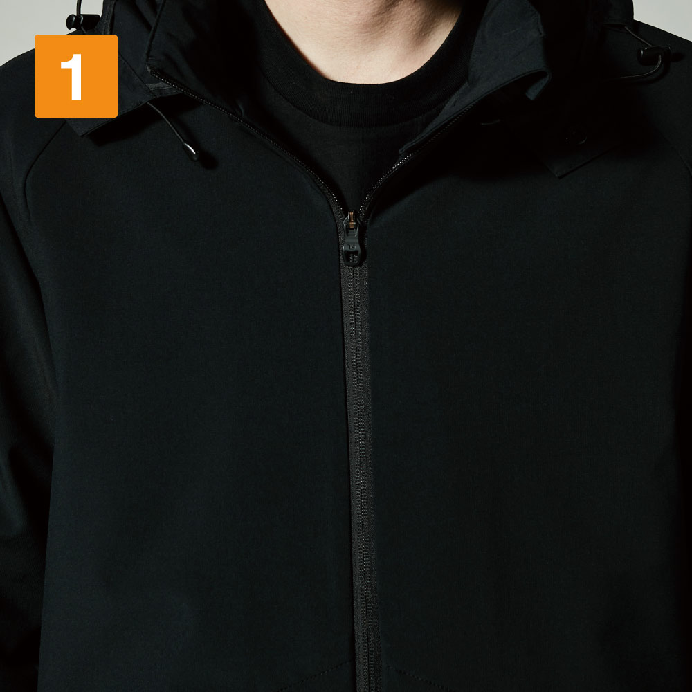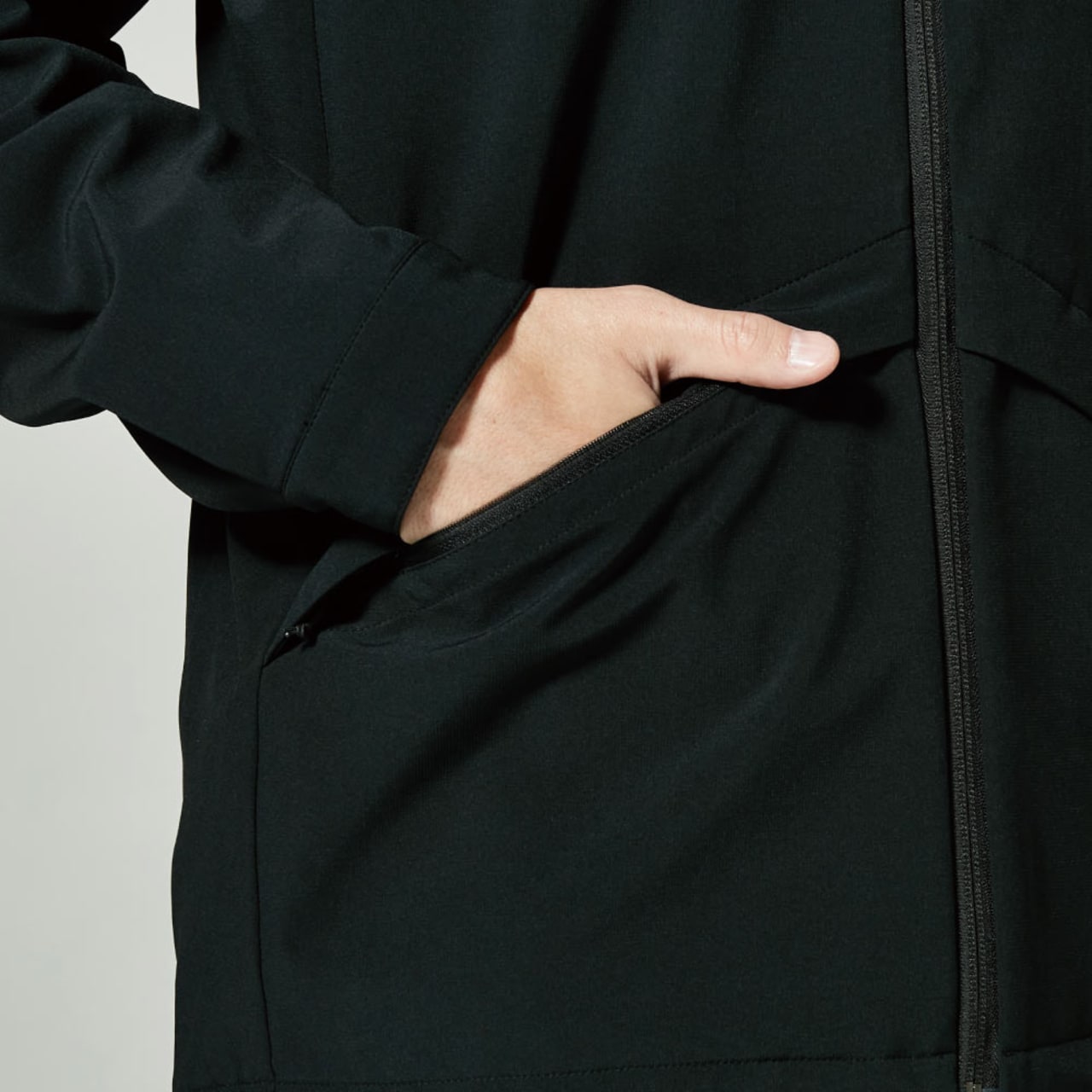 高機能防風フィルムTS TEXを使用することで、防風性・耐水性・透湿性を備え、様々な環境での快適な着用を実現したジャケットです。ポイントは揮発性有機物を使用せず溶着されたTS TEXフィルム。41000mmの高い耐水圧と、快適な着用感を作る16000g/㎡-24hの透湿性を実現しています。また、フィルムは無孔で水滴を通さず、さらに目詰まりしないことで生地の機能を長くキープ可能です。さらに、軽量性・柔軟性を備えることで、動きやすさの面でもストレスを感じさせません。