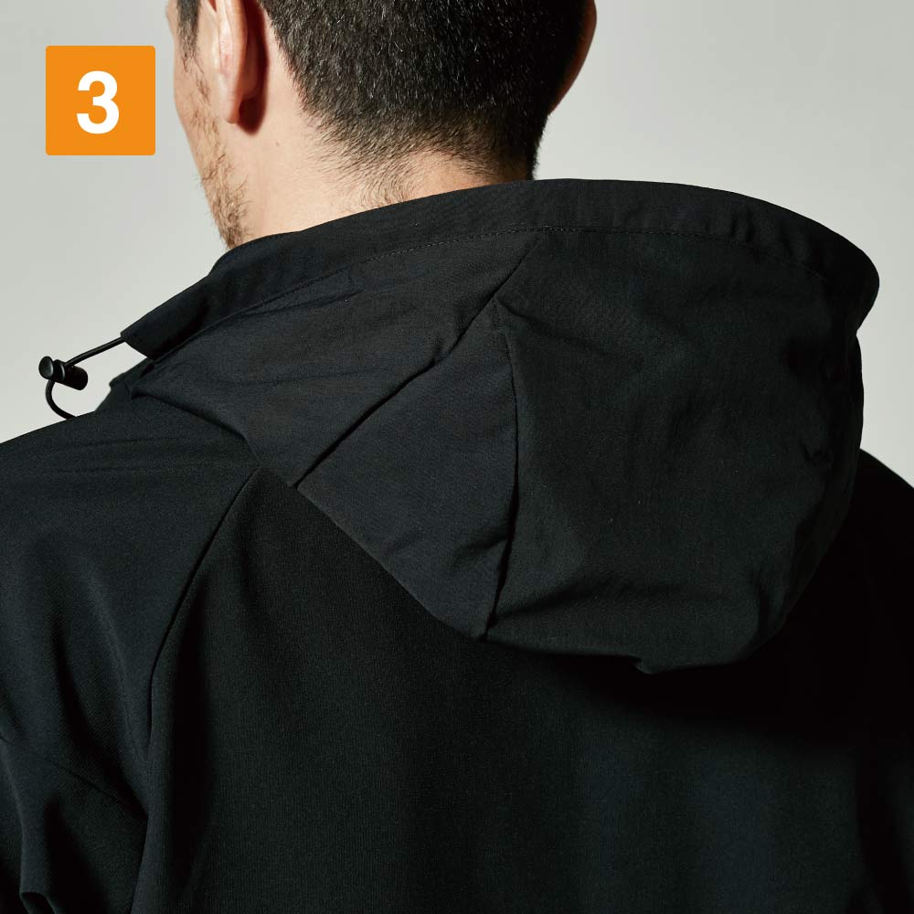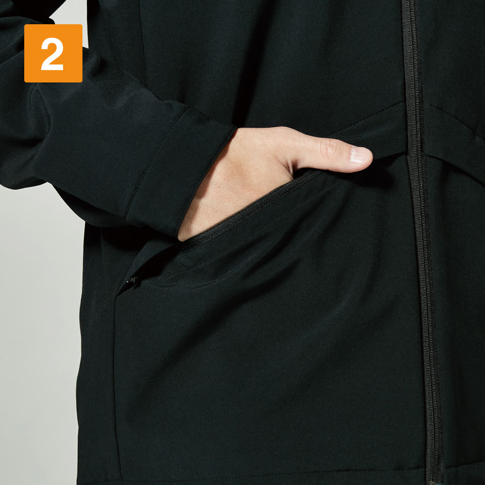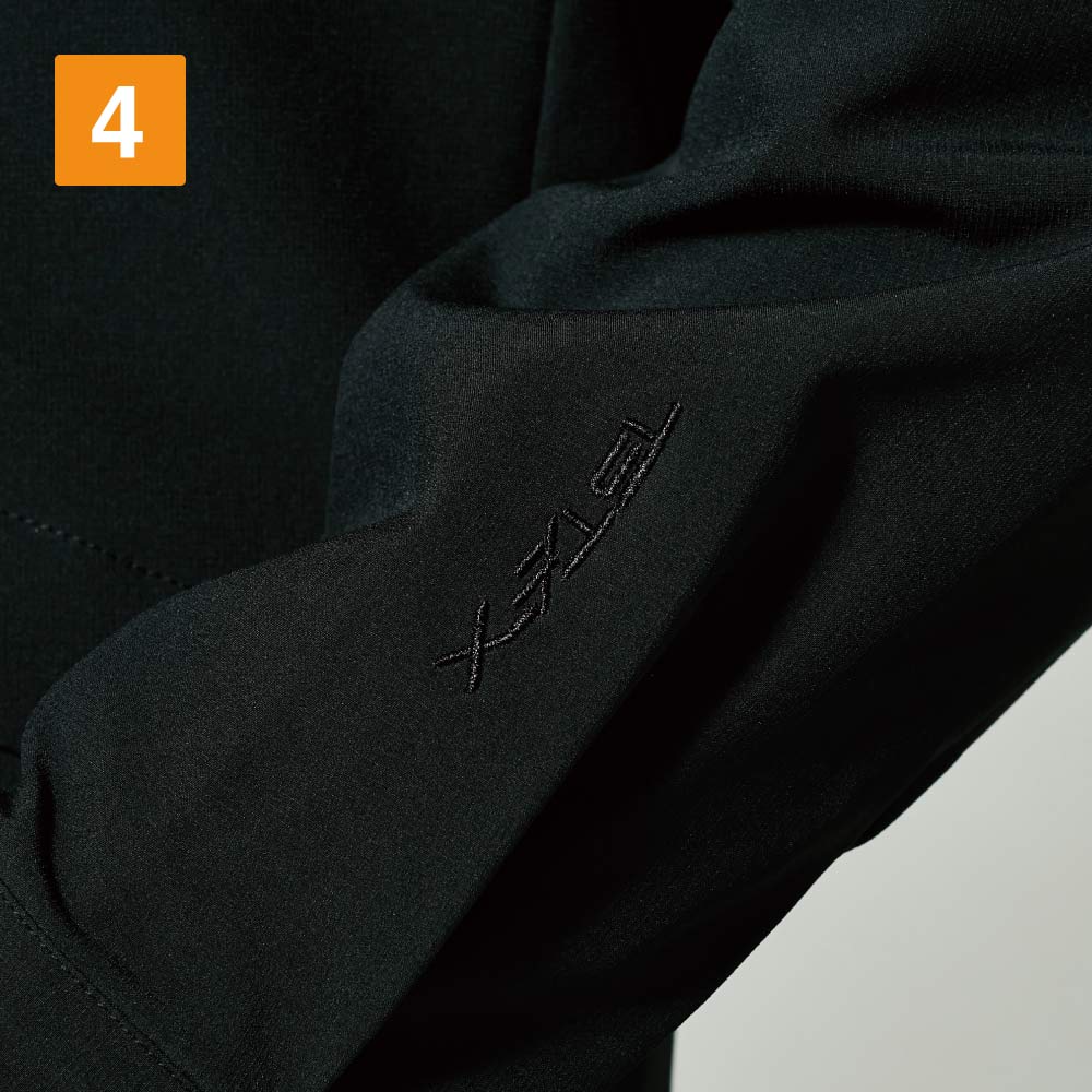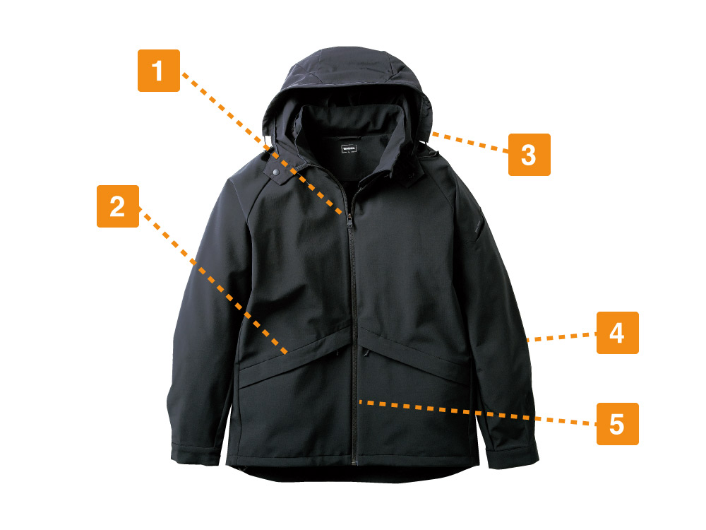 高機能防風フィルムTS TEXを使用することで、防風性・耐水性・透湿性を備え、様々な環境での快適な着用を実現したジャケットです。ポイントは揮発性有機物を使用せず溶着されたTS TEXフィルム。41000mmの高い耐水圧と、快適な着用感を作る16000g/㎡-24hの透湿性を実現しています。また、フィルムは無孔で水滴を通さず、さらに目詰まりしないことで生地の機能を長くキープ可能です。さらに、軽量性・柔軟性を備えることで、動きやすさの面でもストレスを感じさせません。