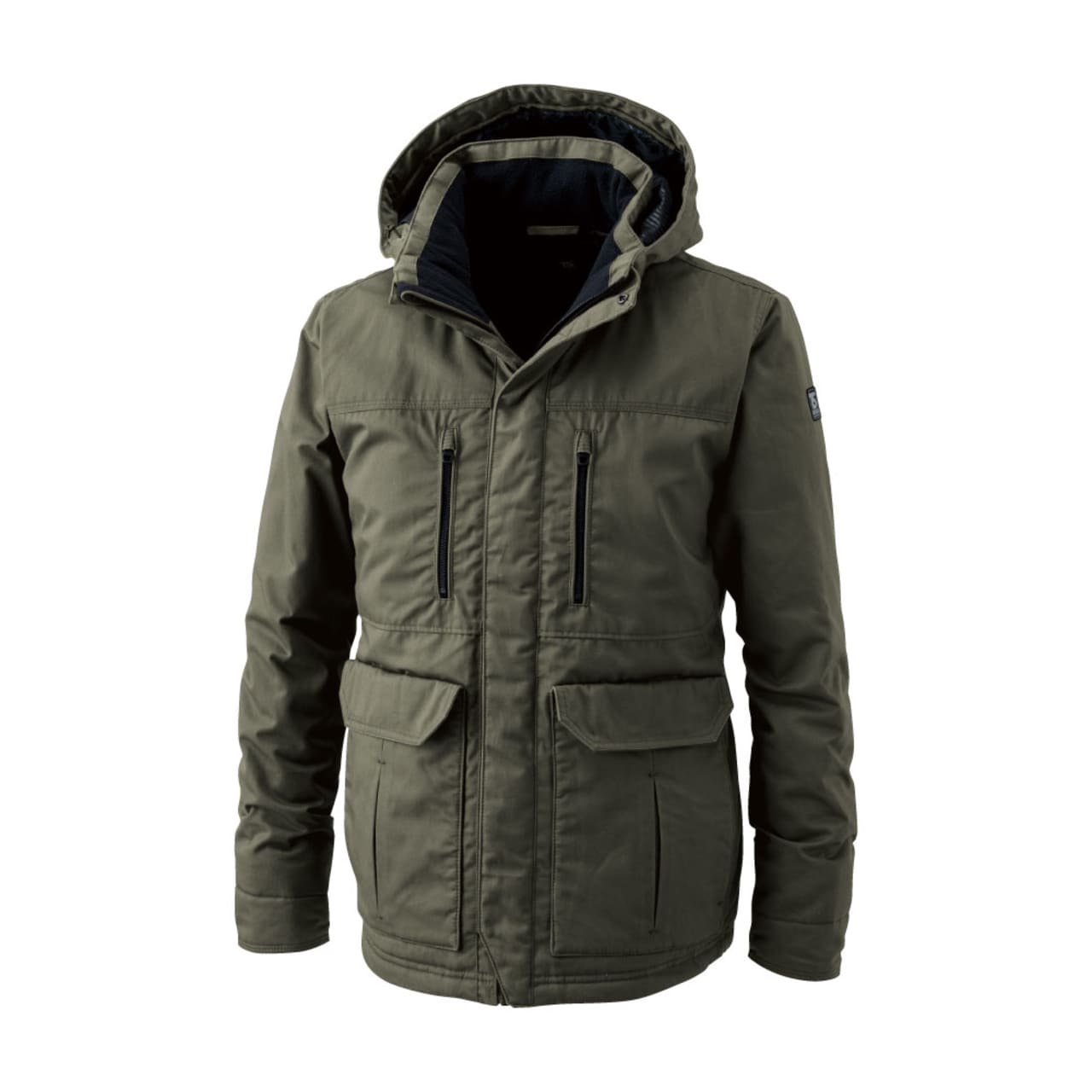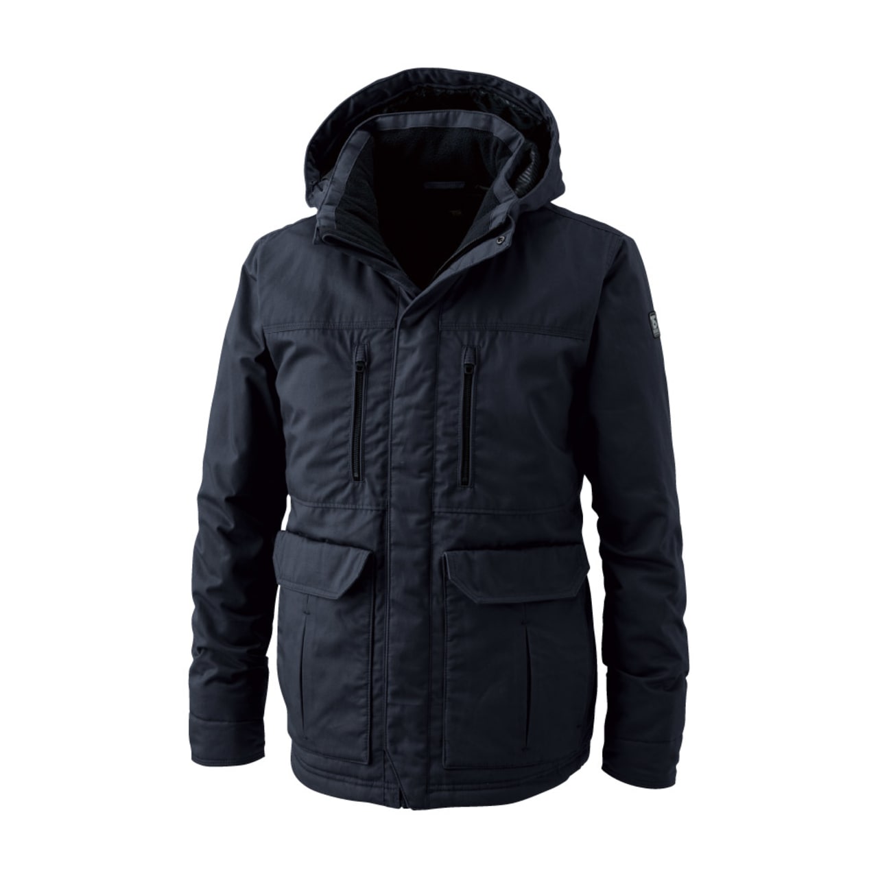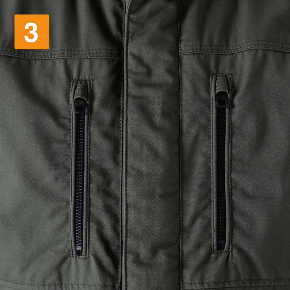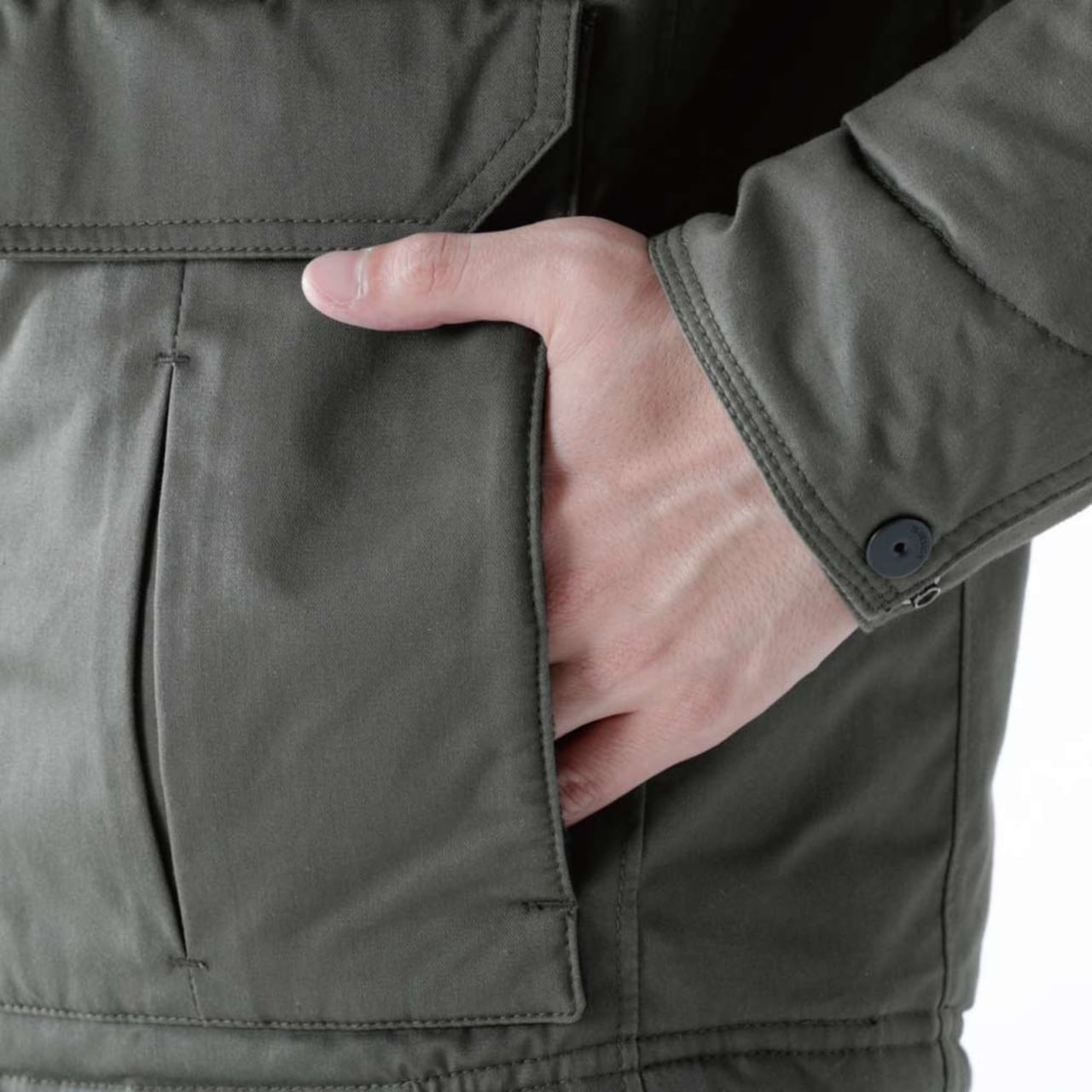 本体生地であるブロックツイルの、綿100%ならではの風合いが魅力のハーフコート。着用を重ねるごとに体に馴染み、心地よさがアップしていくのも着用の楽しみのひとつです。また、脚の動きを邪魔せず、腰回りまであたたかい絶妙なハーフ丈デザインが真冬の作業に最適!中綿がしっかり入った肉厚デザインで、保温性能もしっかり備えた一着になっています。さらに、生地は撥水加工が施されることで、突然の雨など天候の変化にも慌てることなく対応可能です。
