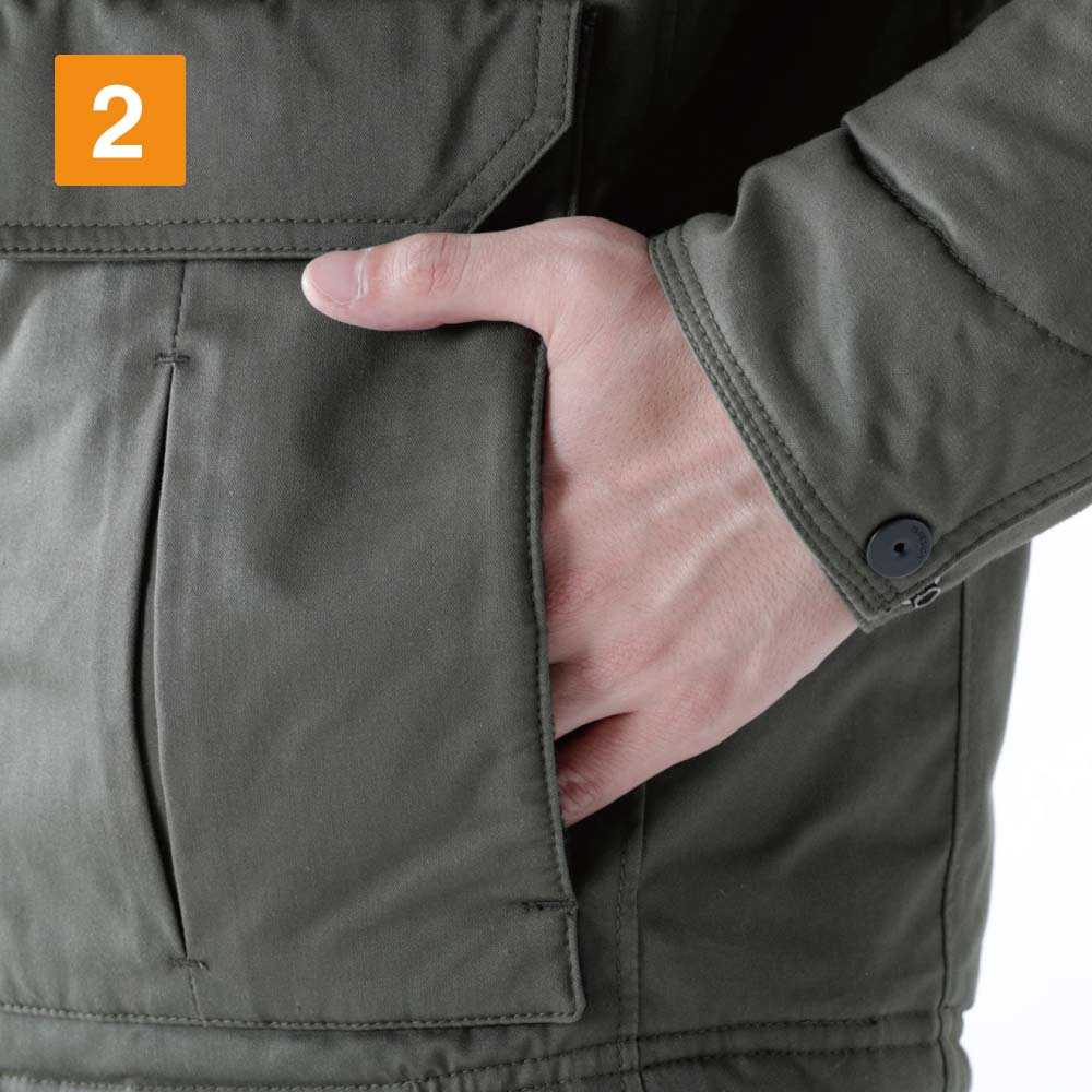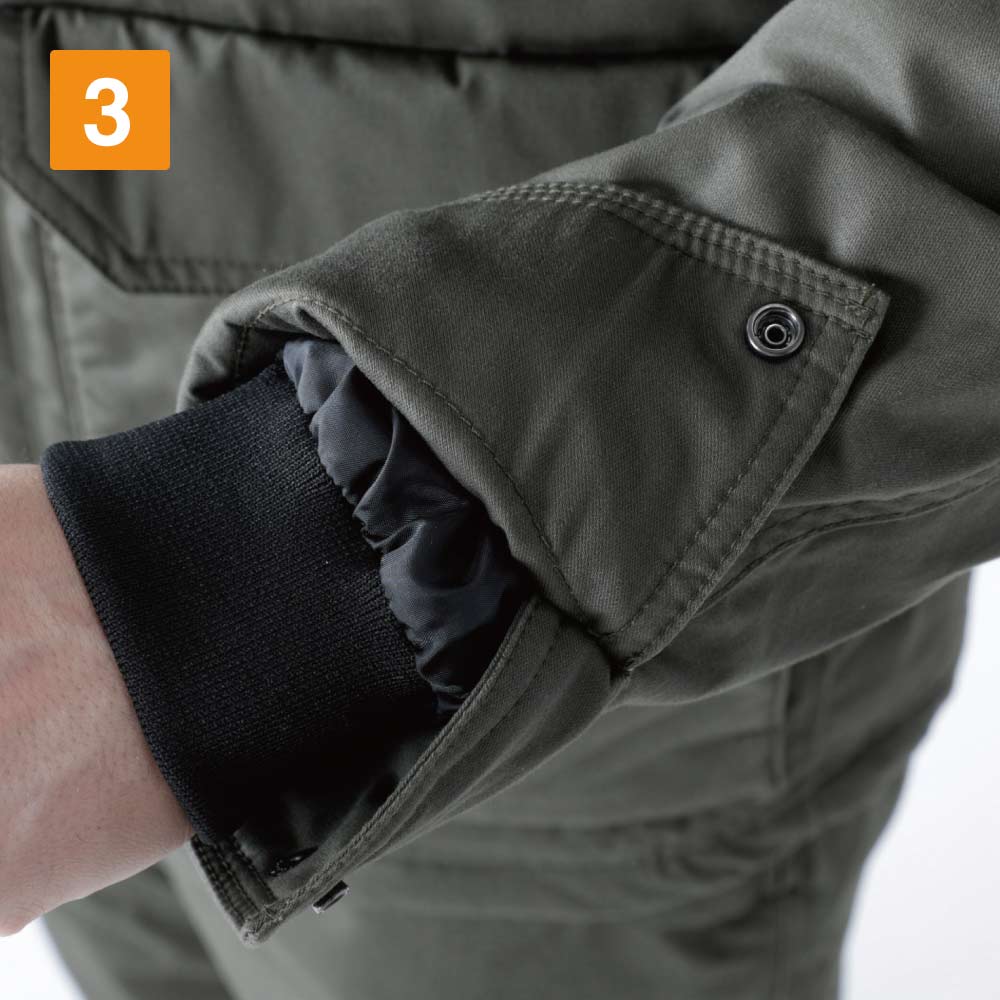 綿100%生地を使用した優しい風合いが特徴のウォームジャケット。使用を重ねるごとに、より肌なじみのいい質感に変化し、心地よさがアップしていく一着です。また防寒面では、中綿を使用し、体温を服の中にしっかりキープ。寒い季節に欠かせないウェアになっています。腰回りはリブ仕様で、服と体のスキマをなくし、ぬくもりをしっかり閉じ込めているのもポイントです。さらに生地に施された撥水加工により、突然の雨をはじいて水濡れから体をガード。屋外でも快適に着用いただけます。