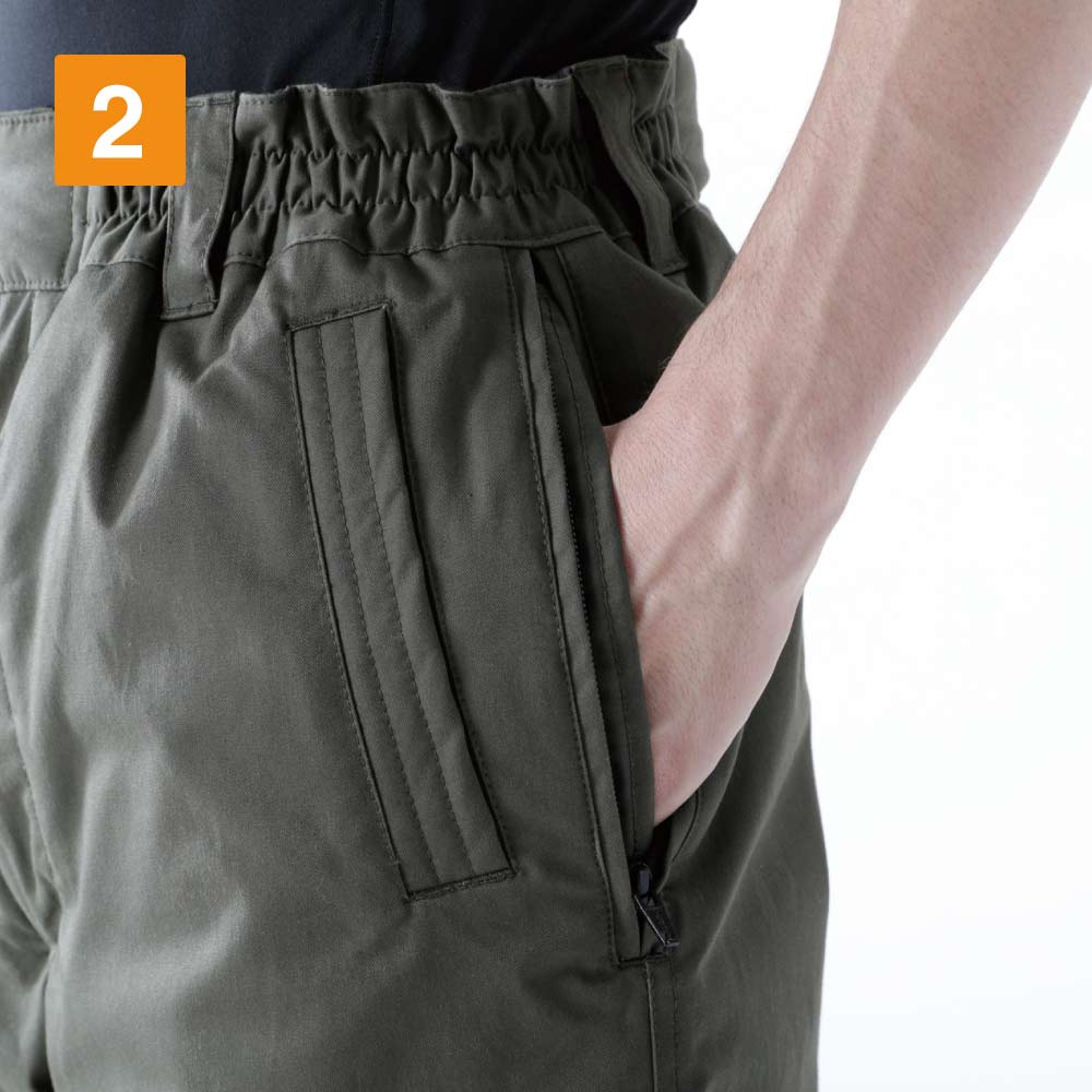 綿100%の素材を使用した、優しい着心地が特徴のウォームパンツです。使い込むことで生地がなじみ、さらに心地よい着心地に変わっていくのも楽しみのひとつ。また、シンプルなデザインですっきりとした印象にまとめつつ、冬場の作業をしっかり支えてくれる機能面も充実した一着です。しっかり入った中綿による優れた保温性能が寒さから体をガード。生地に施された撥水加工によって、不快な水濡れから体を守り、突然の天候の変化にも対応いただけます。