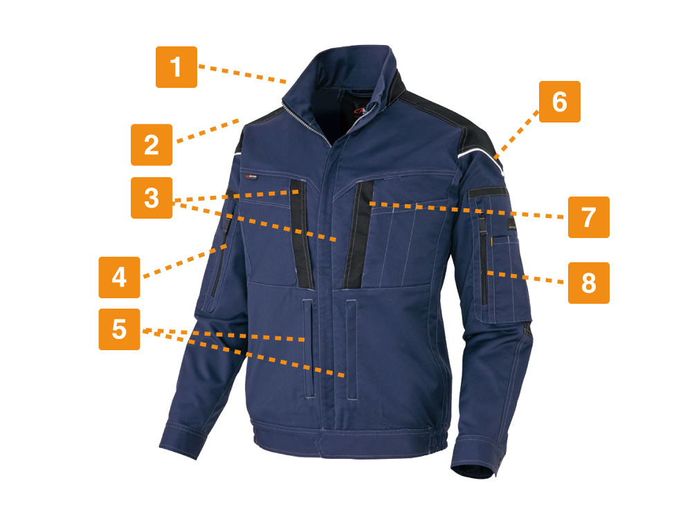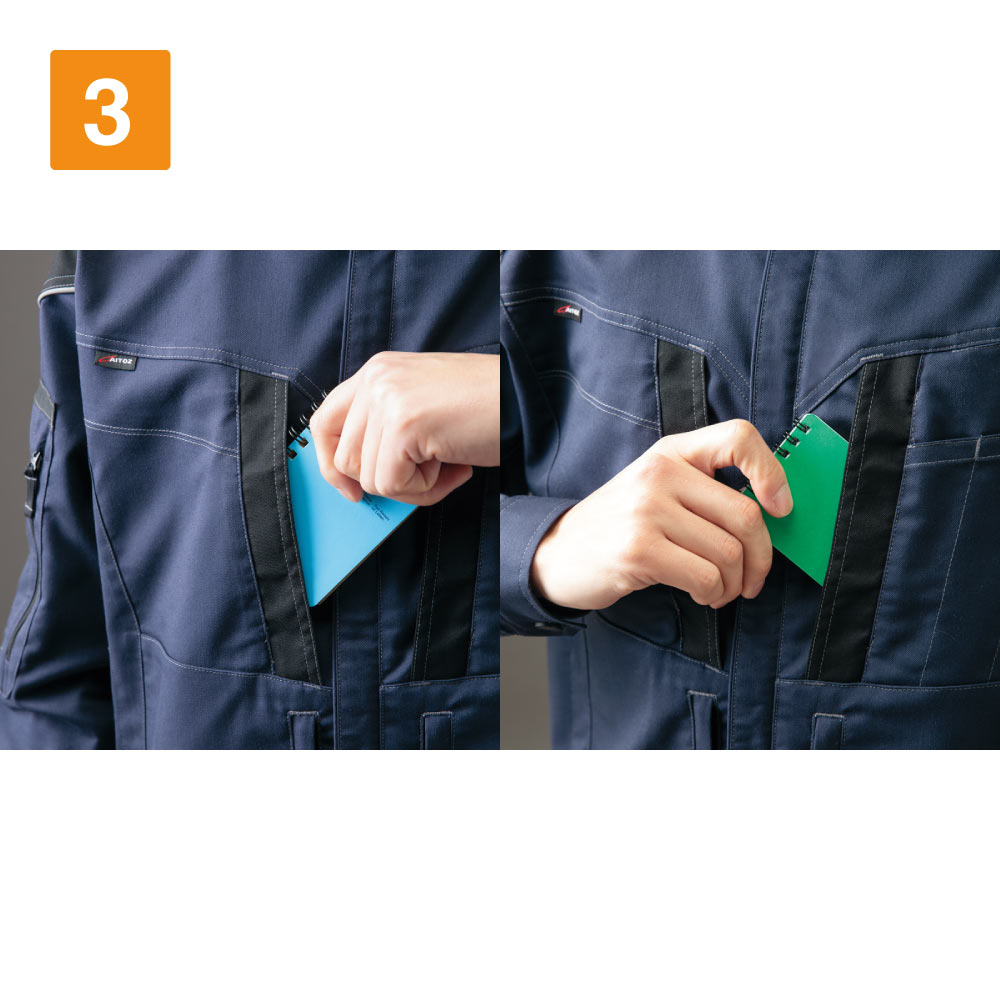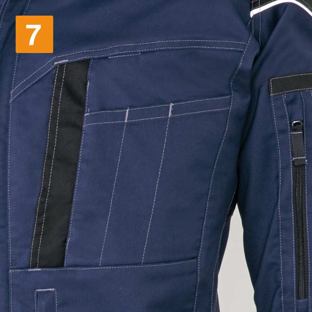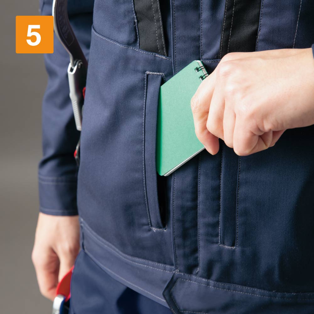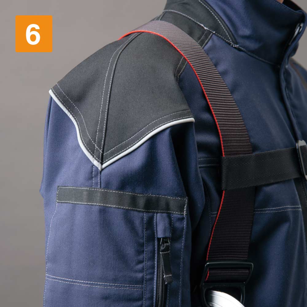 フルハーネスの着用を想定して丁寧に設計されたワークウェアです。生地には摩耗に強く堅牢かつストレッチ性に優れたT/C素材、バンジーテックが使用され、抜群の動きやすさを実現しています。背中部分には生地を立体的に構成するムービンカットが採用されており、前かがみなどの姿勢もラクラク。体を大きく動かす作業にもストレスを感じさせません。軽くて丈夫なため疲れにくいのもポイントです。また、摩耗しやすい肩や襟下、肘などは耐久ストレッチ素材で切り替えることで耐久性をアップ。長く着用いただける一着になっています。