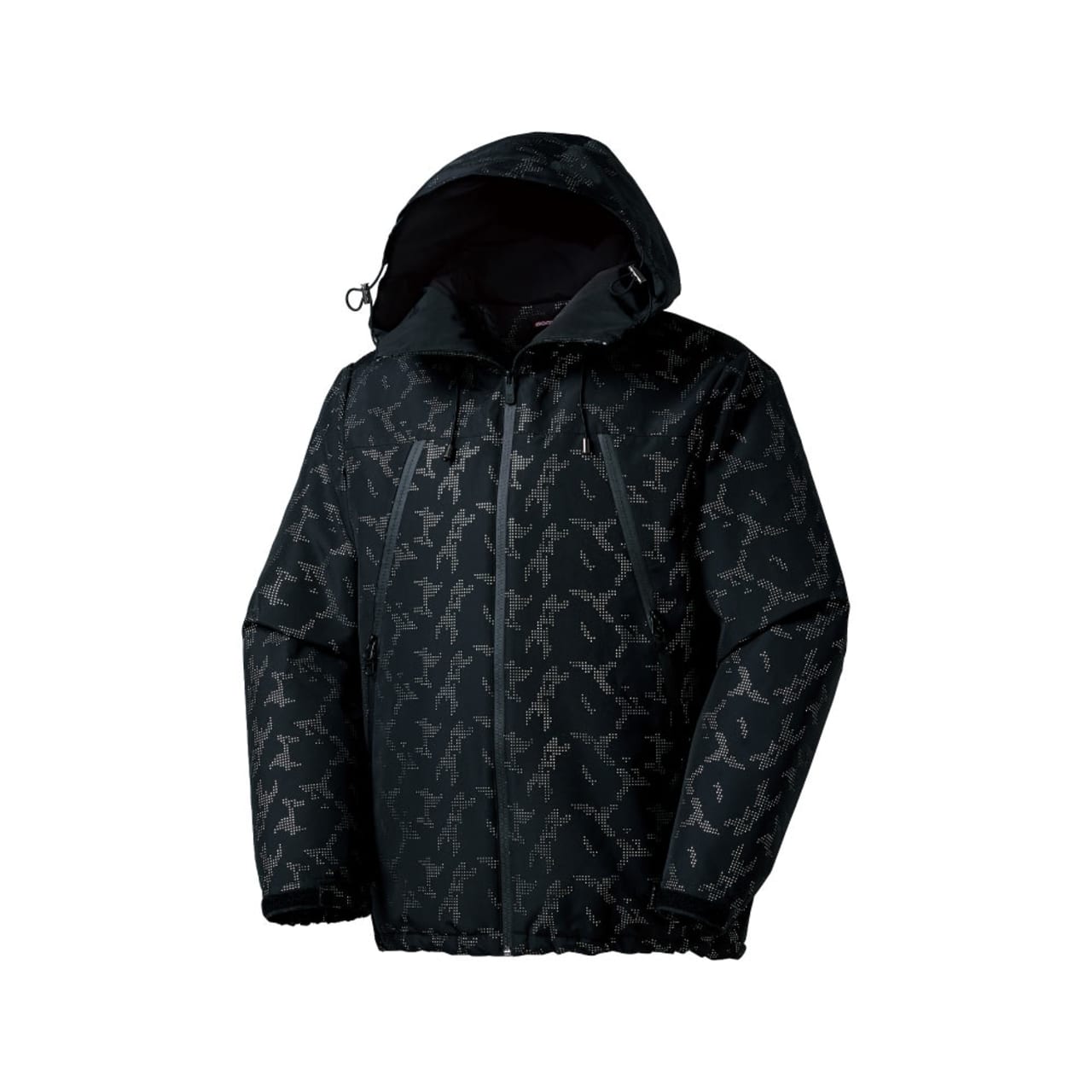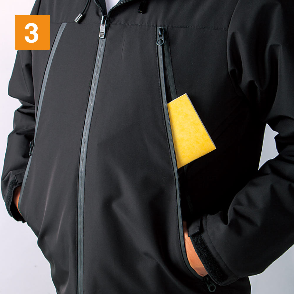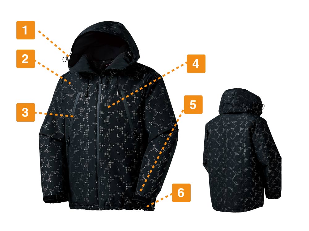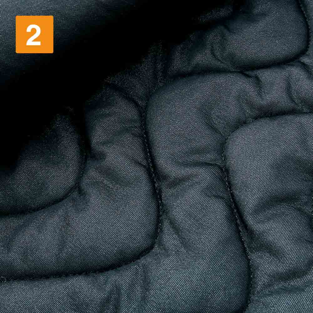 寒さに打ち勝つためのこだわりが素材選びに感じられる、超防寒ワークジャケットです。表地に使用されているのは、なめらかな質感が特徴のデュースポ。マット調で高級感があり、ソフトで心地いい肌ざわりが特徴です。生地は高密度に織り込まれることで、冷気が入りにくくなっています。さらに、表地の裏側にアルミニウムを貼り合わせることで、さらに高レベルの保温性能をプラス。裏地は波形のキルト状に加工が施され、空気層を形成。体温を逃がさずぬくもりをキープしてくれます。