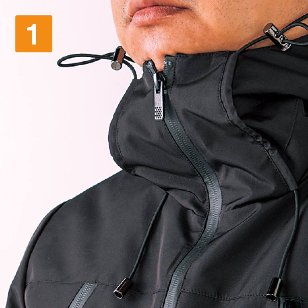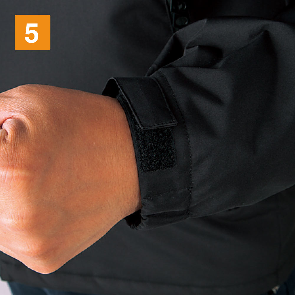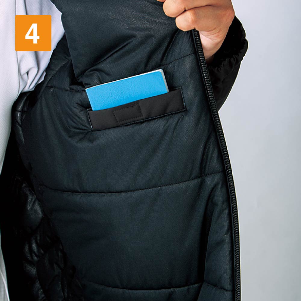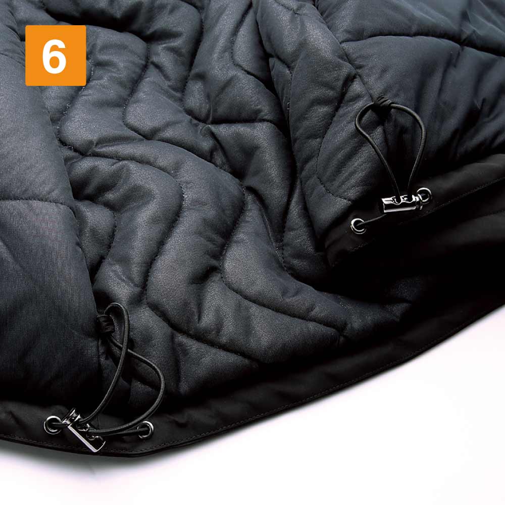 寒さに打ち勝つためのこだわりが素材選びに感じられる、超防寒ワークジャケットです。表地に使用されているのは、なめらかな質感が特徴のデュースポ。マット調で高級感があり、ソフトで心地いい肌ざわりが特徴です。生地は高密度に織り込まれることで、冷気が入りにくくなっています。さらに、表地の裏側にアルミニウムを貼り合わせることで、さらに高レベルの保温性能をプラス。裏地は波形のキルト状に加工が施され、空気層を形成。体温を逃がさずぬくもりをキープしてくれます。