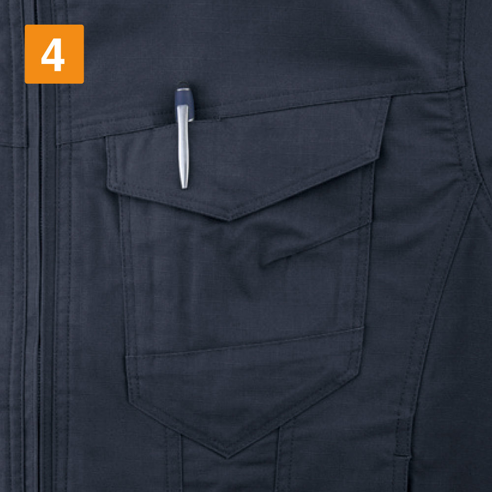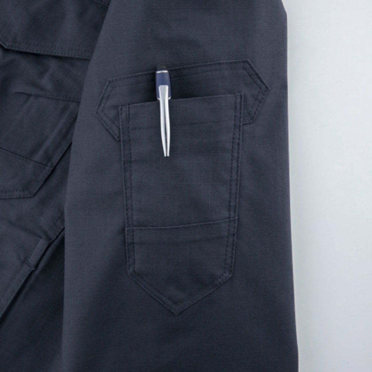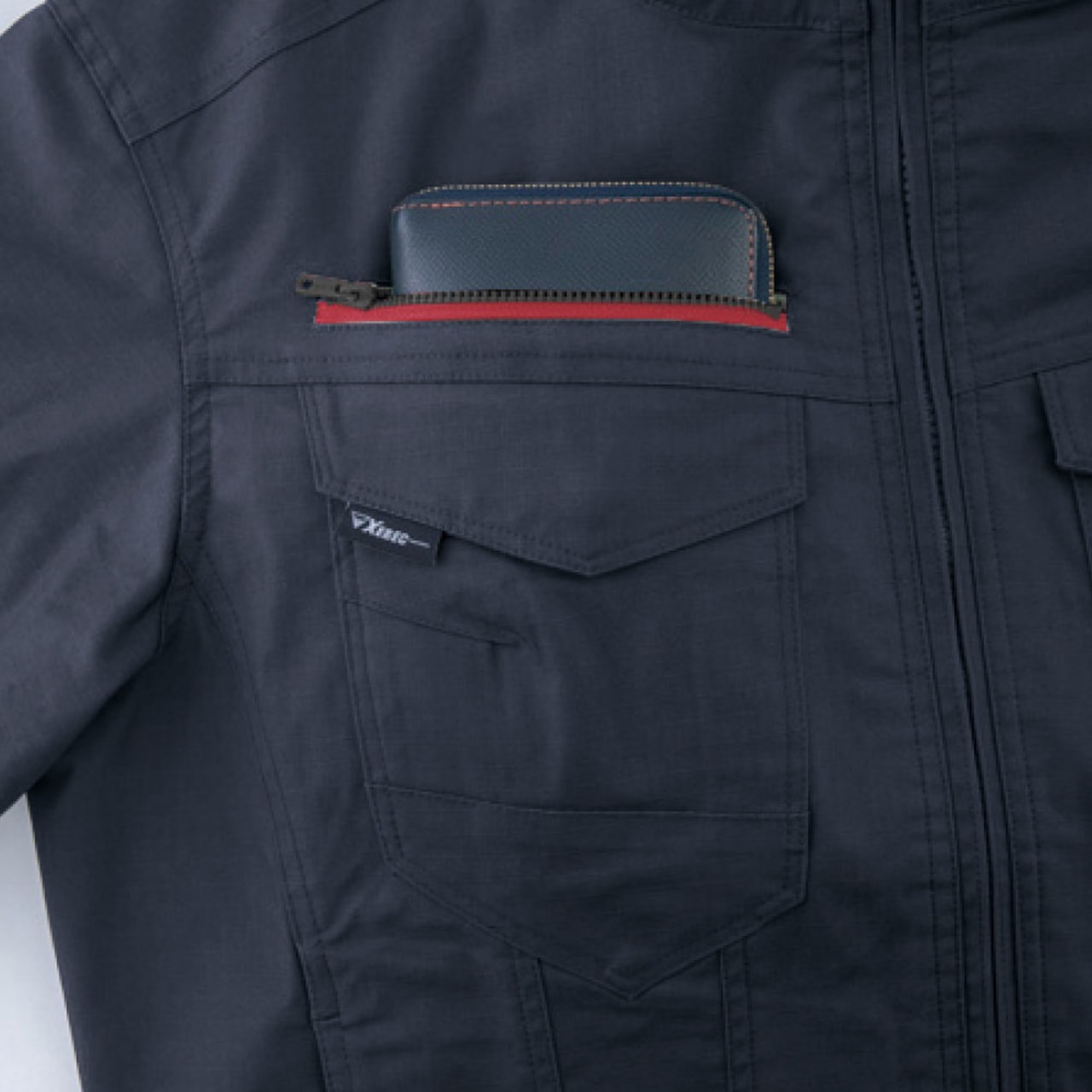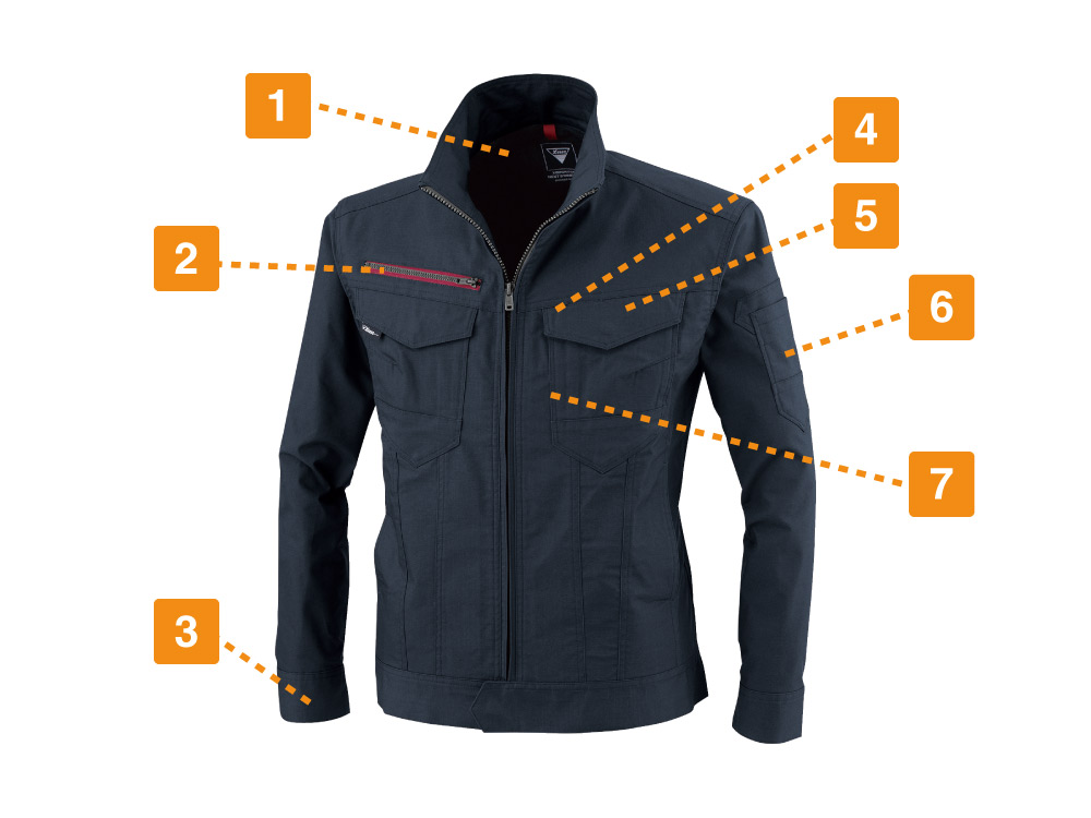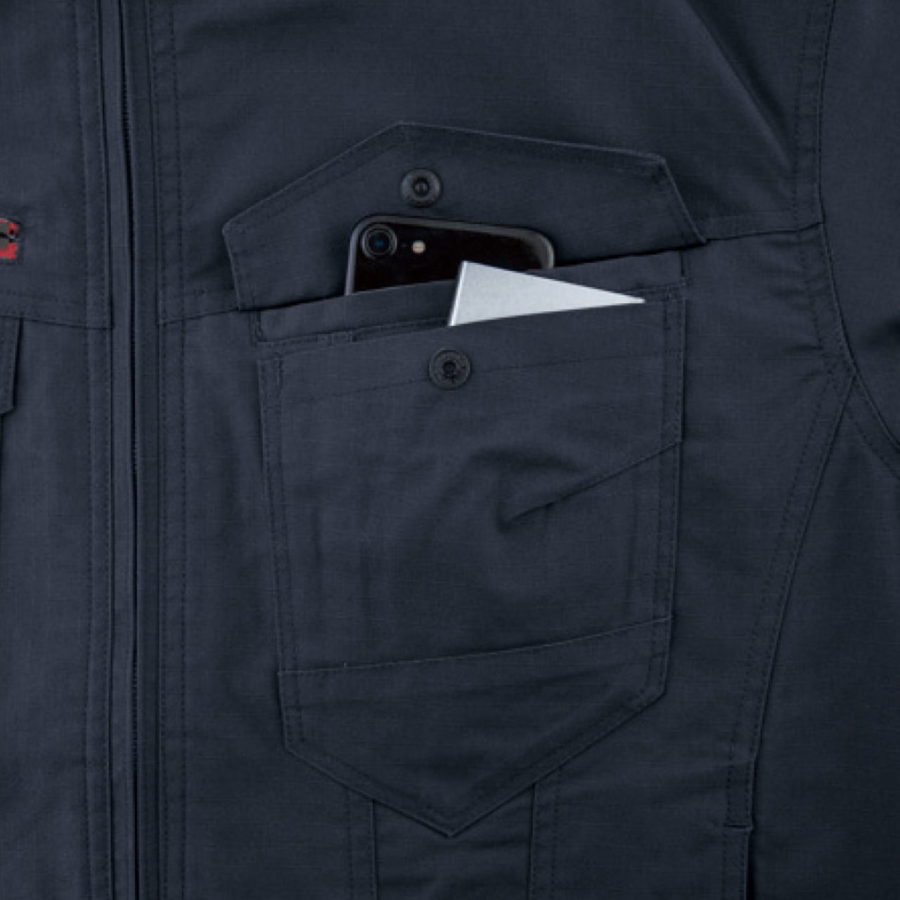 スタイリッシュなデザインに豊富な機能をプラスし、様々な環境下での安全かつ快適な着用を支えてくれる一着です。本体生地として採用されているのは、ひっかきや破れに強いリップストップストレッチ。ストレッチ性に優れ、運動時や現場作業などでもストレスを感じさせません。またJIS規格T-8118に適合した帯電防止性能を備えることで、静電気NGの現場にも対応。さらに背中にはメッシュが使用され、高い通気性で汗をかいても心地よくお過ごしいただけるなど、あらゆるシーンでお仕事を支えてくれるウェアになっています。
