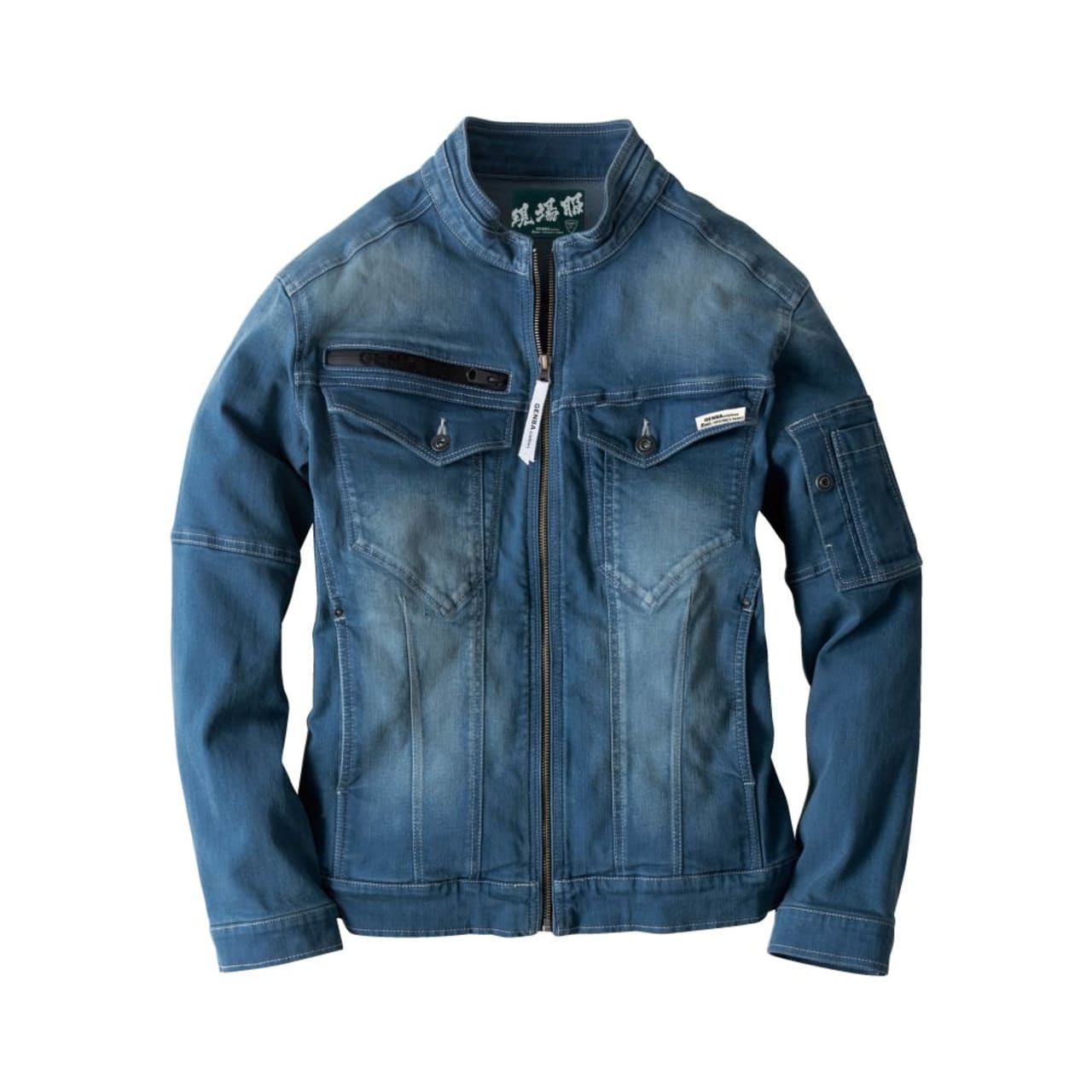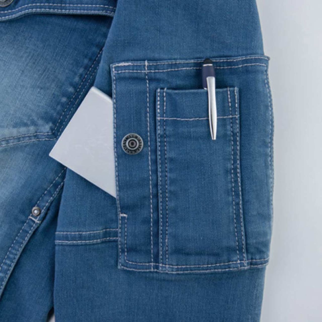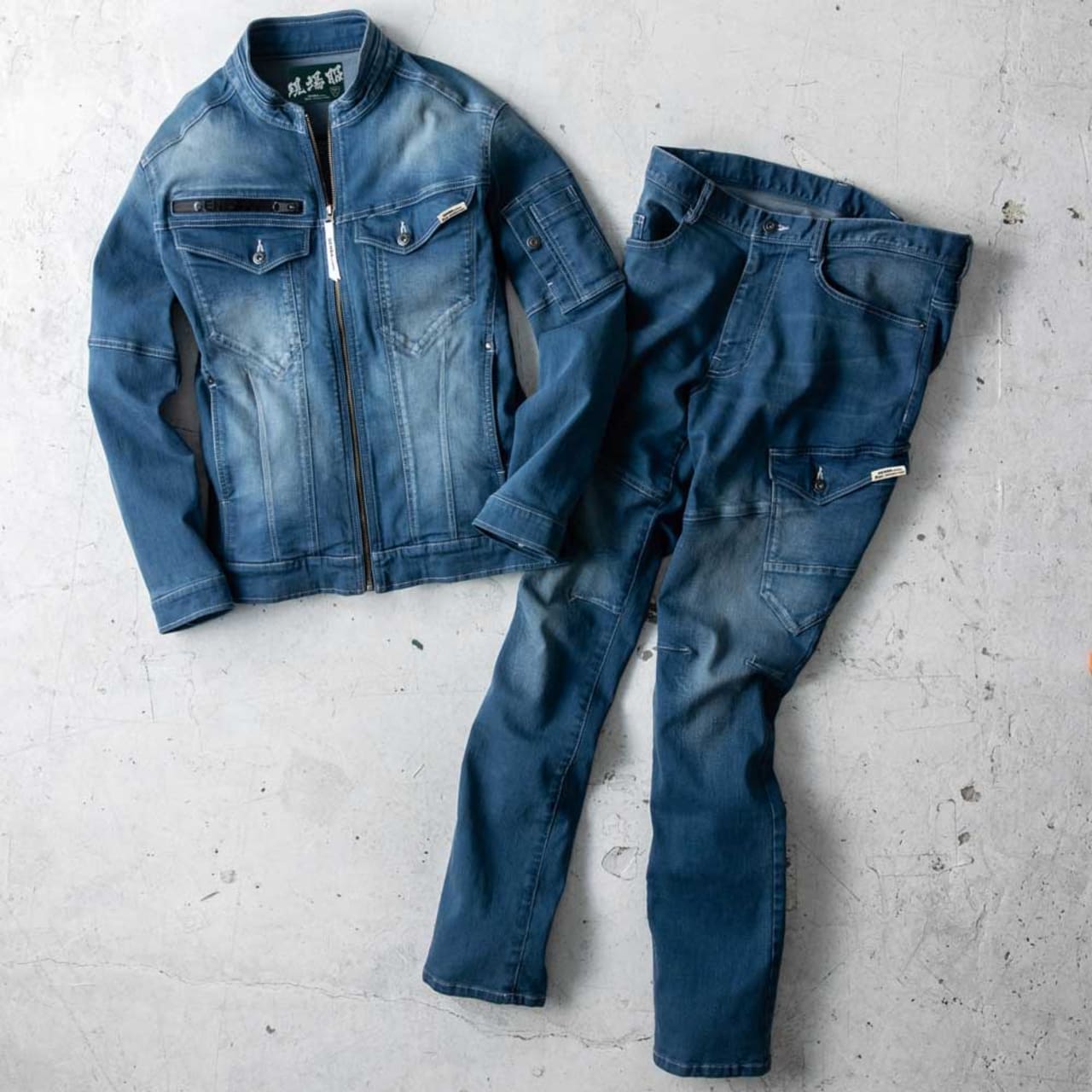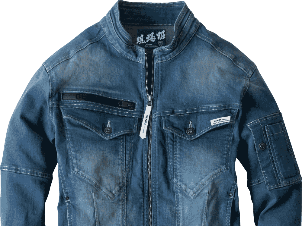 とにかくデザインに注目のデニムワークウェア。生地に使用されているのは、バイオウォッシュとブラスト加工で、こなれた風合いをプラスしたストレッチデニムです。高級感あふれる肉厚素材ながら、抜群のストレッチ性能を両立し、高い作業性を実現しています。デニム生地の切り替えと全体に走るホワイトのステッチが、退屈させないこだわりのルックスを作ります。さらに、フロントのファスナータグや右胸のマットなファスナーがさりげないアクセントに。着込むほどに馴染み、味わい深い一着に育つのも楽しみのひとつです。
