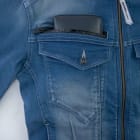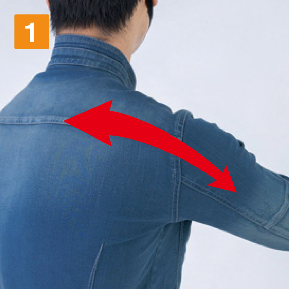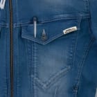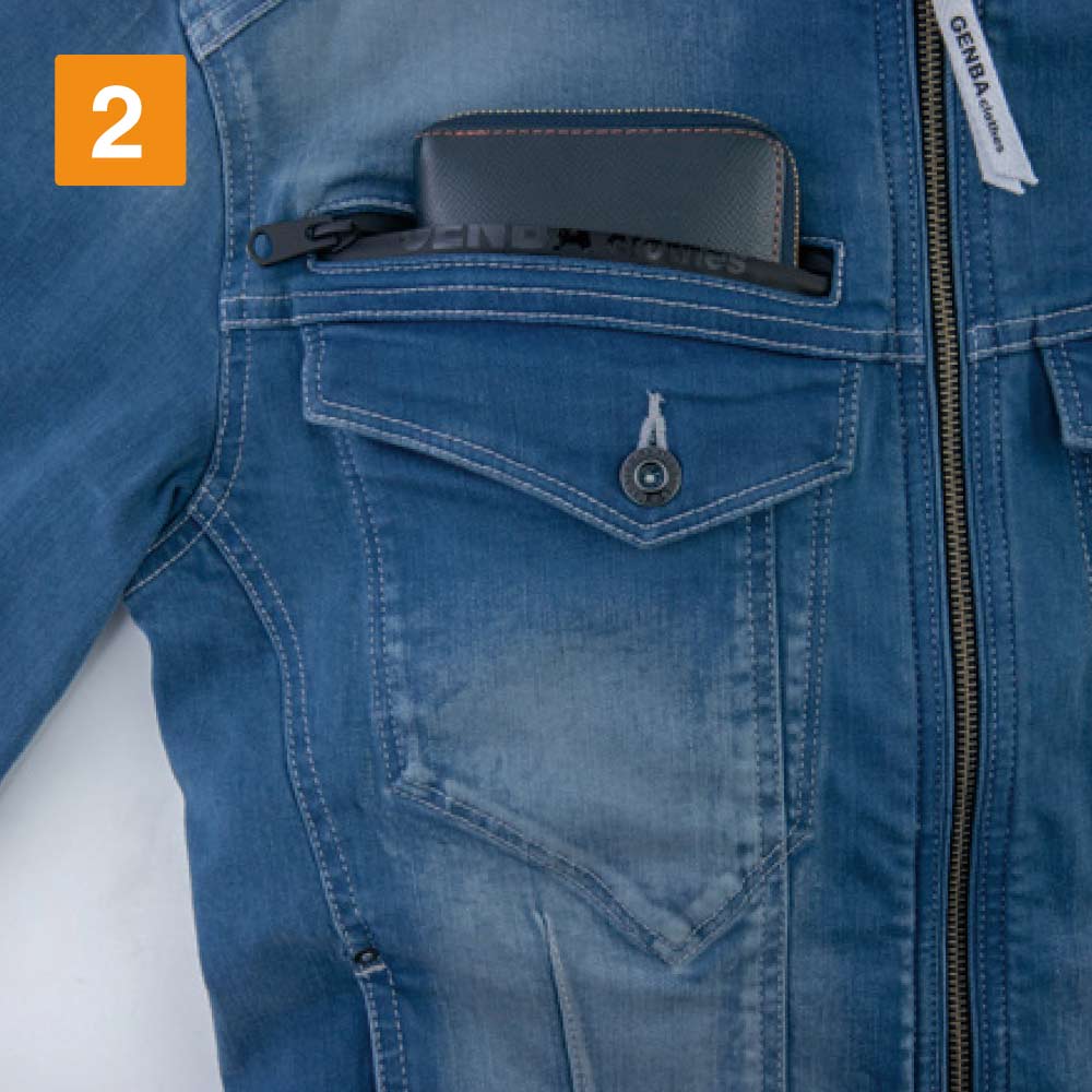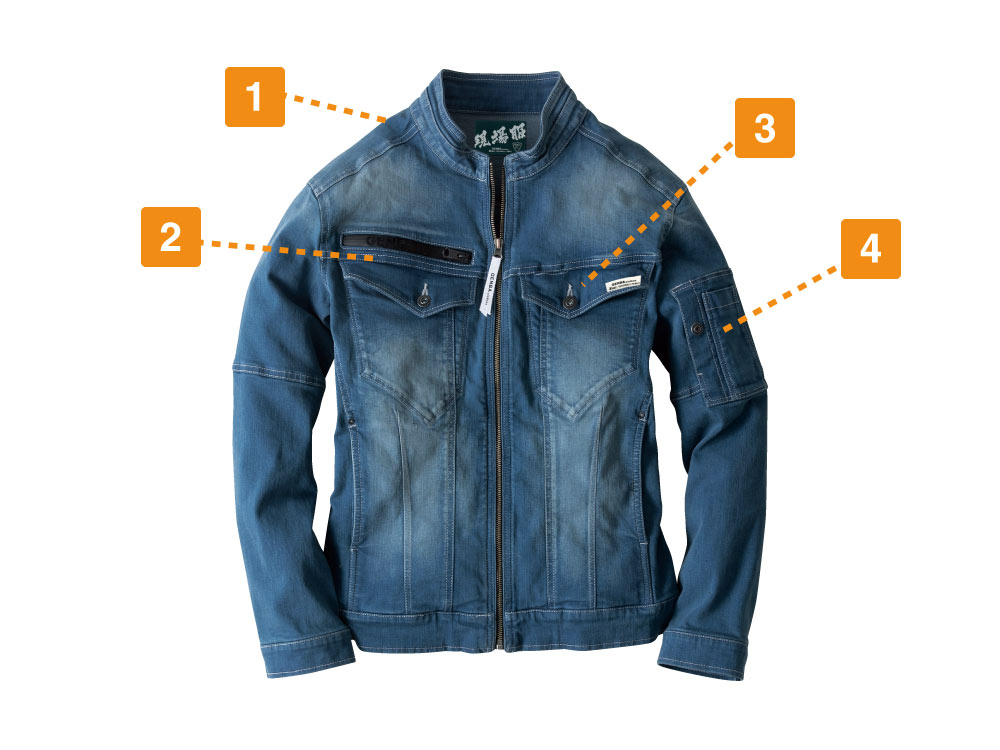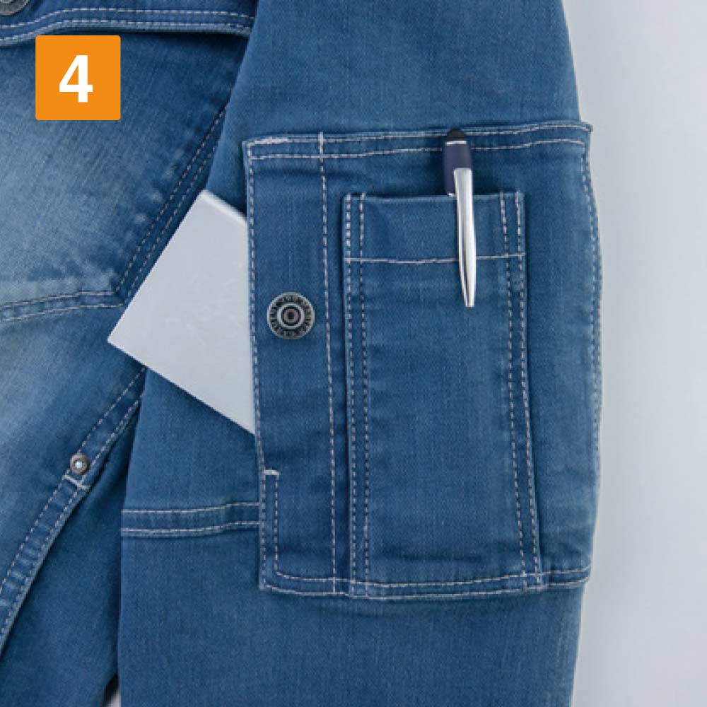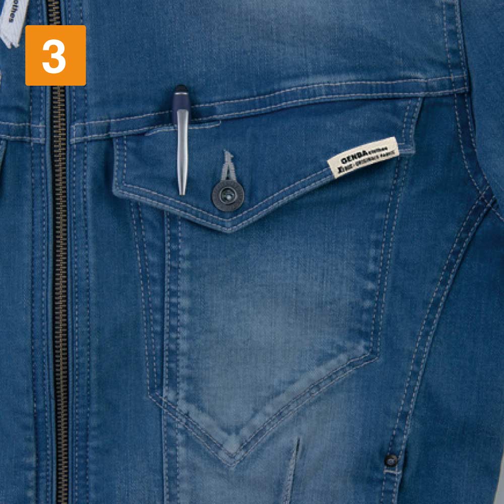 とにかくデザインに注目のデニムワークウェア。生地に使用されているのは、バイオウォッシュとブラスト加工で、こなれた風合いをプラスしたストレッチデニムです。高級感あふれる肉厚素材ながら、抜群のストレッチ性能を両立し、高い作業性を実現しています。デニム生地の切り替えと全体に走るホワイトのステッチが、退屈させないこだわりのルックスを作ります。さらに、フロントのファスナータグや右胸のマットなファスナーがさりげないアクセントに。着込むほどに馴染み、味わい深い一着に育つのも楽しみのひとつです。