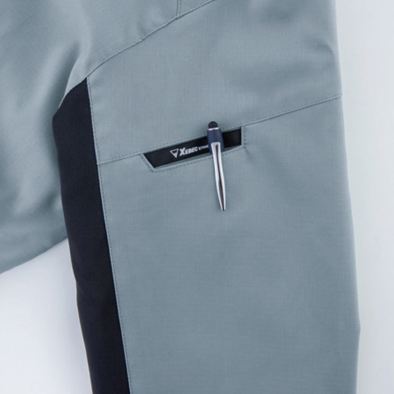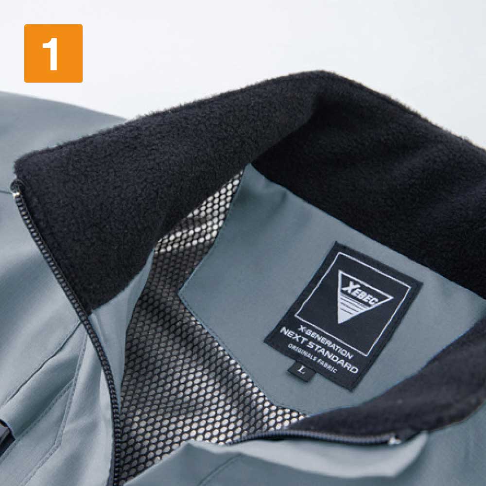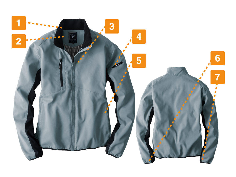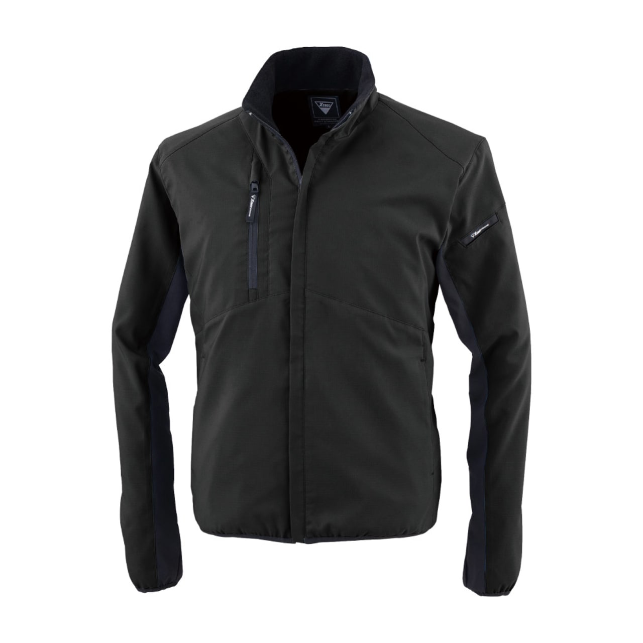 シンプルだからこそどんな職種にもお勧めできる一着です。本体生地に使用されているエコストレッチリップストップは、引っかきや破れに強い高機能生地。ストレッチ性能も備えているので、体を動かす現場作業にもぴったりです。また、撥水加工が施されることで、水や汚れを寄せ付けず、お手入れも楽に行っていただけます。さらに、背当て部分には蓄熱メッシュ、裏地にはトリコット起毛素材が使用されるなど、寒い季節の着用にも配慮がなされています。シンプルながらあらゆる機能を備え、お仕事をサポートしてくれるウェアです。