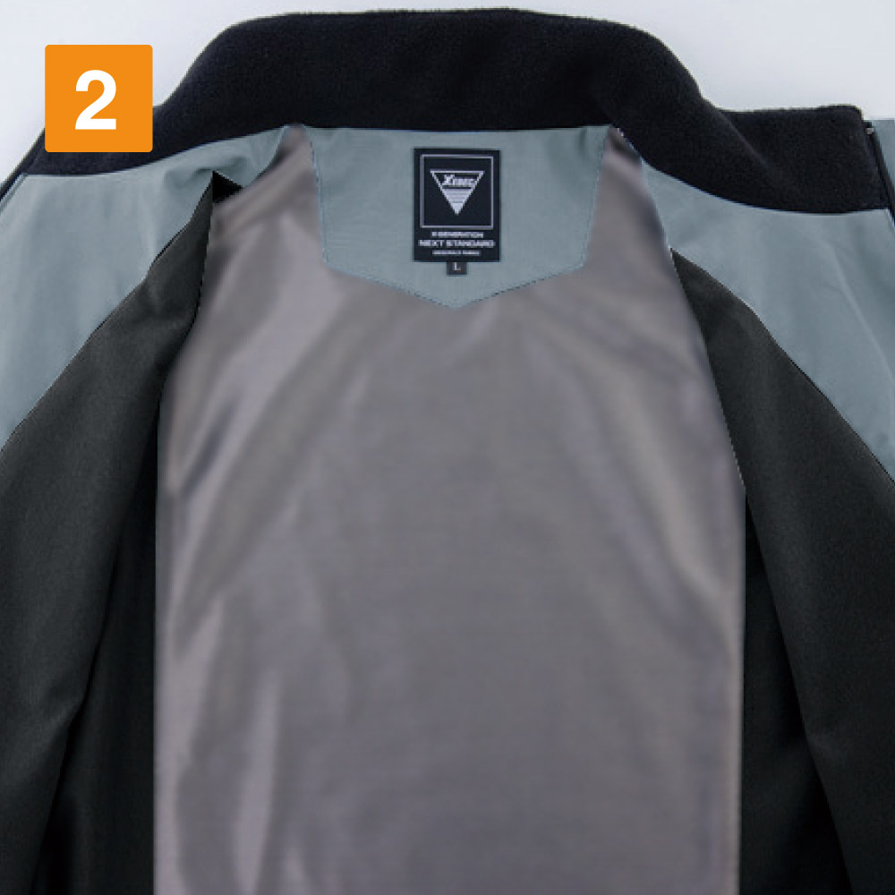 背当て蓄熱メッシュと裏地のトリコット起毛素材で保温性抜群