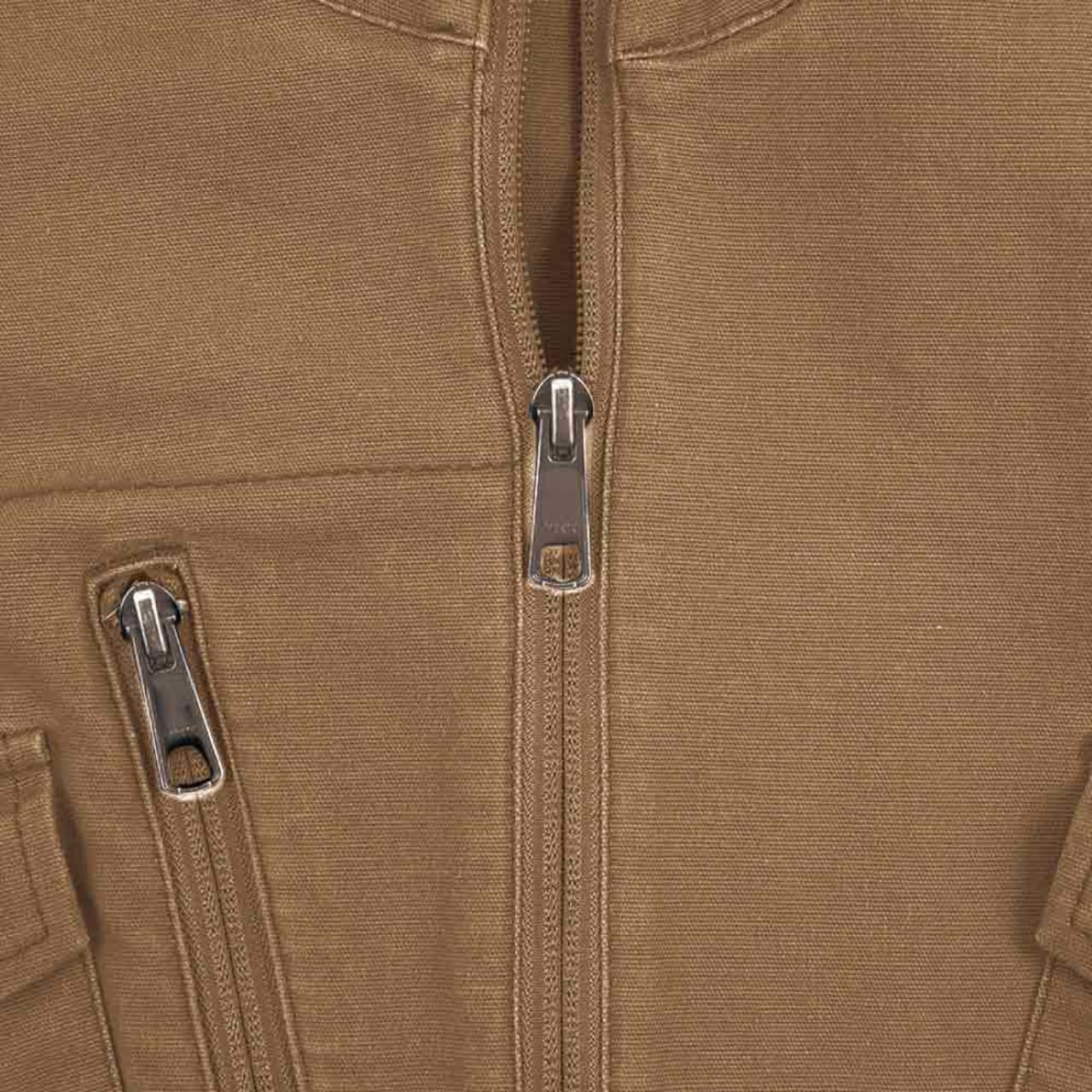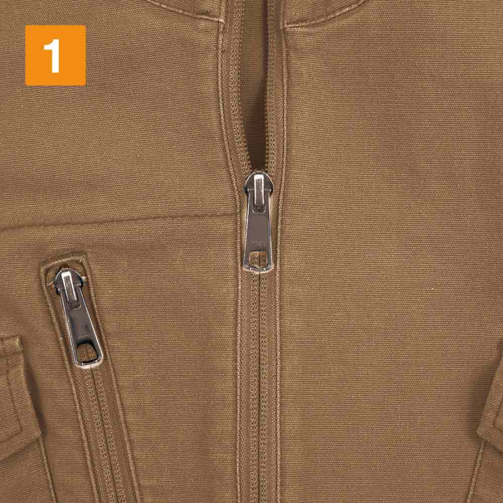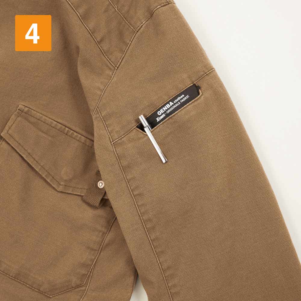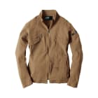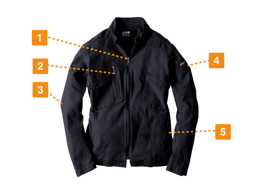 ミリタリー調のデザインと、ライダース風の細身のシルエットがおしゃれなワークジャケット。キャンバス生地にオイルタッチの特殊コーティングを加え、さらに洗い加工を施すことで、味わい深い風合いを実現した一着です。またキャンバス生地でありながら、抜群のストレッチ性能を備えているのもポイント。胴体のひねりや腕の上げ下げにも生地が追従し、現場作業もノンストレスに行えます。また、肘部分には立体的なカッティングが施されることで、肘の曲げ伸ばしもよりスムーズに。かっこいいだけでなく作業性にもこだわった一着です。