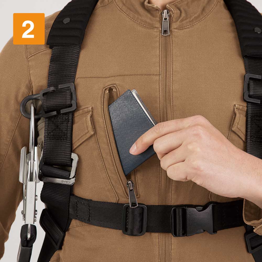 フルハーネスをしたままでも使える右胸ファスナーポケット
