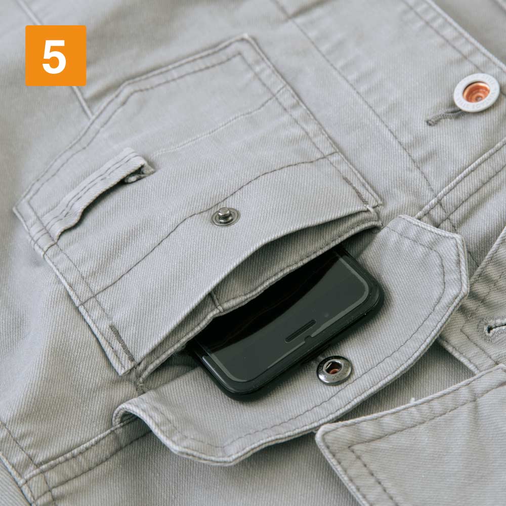 左胸ダブルポケットで長物・スマホポケットにピッタリ