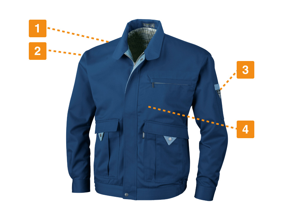 定番のデザインに、様々な環境下で快適に着用できるようたくさんの機能をプラスしたワークブルゾンです。本体生地に使用されているのは、ポリエステル&綿を混紡した丈夫な素材、ソフトツイル。ソフトの名の通り、やわらかな着心地が魅力で、作業着にありがちなずっしりとした硬さがありません。また、帯電防止素材を使用することで、冬場も不快な静電気が発生しにくくなっているのもポイント。さらに撥水加工が施されており、水や汚れがしみこみにくく、屋外作業時の天候の変化にも慌てず対応いただけます。