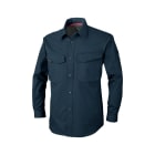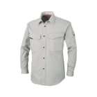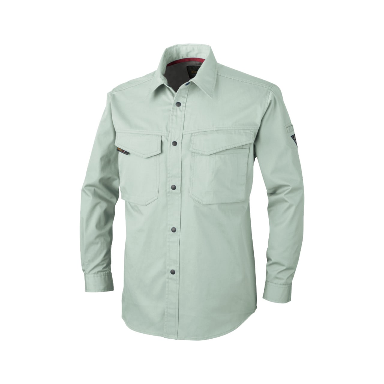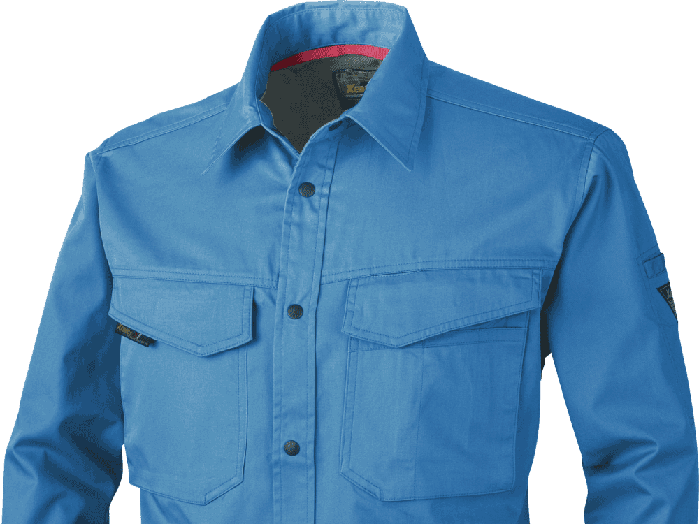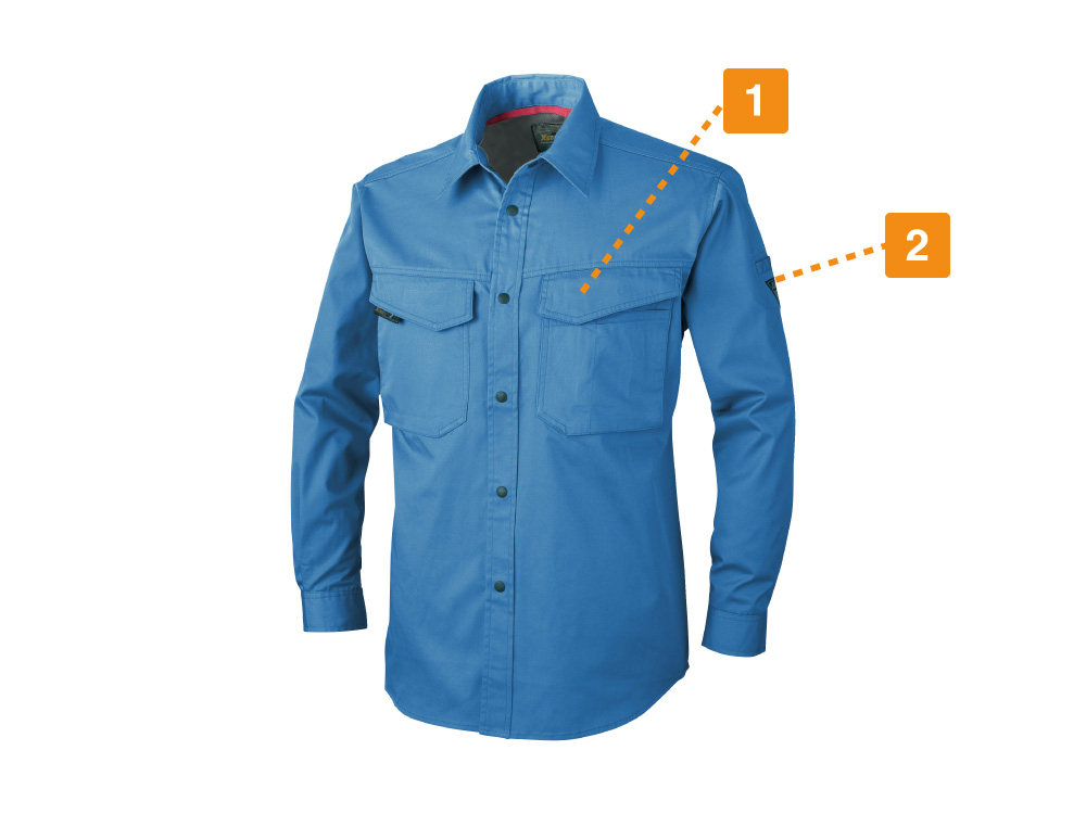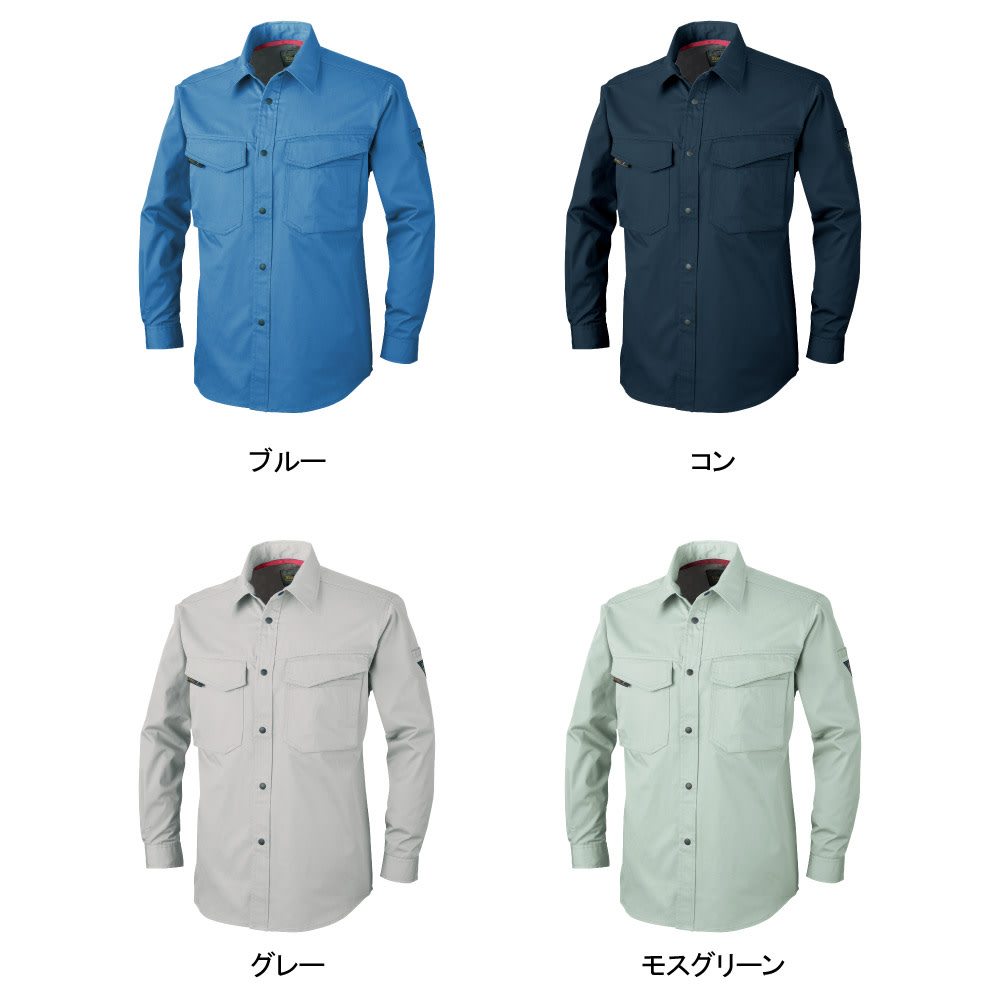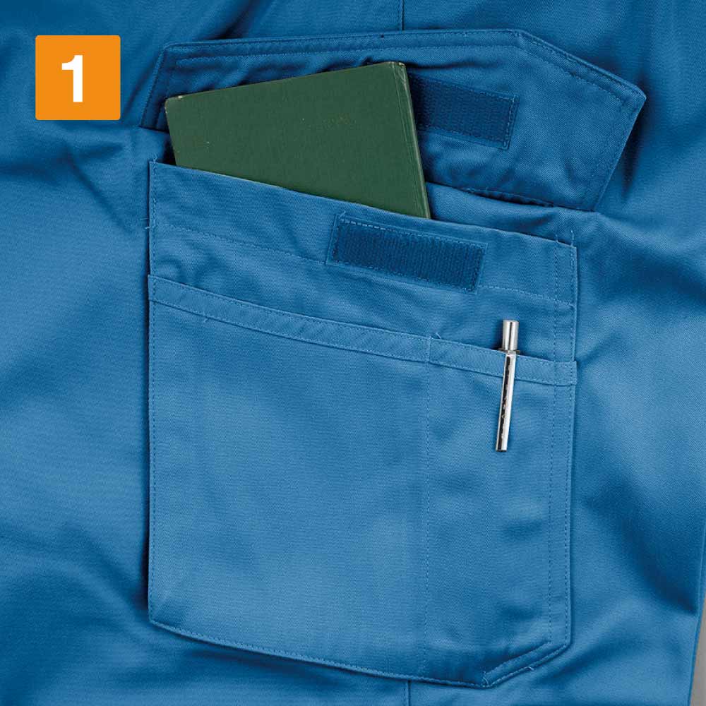 ベーシックなデザインと、快適な着心地で定番の人気を誇るワークシャツです。また、収納面にも注目のウェア。両胸は面ファスナーで閉じられるフラップポケットが採用され、開けやすく物が落下しにくい、優れた使い勝手を実現しています。また、左胸ポケットがペンや小物を仕分けて収納できるマルチポケットになっているのもポイント。さらに、左袖にもペン差しを備えることで、筆記の多いお仕事にもぴったりの一着になっています。
