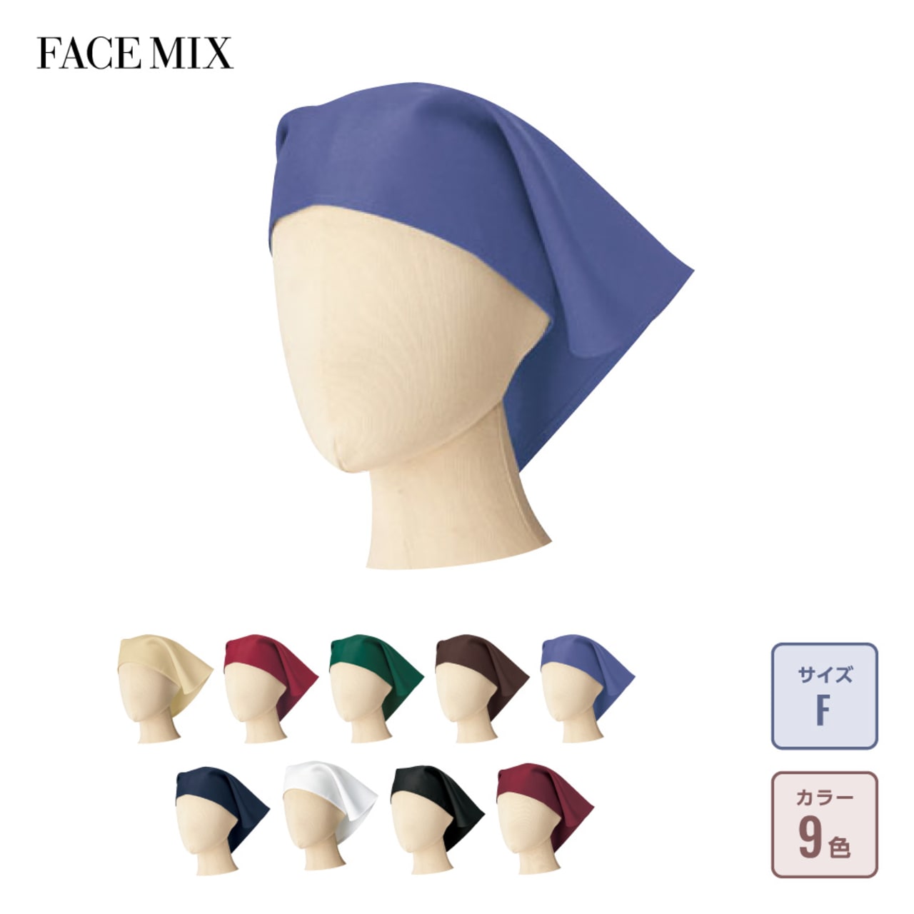既存の三角巾の印象を、よりスマートに、よりおしゃれなものへと革新。モダンなショップにもマッチする洗練されたアイテムです。モノトーンやニュアンスカラーといった、トレンドのカラーラインナップ9色を取り揃え、年齢や男女を問わずおしゃれに見せてくれる三角巾に仕上がっています。また、ゴム付きで被るだけのワンタッチで着用できるのもポイント。後ろの三角部分を垂らす、もしくは巻き込むの2種類の方法で着用でき、お店の個性に合わせた着こなしが可能です。