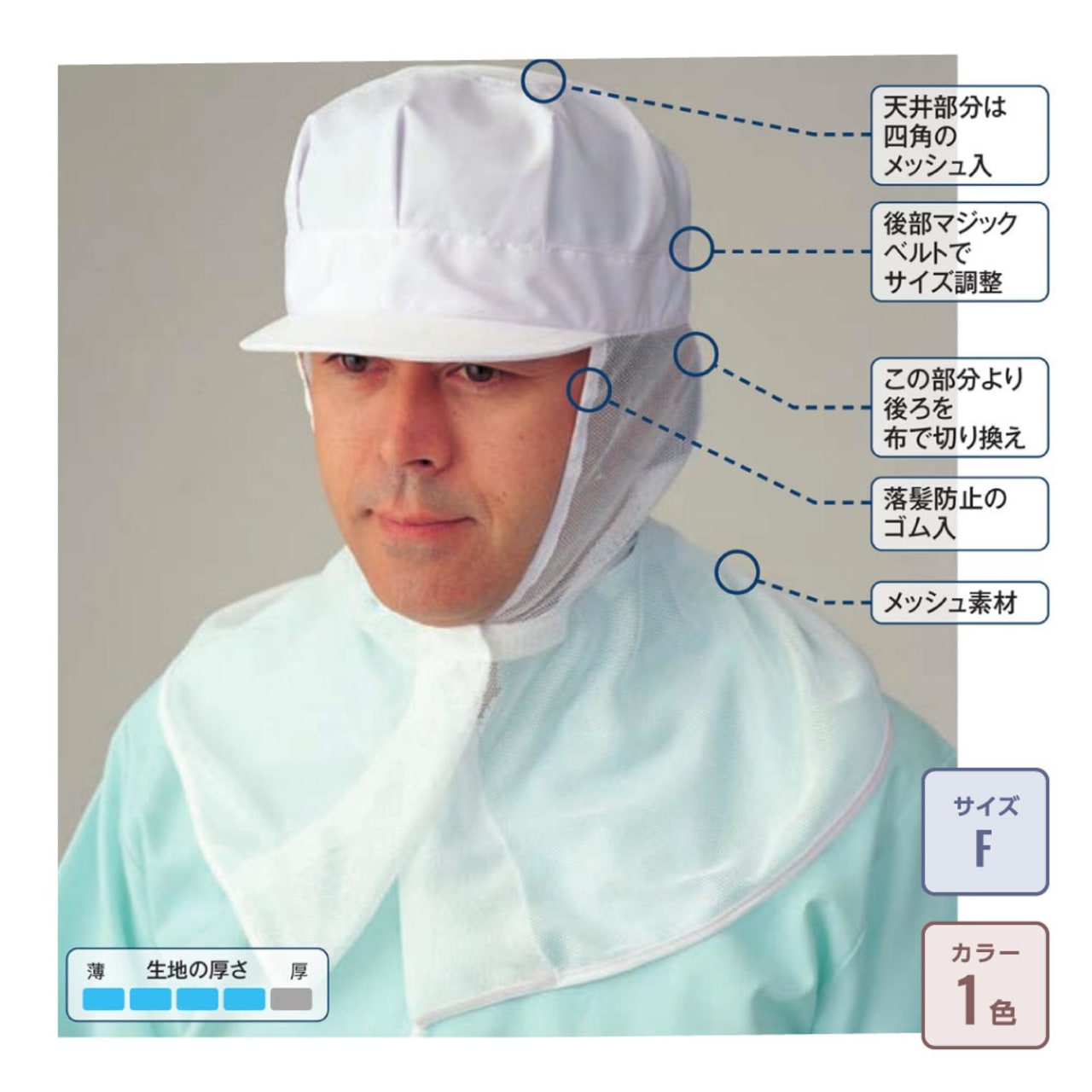 メッシュをふんだんに使用することで、蒸れにくく快適な着用感を実現した作業帽です。定番デザインでクリーンな印象にしてくれるだけでなく、肩まで覆われたケープや、生地の持つ抗菌性能で清潔に着用いただけます。カラーは清潔感のあるお仕事姿を演出する白と、同仕様で品番の異なるサックスの2種類からお選びいただけます。サイズはフリーサイズと大柄な型にも対応したXLの2サイズ展開。帽子後部のマジックベルトでサイズ調整可能で、2サイズ合わせて頭囲55cm~61cmまでの幅広い頭囲にジャストフィットします。