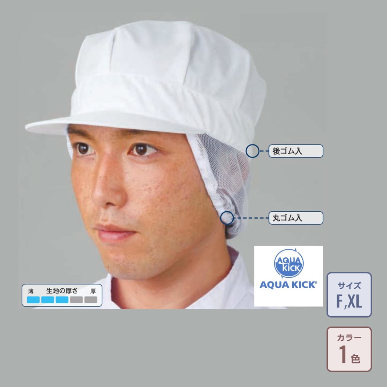 シンプルながら、高機能生地を使用することで驚きの快適性や使い勝手を付与した作業帽。生地には、優れた防汚性能を持つ素材、AQUA KICKが採用されています。洗濯に必要な水や洗剤の量を減らし、環境負荷が低減できる素材で、工業洗濯にも対応するなどタフさもポイントです。また、生地自体も汚れがつきにくくなっており、特に調味料関係の汚れに対し高い防汚効果を発揮します。また、帽子下部分のメッシュが優れた通気性を備えることで、いつも爽やかな着用感を実現!汗をかいても蒸れにくく、快適な作業をアシストしてくれます。