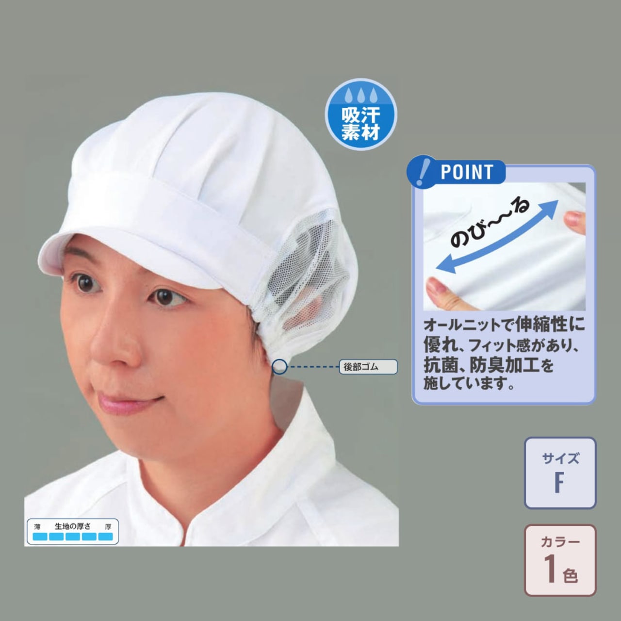 ニット生地を使用することで、伸縮性による心地いいフィット感をプラスした作業帽です。また、夏場や厨房など、高温になる環境下での快適な着用にも対応しています。ニット生地の持つ吸汗性と速乾性で、帽子内が蒸れにくく、被っている間中さらりと快適な着用感が持続。細菌の繫殖を抑える抗菌素材を使用することで、さらに清潔に着用可能です。また、防臭性能を備えており、不快なニオイの原因となる菌の繁殖を抑えることで、一日中快適にお過ごしいただけます。