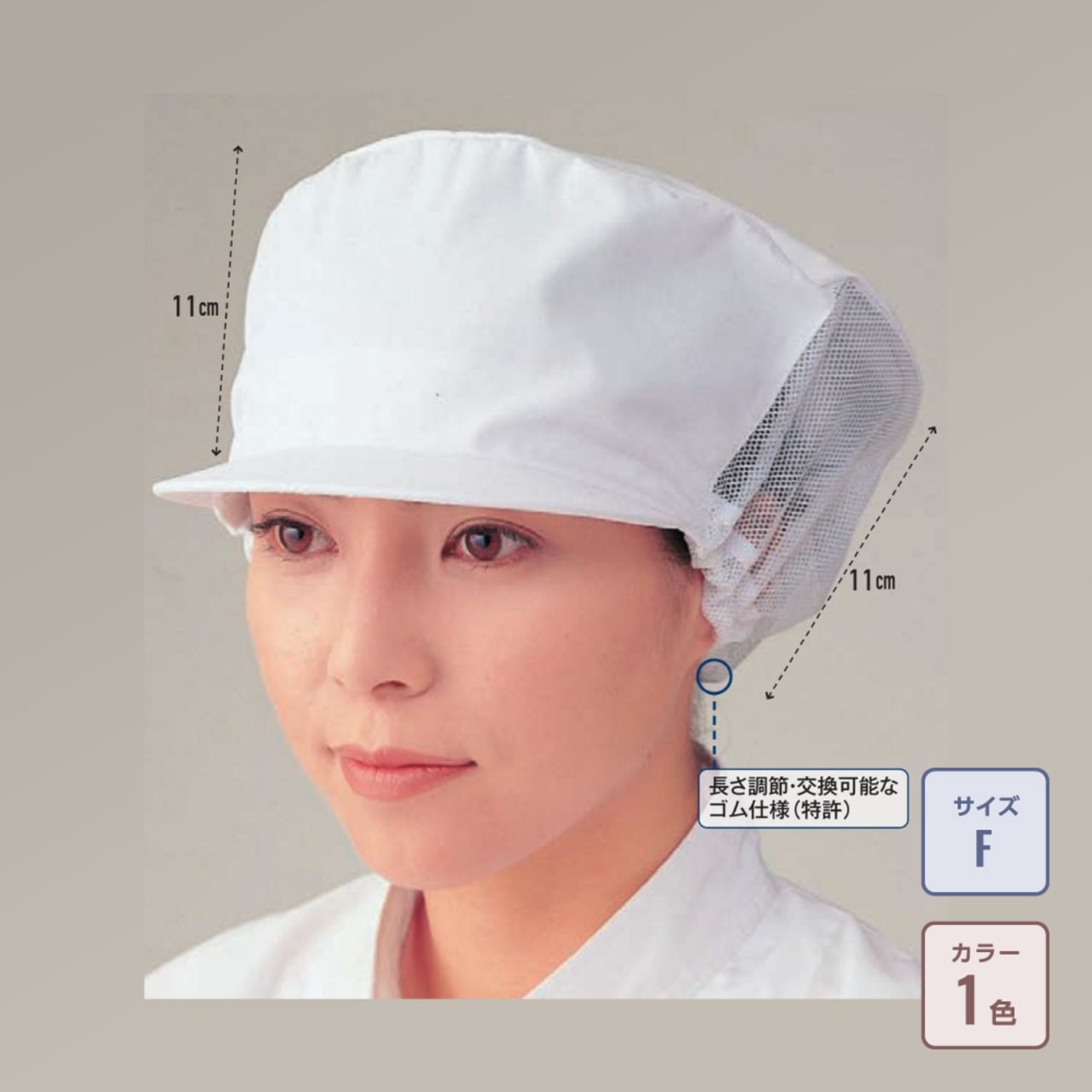 ゆったりとした設計で、ストレスなく被れる作業帽。メッシュによる通気性や、抗菌素材による清潔さも備えるなど機能面も充実しています。サイズは伸縮性を備えたフリーサイズ。最大で頭囲65cmまで対応し、長さ調整のできるゴムで頭にジャストフィットします。豊富なカラーラインナップも人気のポイント。カラーは白に、同じ仕様で品番の異なるサックス・グリーン・ピンクを合わせた4色から、職場の雰囲気やお仕事内容に合わせてお選びいただけます。加工にも対応し、帽子前面に企業ロゴなどのプリントや刺繍を施すことで、オリジナルアイテムの制作も可能です。