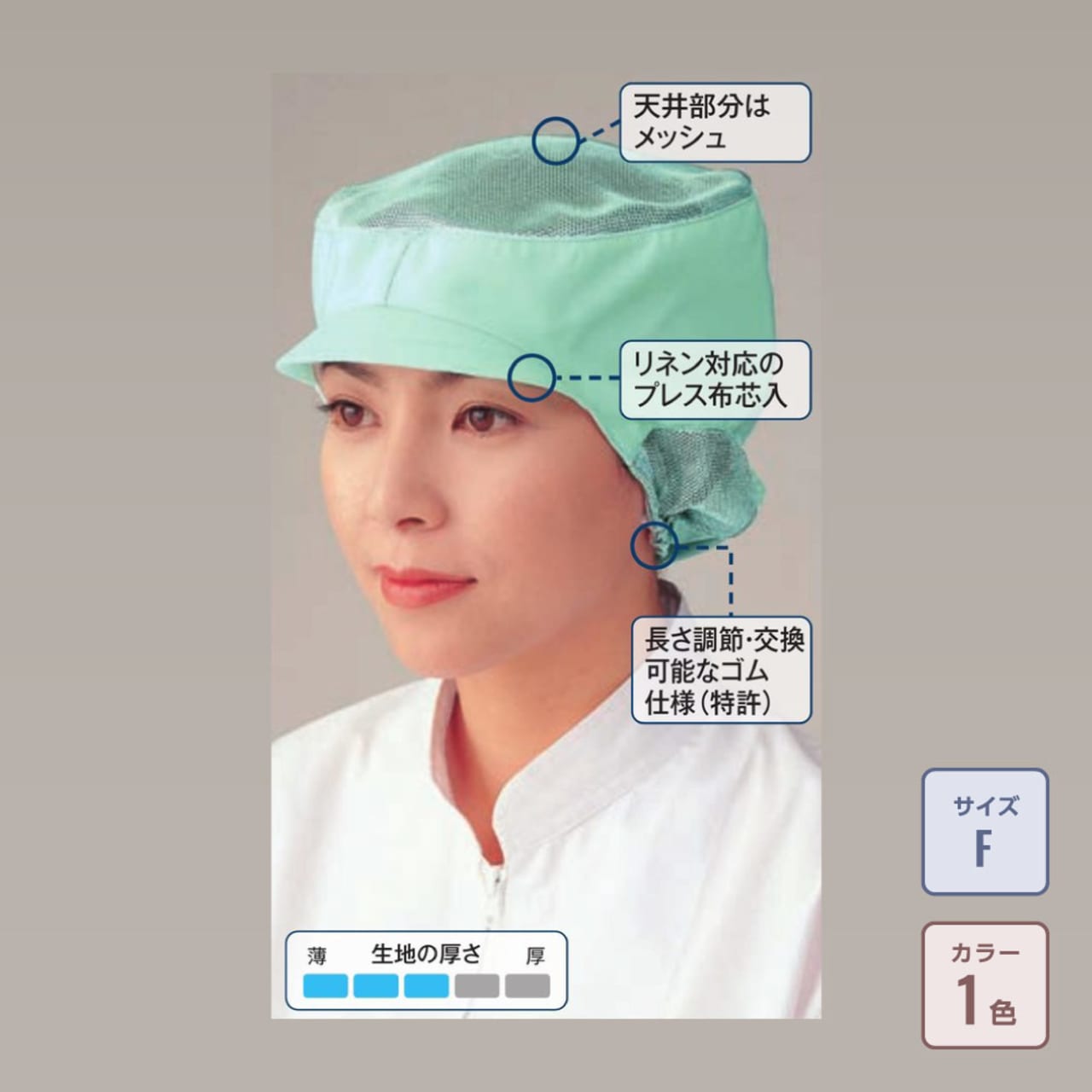 天井部分をオールメッシュとした、高い通気性が特徴の作業帽です。また、高い抗菌性能を持つ生地を使用し、衛生面でも優れた実力を備えています。サイズはフリーサイズで、長さ調整可能なゴムが最大65cmまで伸縮し、幅広い頭囲にフィットしてくれます。作業中もずれにくく、ストレスを感じさせません。ゴムは交換も可能で、お好みのフィット感に調整できるのもポイント。カラーはグリーンと、同仕様で品番の異なる白、サックス、ピンクの豊富な4色からお選びいただけます。