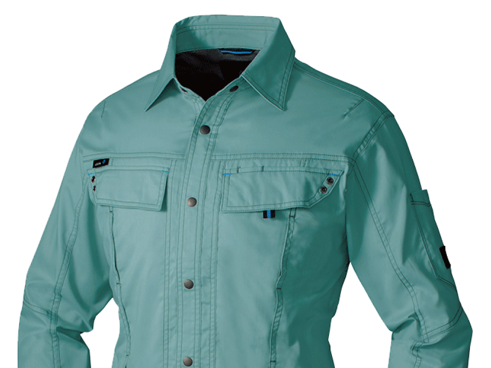 動きやすさと快適な着心地にとことんこだわったワークシャツ。本体生地は軽やかな着用感とストレッチ性能が魅力のライトストレッチツイル。生地が体の動きに追従し、抜群の動きやすさを実現しています。加えて、背中部分にアクションプリーツが設けられることで、腕の可動域を大幅アップ。 肘部分にもタックがとられており、肘の曲げ伸ばしもスムーズです。また、前身頃と背中にベンチレーションが設けられることで、服内部の蒸れた空気を常時外に排出。汗をかくお仕事でも快適な着用感が持続します。さらに、生地は不快な静電気の発生を抑える帯電防止性能を備えています。