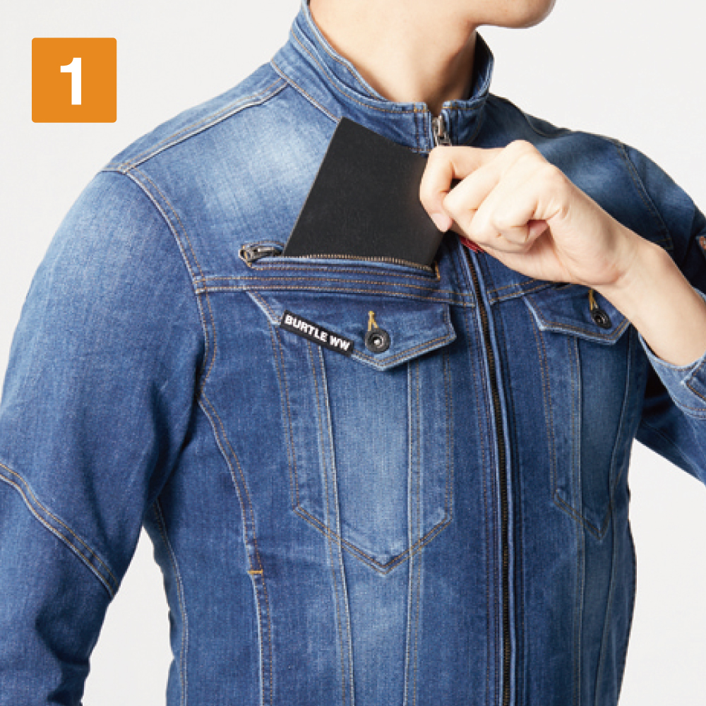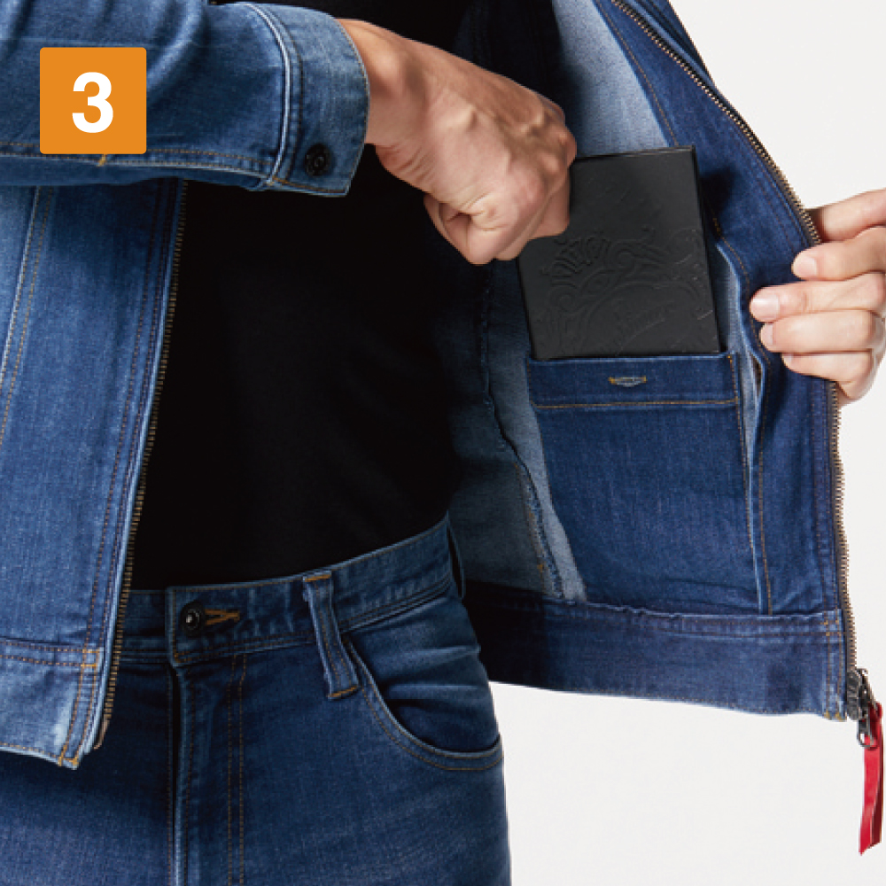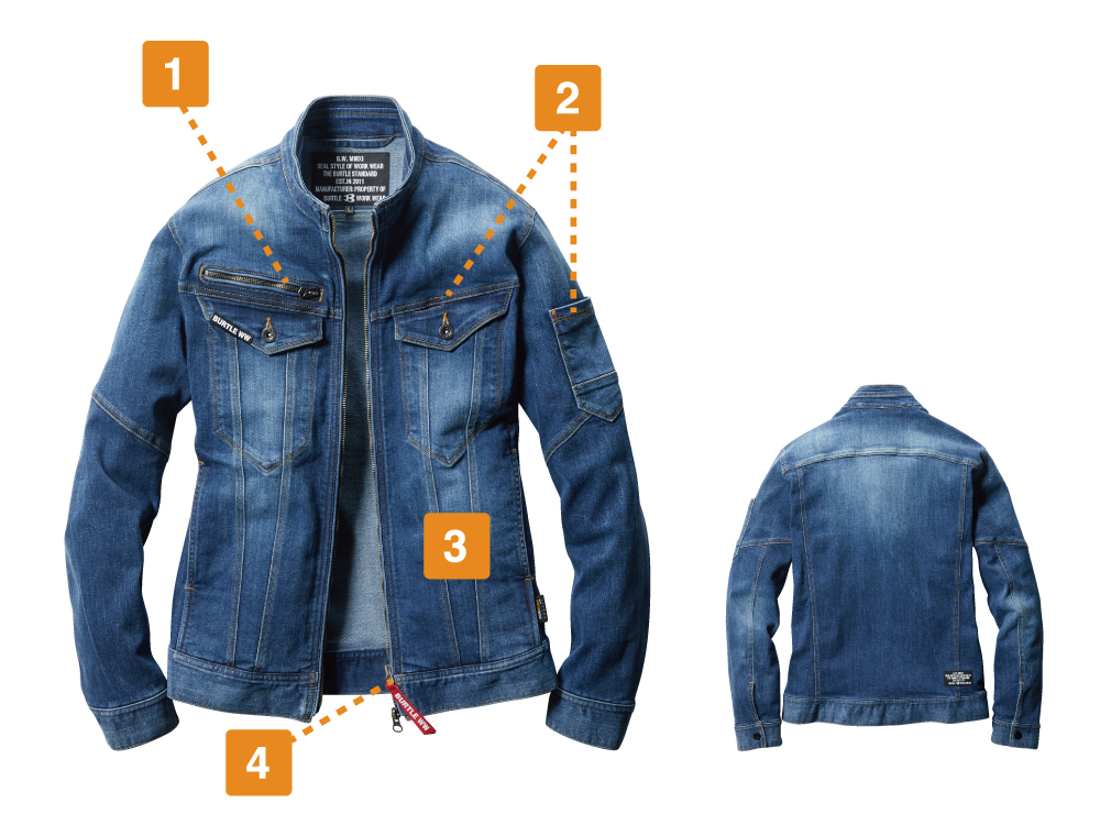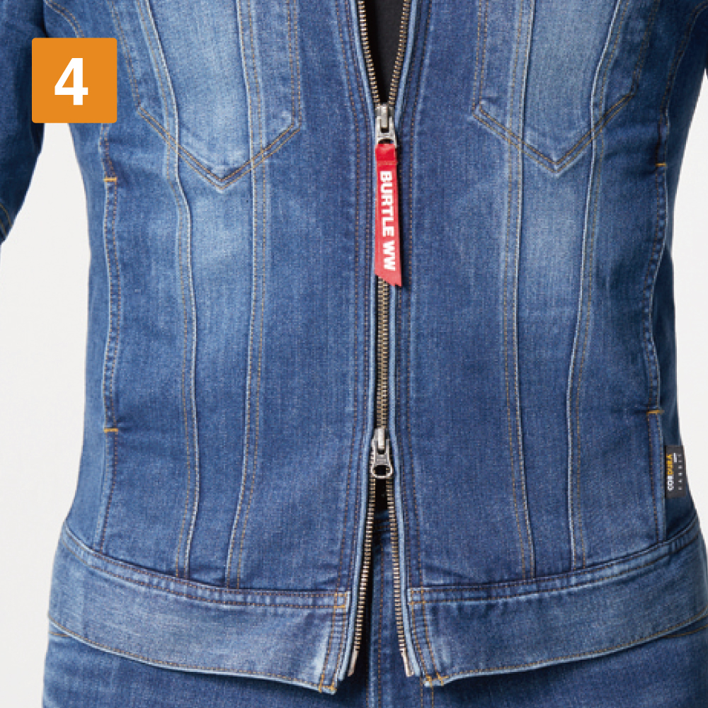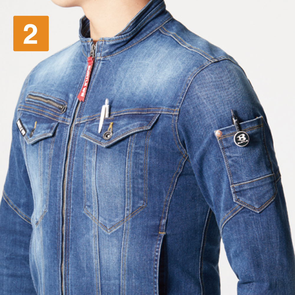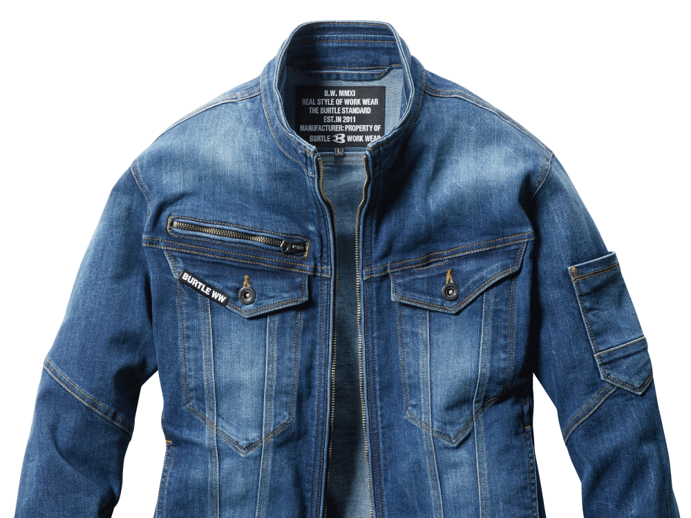 本体生地に使用されているのは、極厚のコーデュラストレッチデニム。綿を混紡することで、デニムらしい生地の味わいが楽しめるのがポイントです。また、スリムなシルエットながら、優れたストレッチ性能を備えて作業性をアップ。伸長率27%の生地が動作への制約を最小限におさえ、自由な動きをアシストします。生地には製品洗い、インディゴにはブラスト加工が施されることで、さらにこなれた質感に。バートルらしく、カッコよさをとことん追求したウェアです。