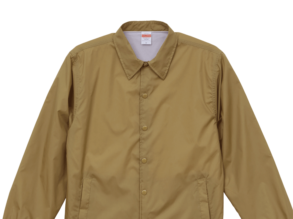 シンプルで気軽に羽織れるコーチジャケット。金属製のアメリカンタイプのドットボタンが採用され、シンプルな中のおしゃれなアクセントとして、カジュアルな印象をプラスしています。生地にもこだわり、表地はナイロンの100%タフタ生地を使用。なめらかでほどよい光沢を持ち、コーチジャケットらしく高級感のある仕上がりになっています。また、保温性にも優れており、裏地の胴体部分にはトリコットの起毛素材が配置されることで、体温を逃がしにくくなっています。