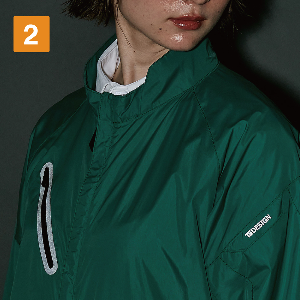 軽量生地を使用し、体への負荷を感じさせない着心地が魅力のジャケットです。生地に使用されている高密度ナイロンは、しなやかで高い耐久性と防風性を備えた素材。さらに、撥水性を持つことで、屋外での着用にも対応可能です。また、ディテールにもこだわり、ファスナーを上まで閉めても金具が顔に接触しにくいグルーブネック仕様で、ノンストレスな着用を実現しています。袖口と裾はバインダー仕様になっており、体にやさしくフィット。すっきりとしたルックスを作るとともに、物がひっかかるリスクを低減しています。