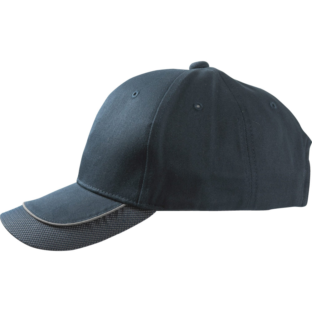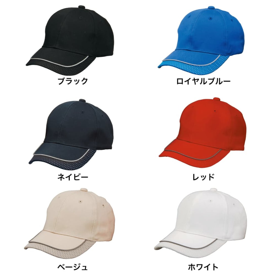 他に無い庇のデザインが特徴のキャップです。反射素材部分はグレー色になっており、どのカラーのキャップにもマッチしております。こちらのキャップはフロントへの刺繍がお勧めです。
